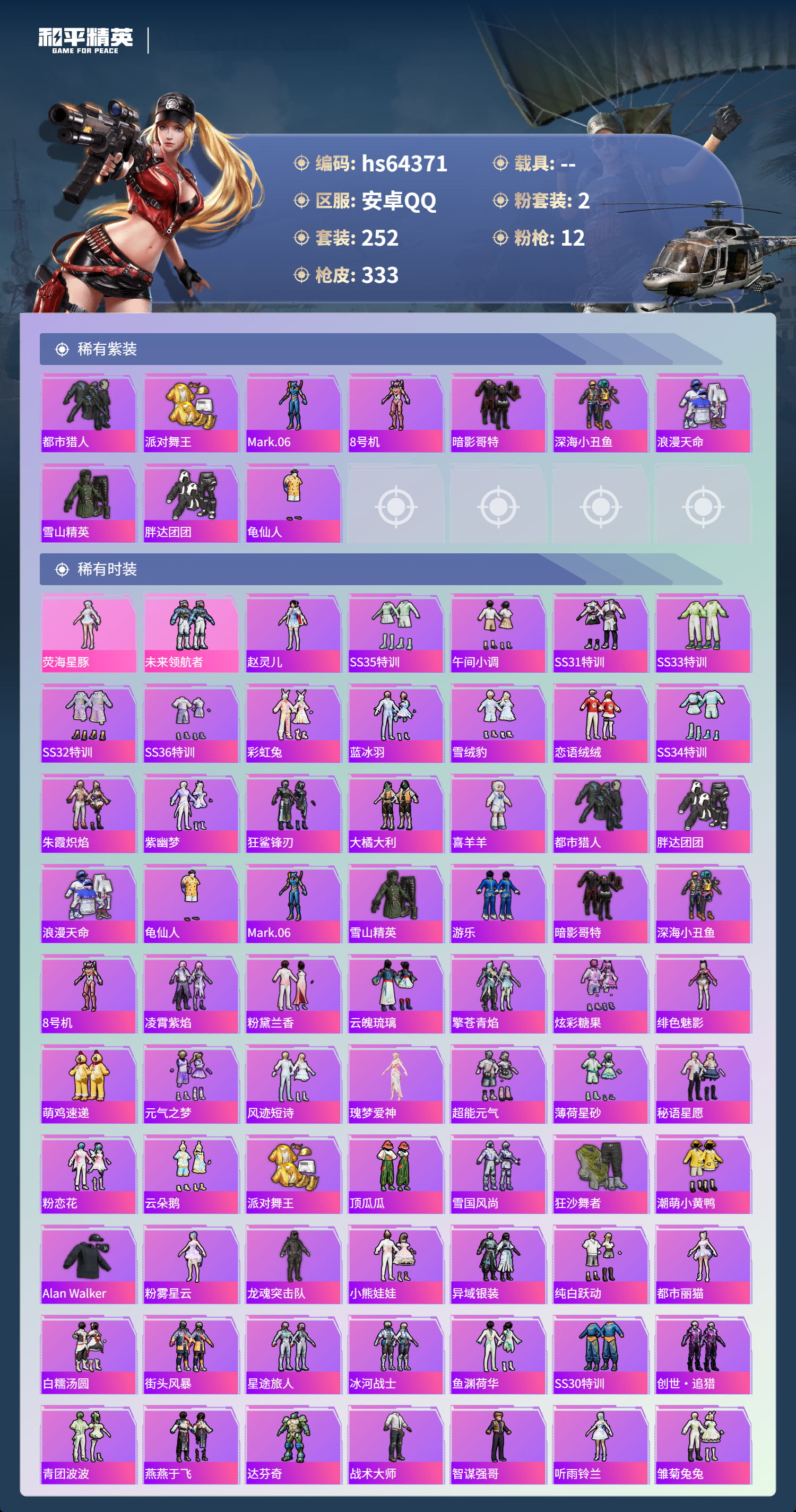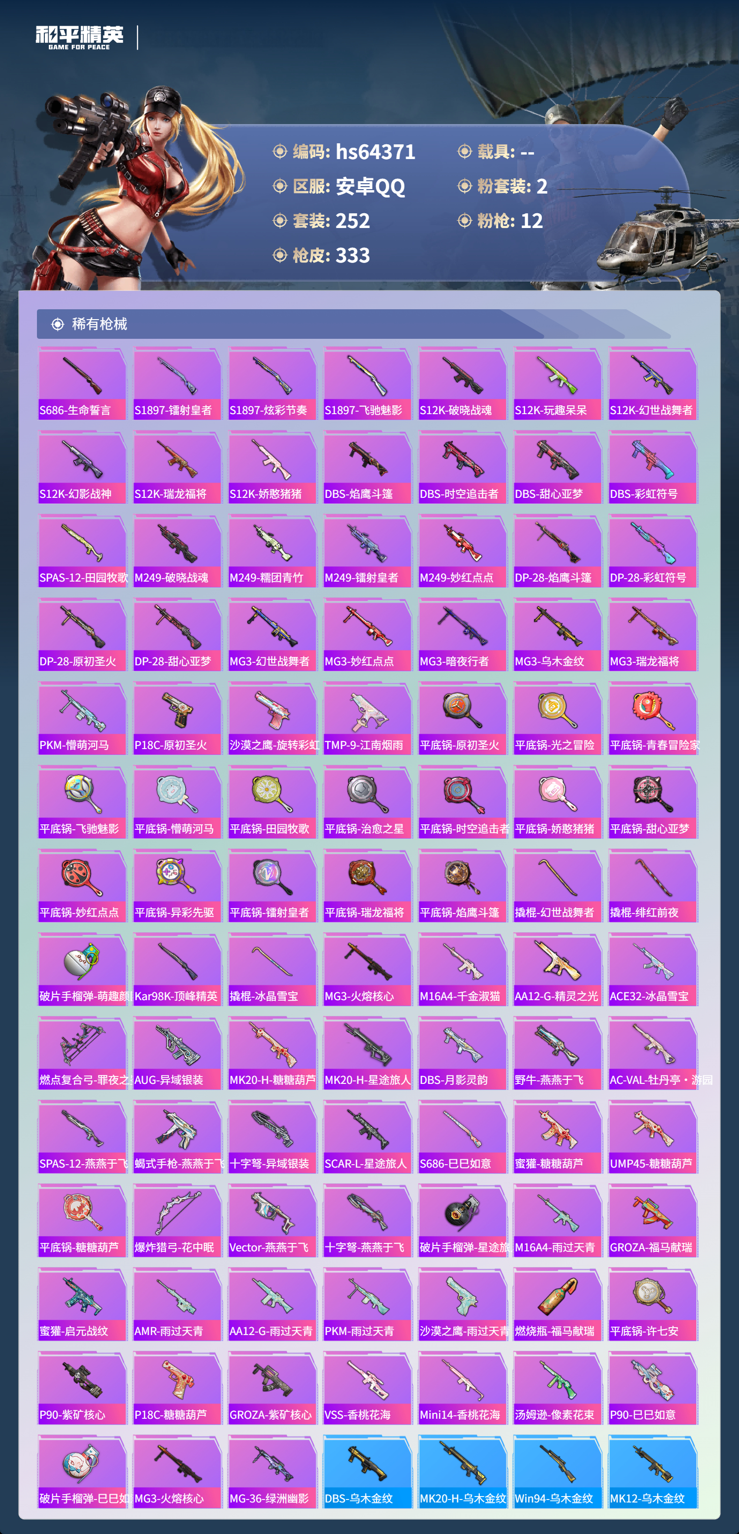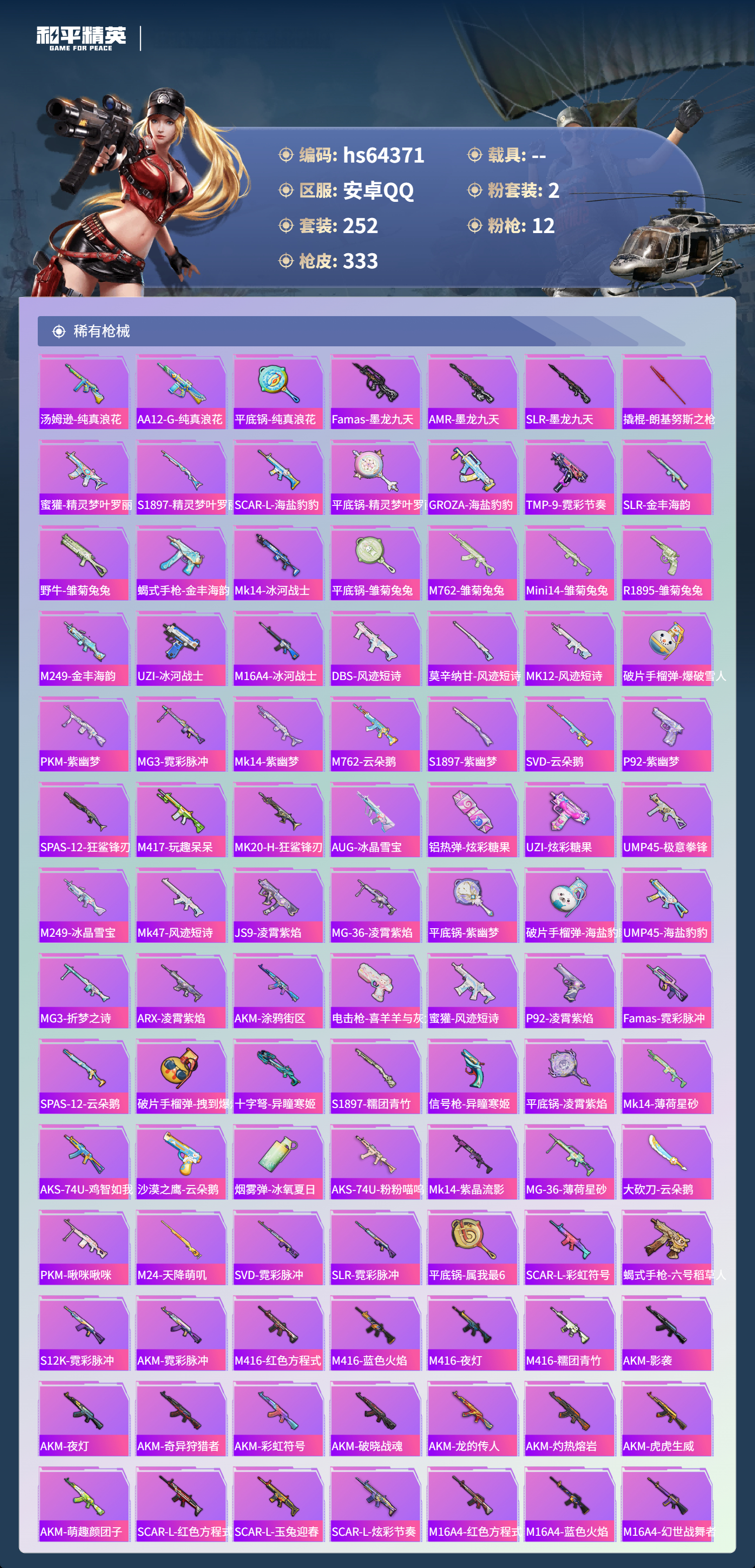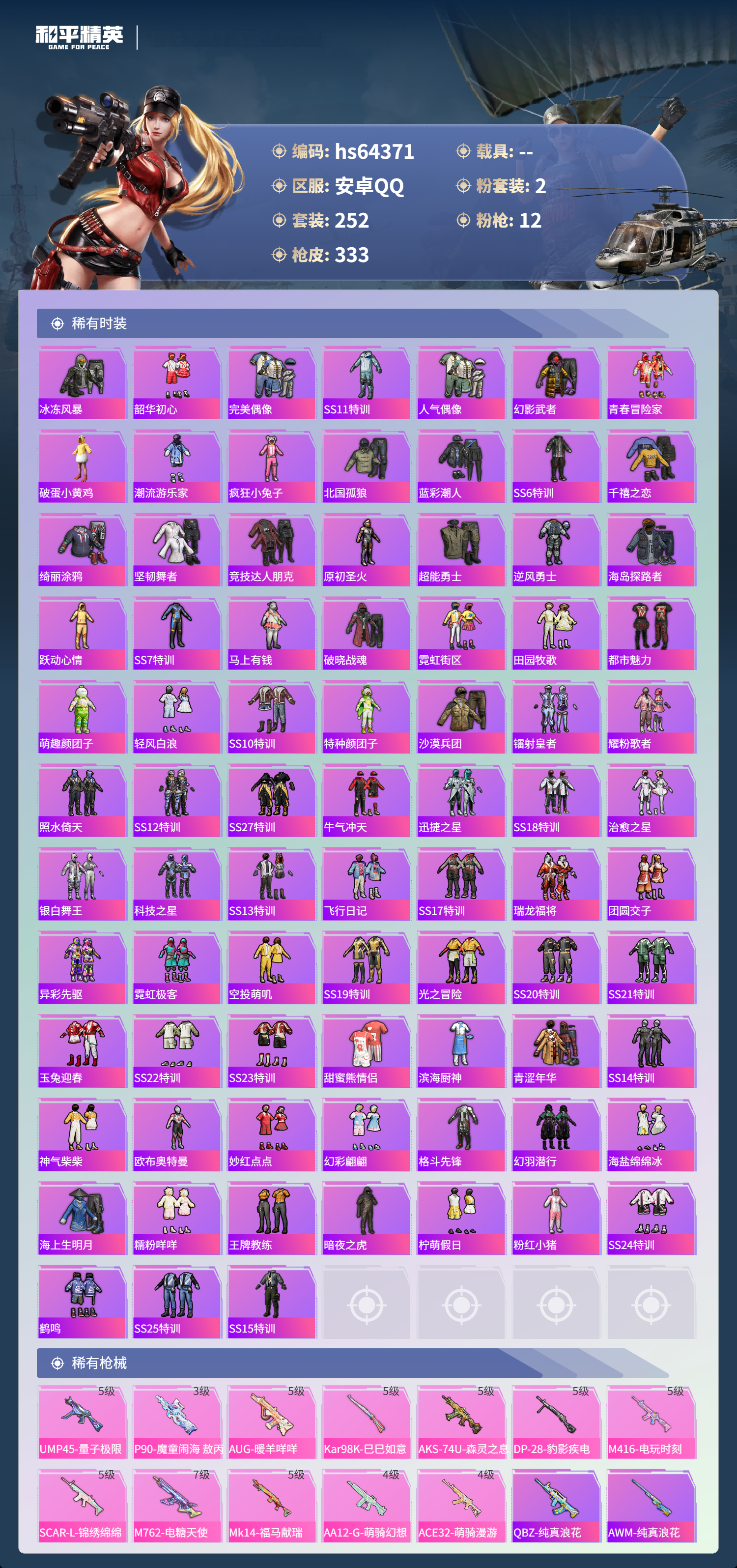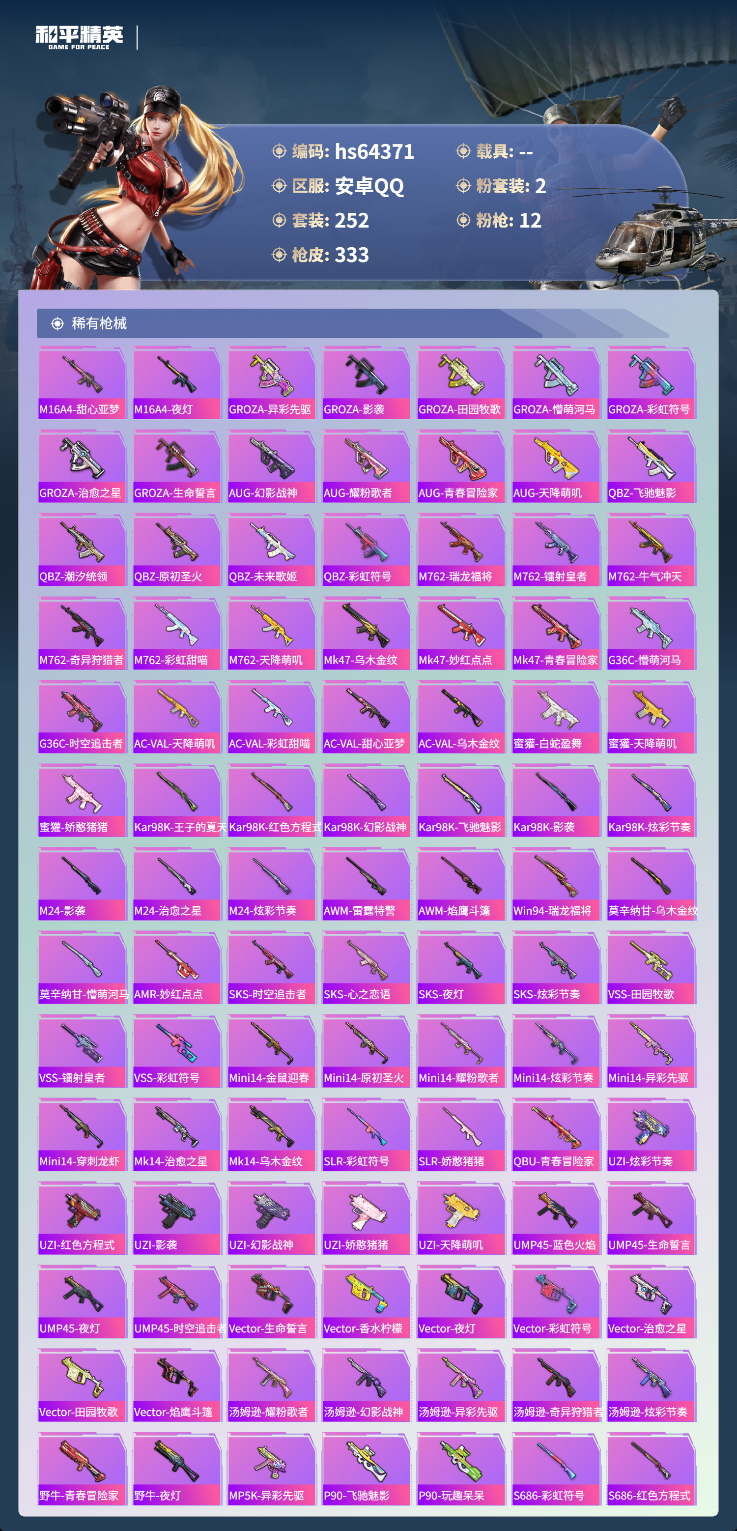 hs64371 安卓手Q-18王牌印记-2粉装-12特效枪-热力值-252套装-333枪皮-7卓越印记-1传奇印记