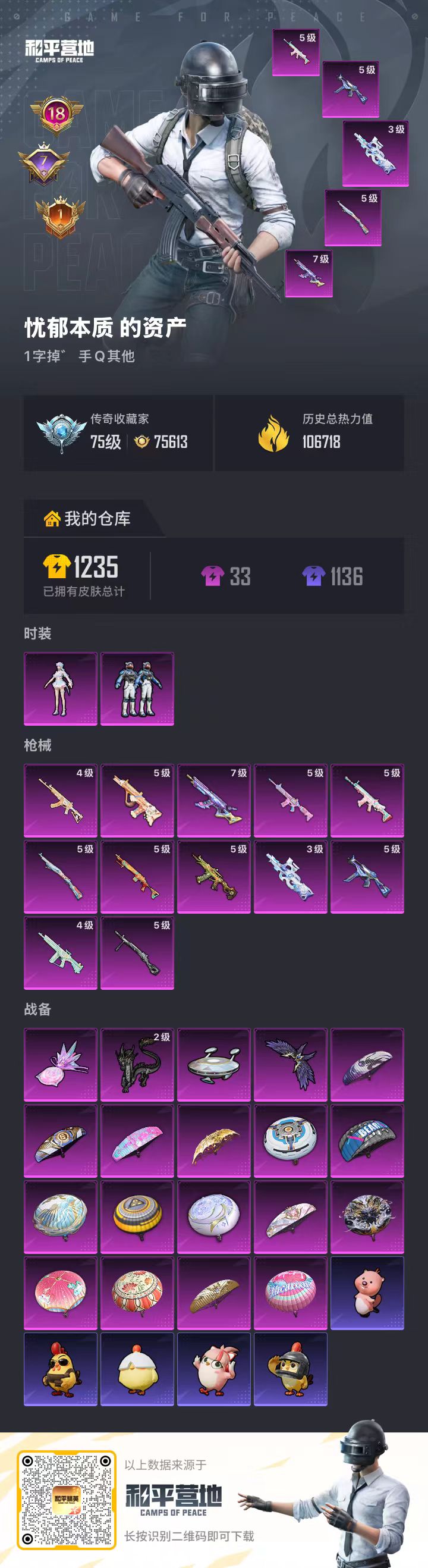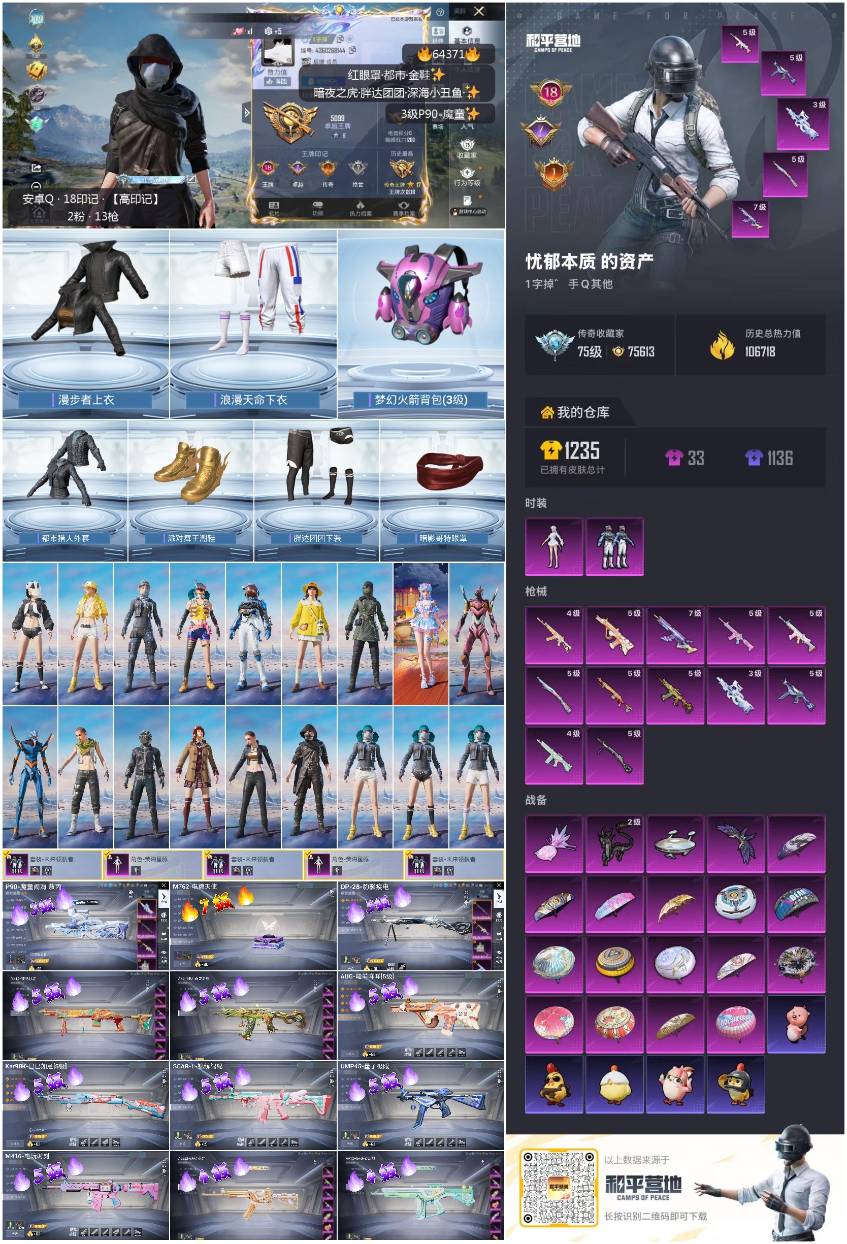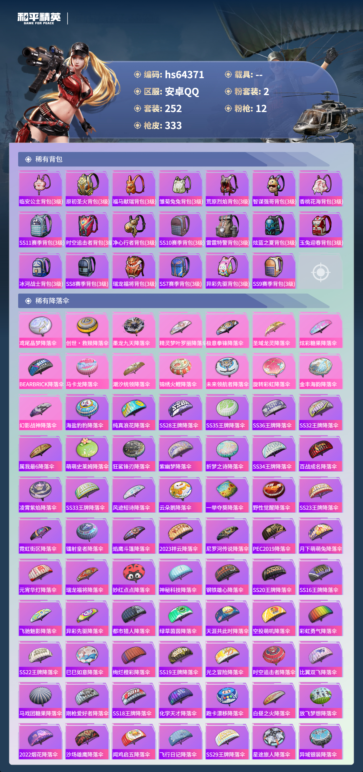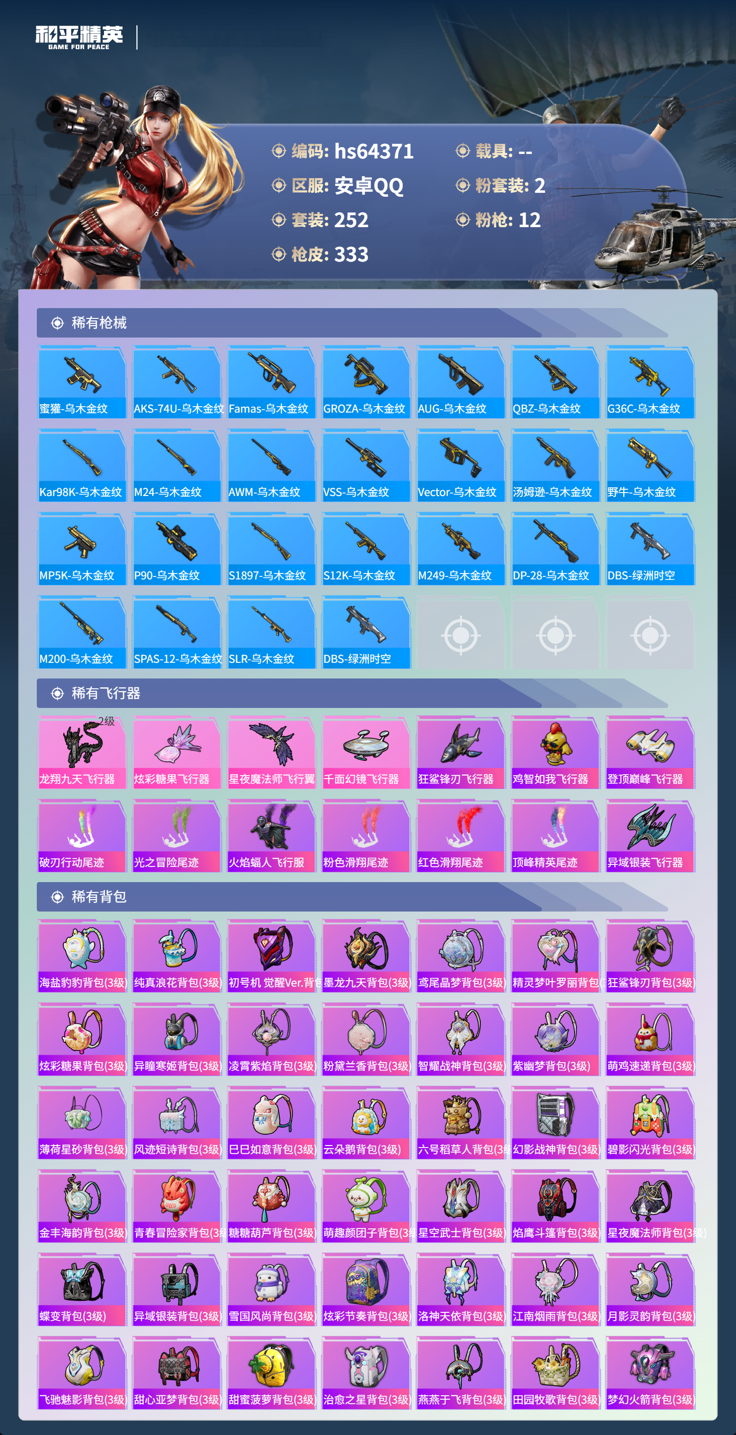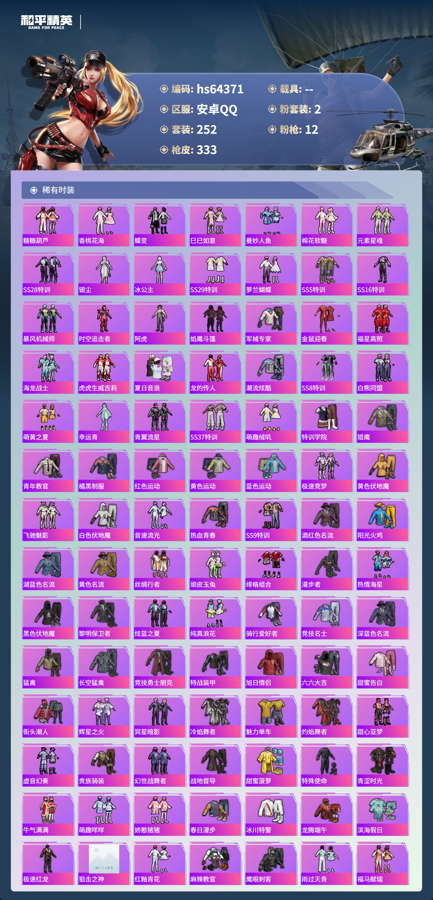 hs64371 安卓手Q-18王牌印记-2粉装-12特效枪-热力值-252套装-333枪皮-7卓越印记-1传奇印记
