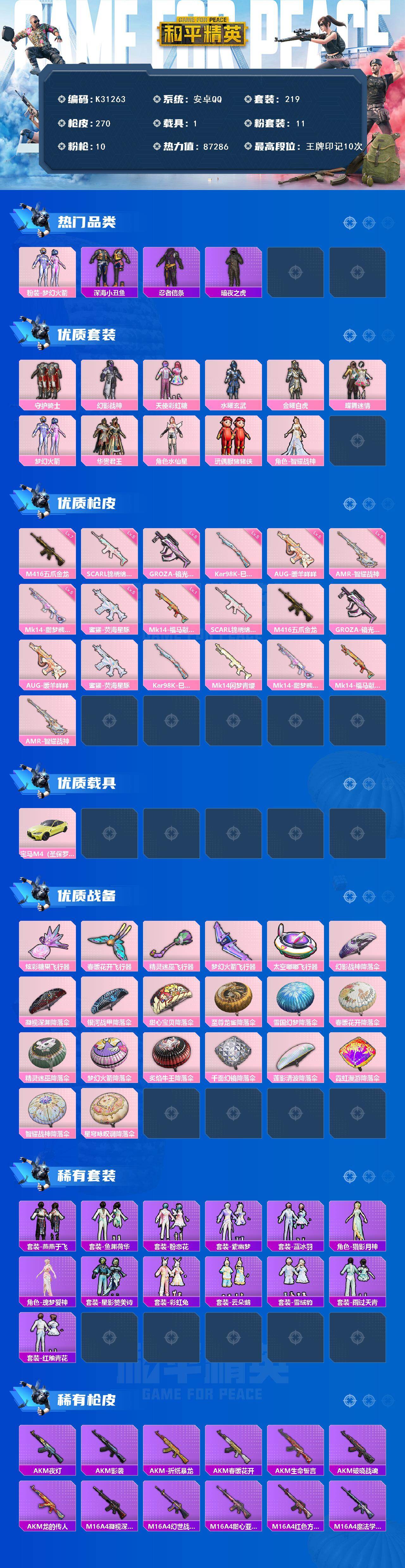 安卓 手Q-11粉装-10特效枪-1载具-5粉色飞行器-87286热力值-10王牌印记-219套装-270枪皮
