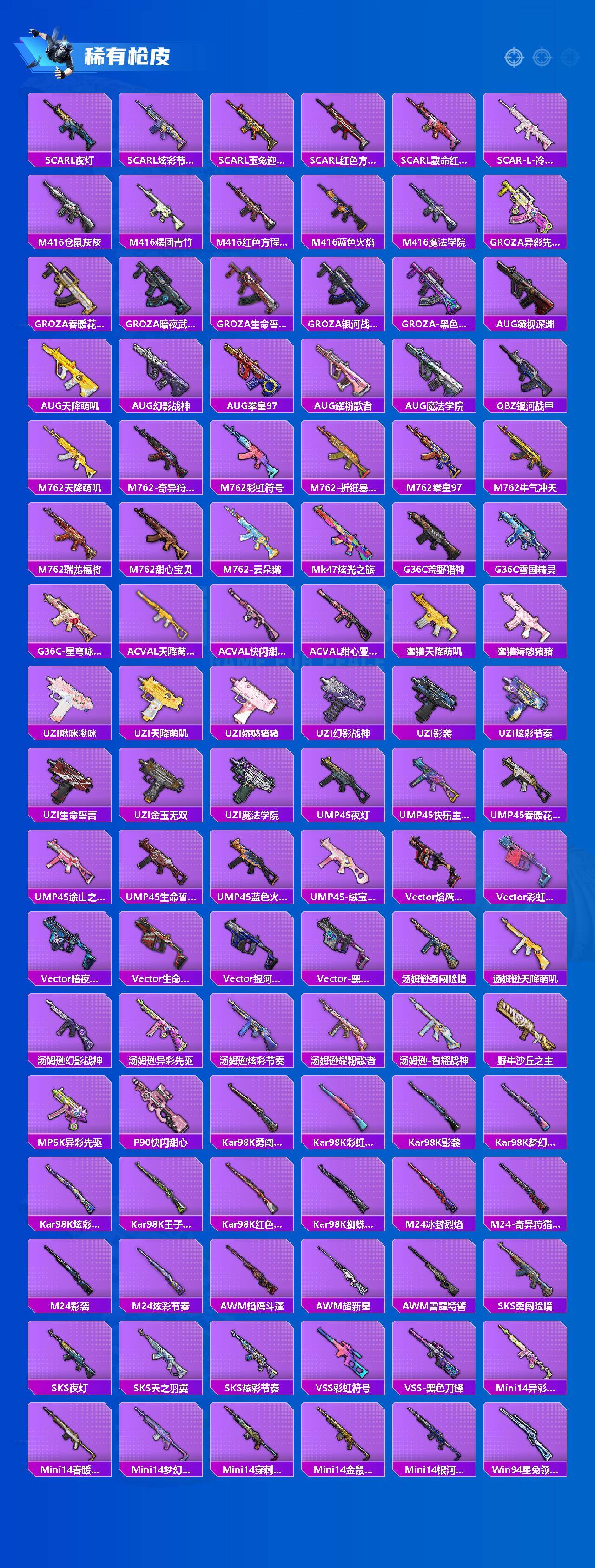【粉色枪皮等级】:SCAR-L-锦绣绵绵(五级),M416-五爪金龙(七级),GROZA-镜光银凌(五级),AUG-暖