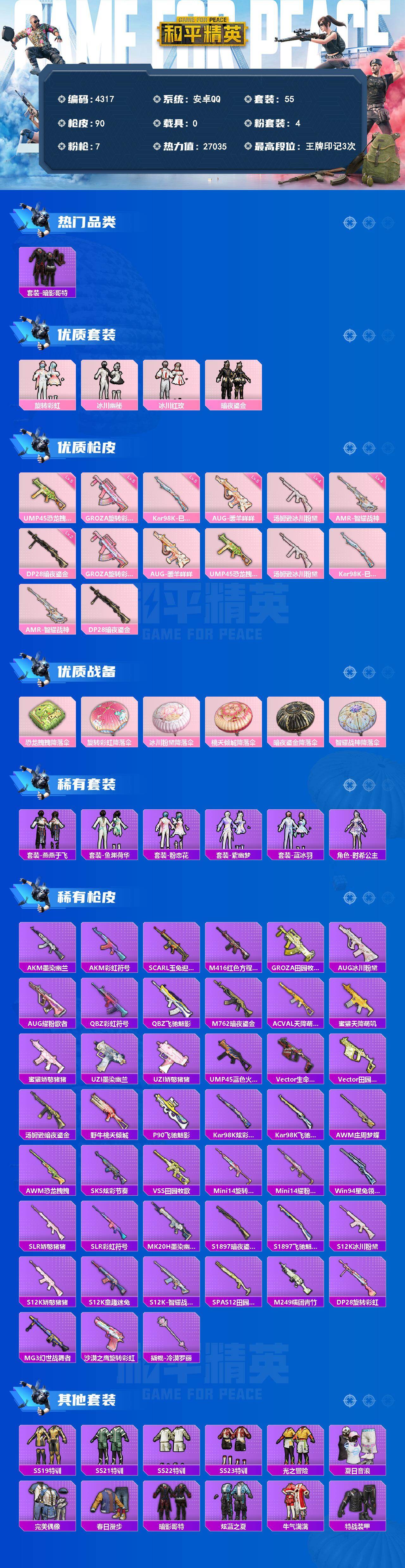 安卓 手Q-4粉装-7特效枪-0载具-0粉色飞行器-27035热力值-3王牌印记-55套装-90枪皮