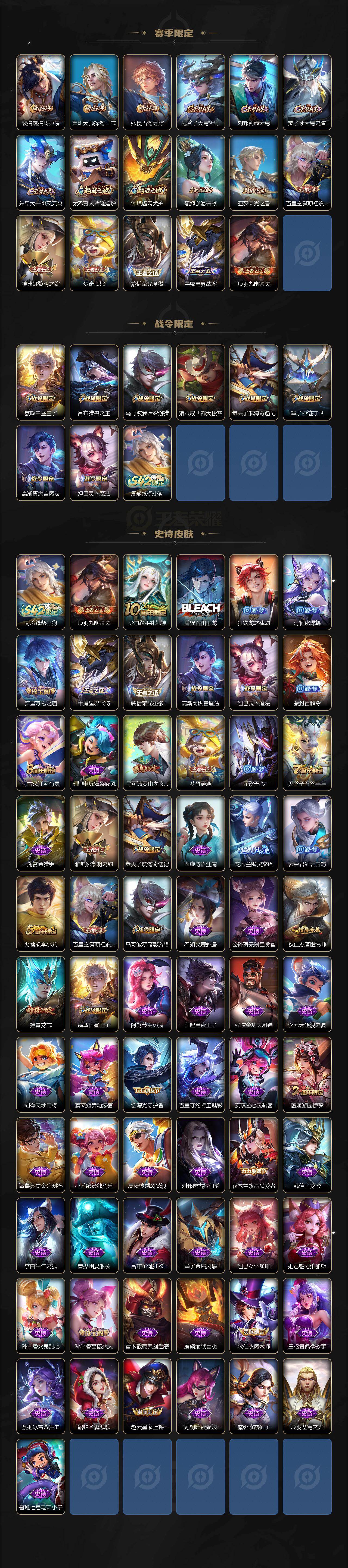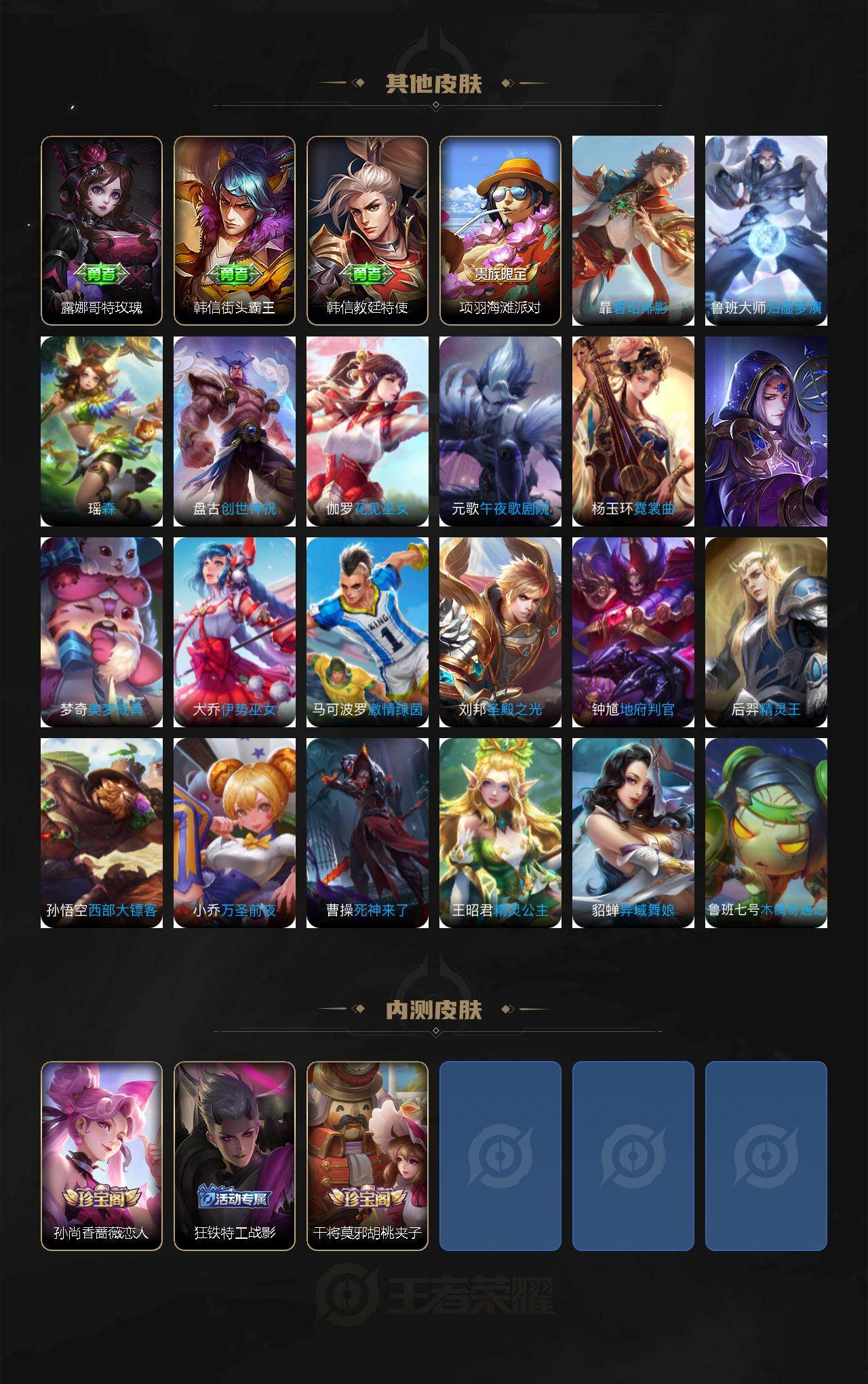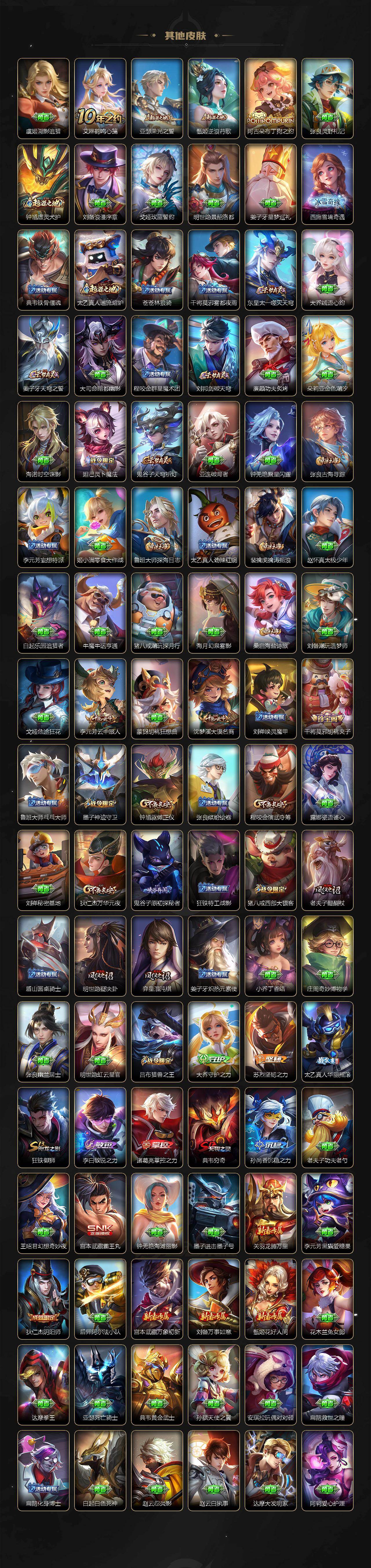 【传说皮肤】:云缨神骥越千峰,王昭君长夜焕生,杨玉环星之鸣奏,女娲愿照千秋盛,妲己愿照众生和,虞姬愿照岁时盈,云缨幻光神枪,王昭君映山客,桑启鸣野蒿,孙尚香乘龙问璇玑,夏洛特浮生妄,干将莫邪久胜战神,后羿黄金射手座,貂蝉仲夏夜之梦,宫本武藏地狱之眼
