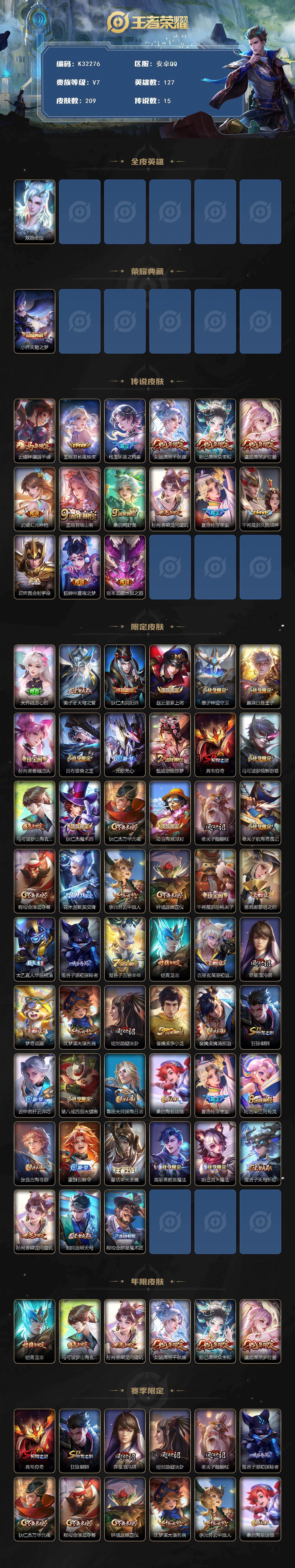 安卓Q-V7-最强王者段位-127英雄-209皮肤-1典藏皮肤-15传说-65史诗