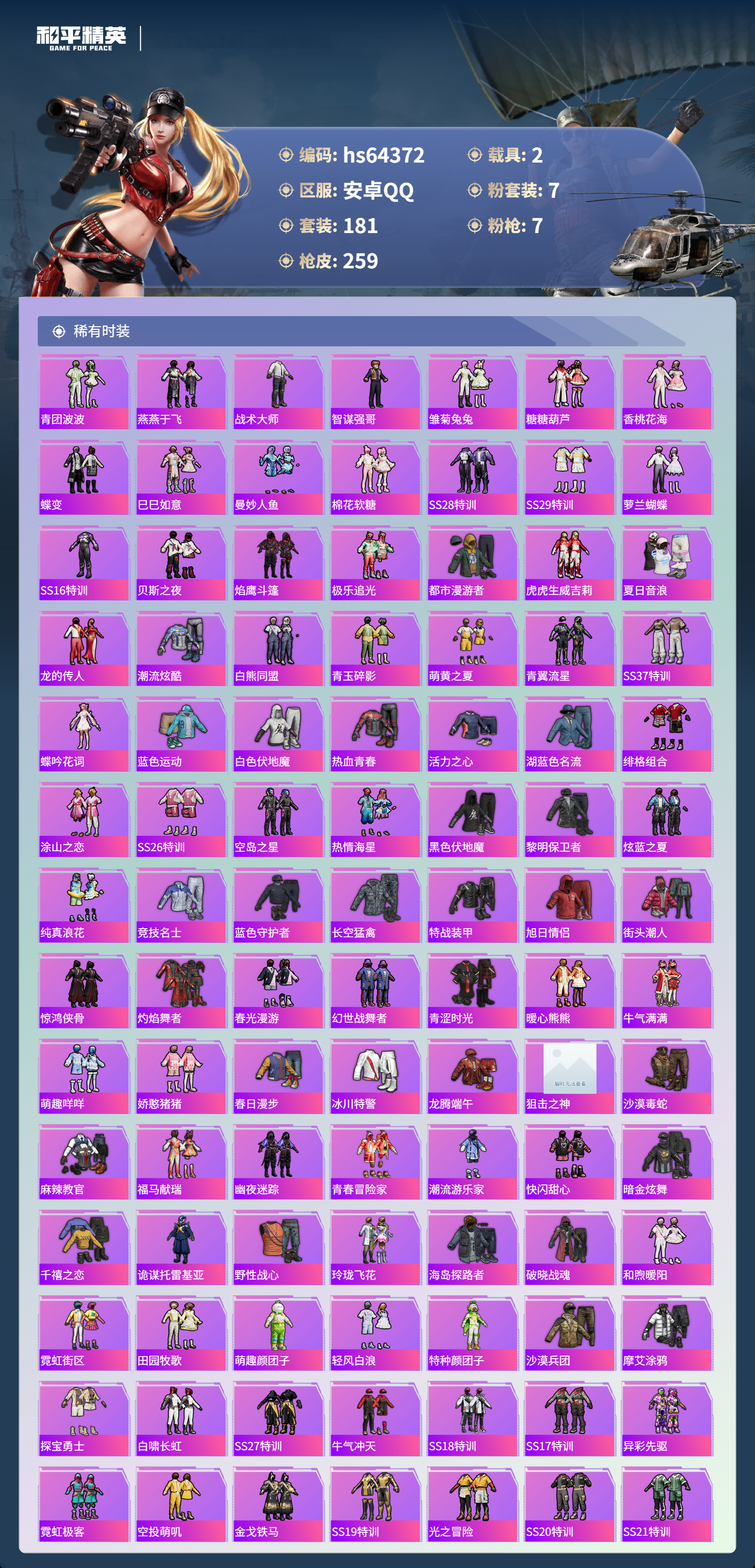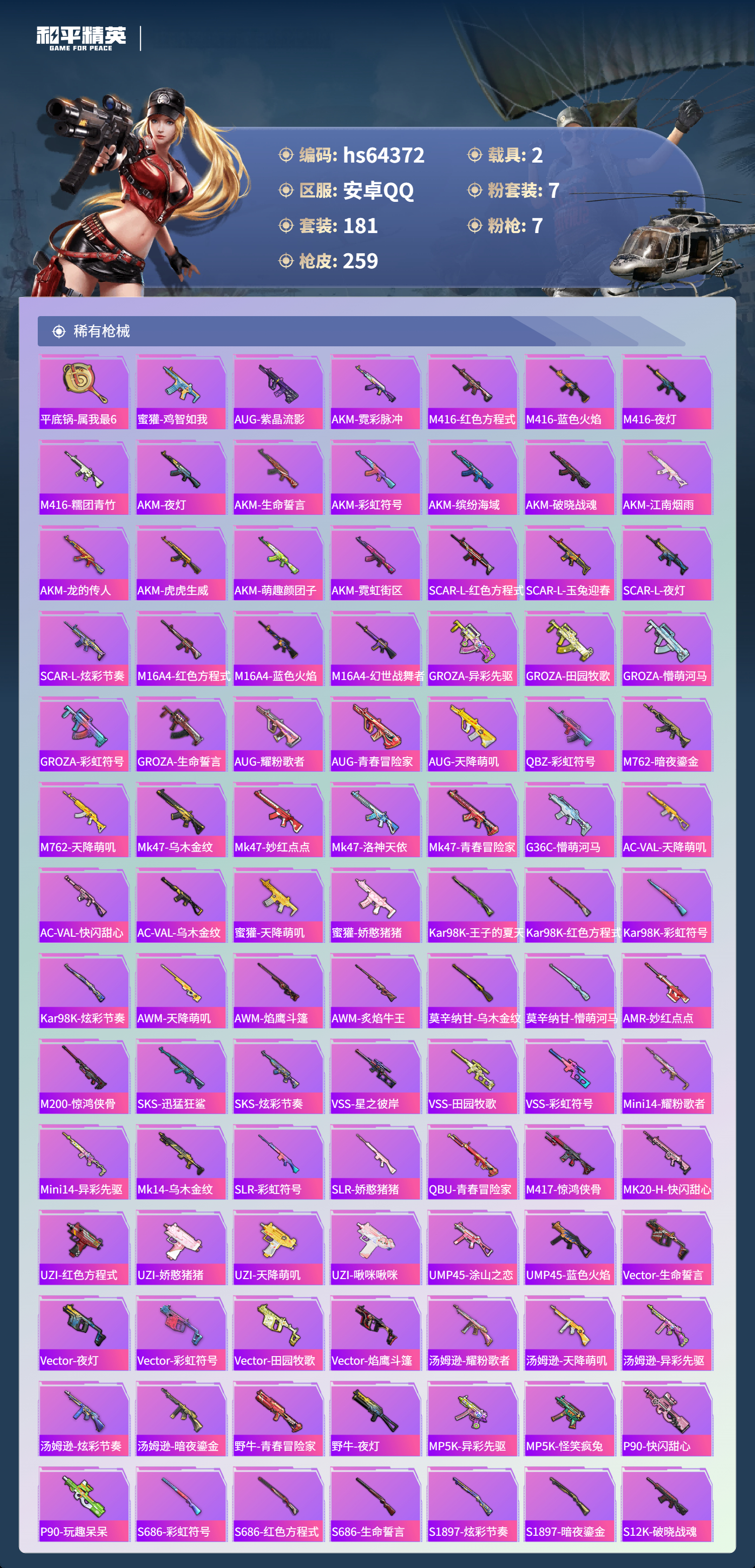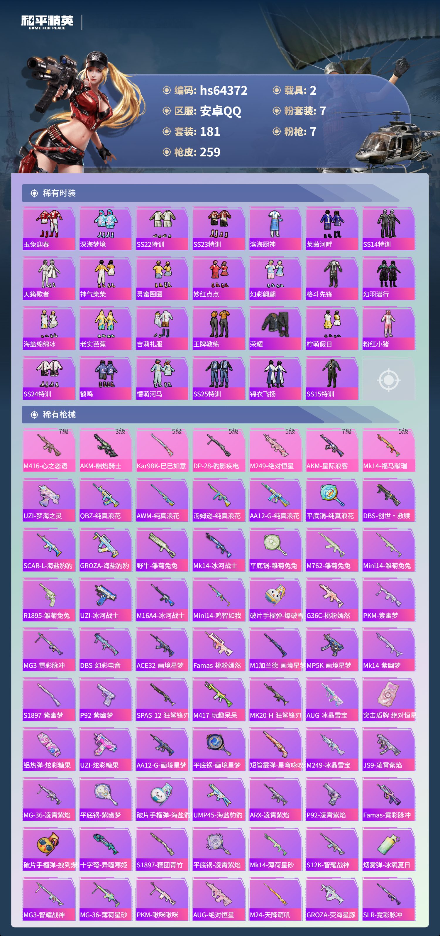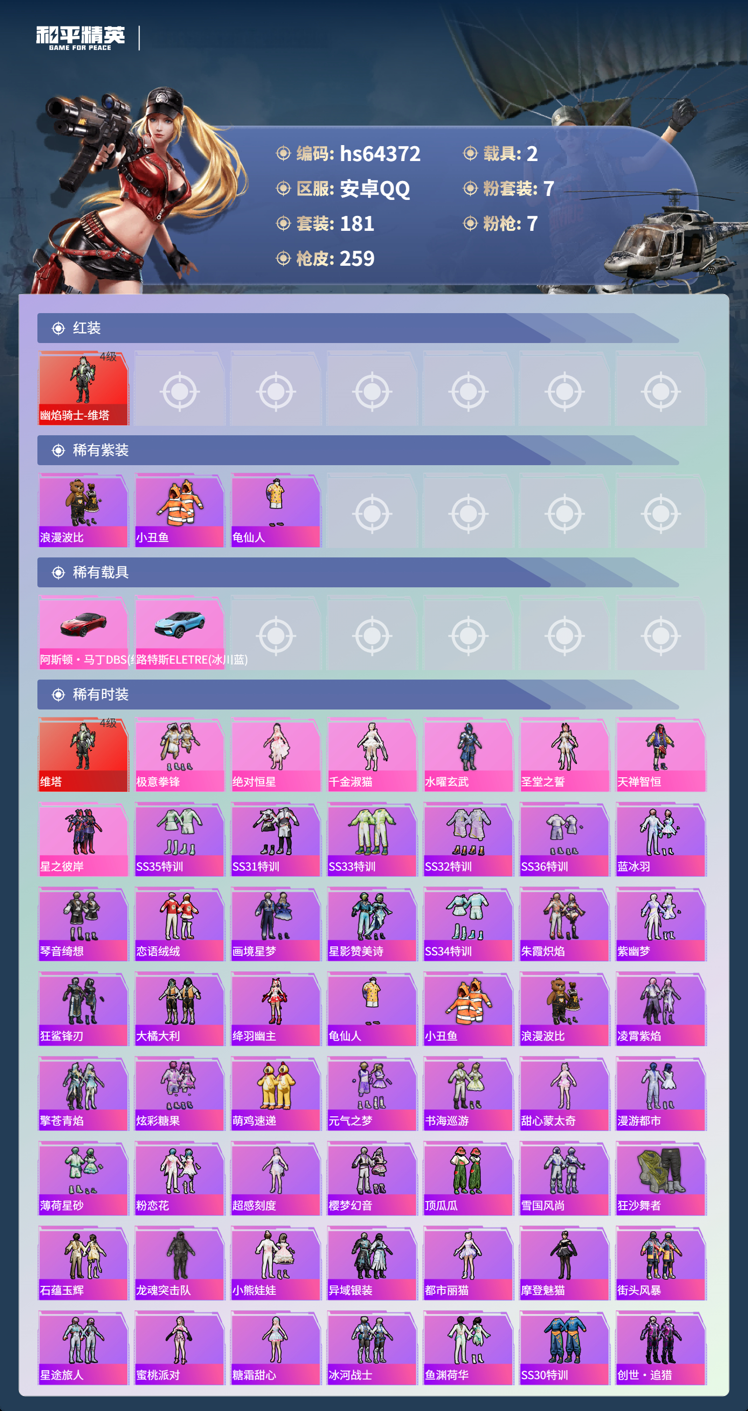 hs64372 安卓手Q-17王牌印记-1红装-7粉装-7特效枪-2载具-88333热力值-181套装-259枪皮-5卓越印记