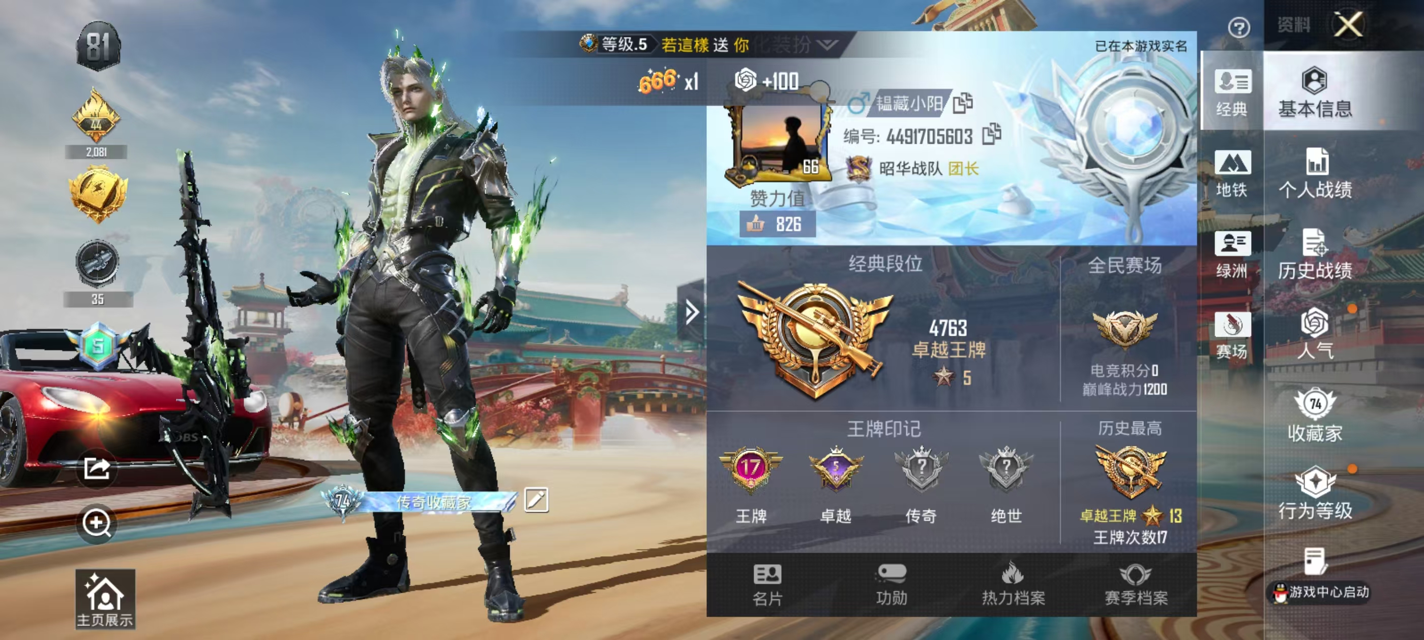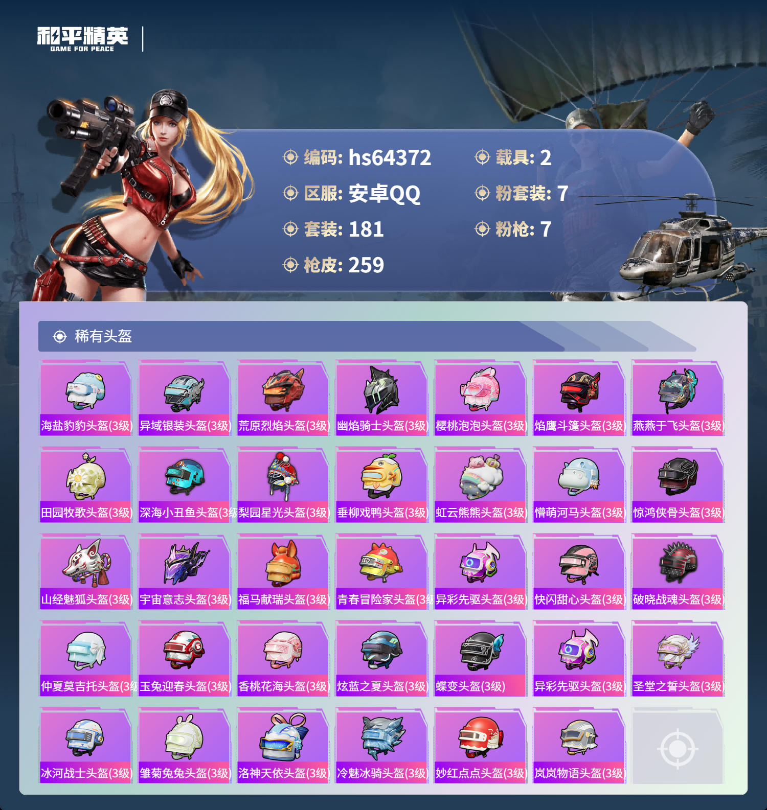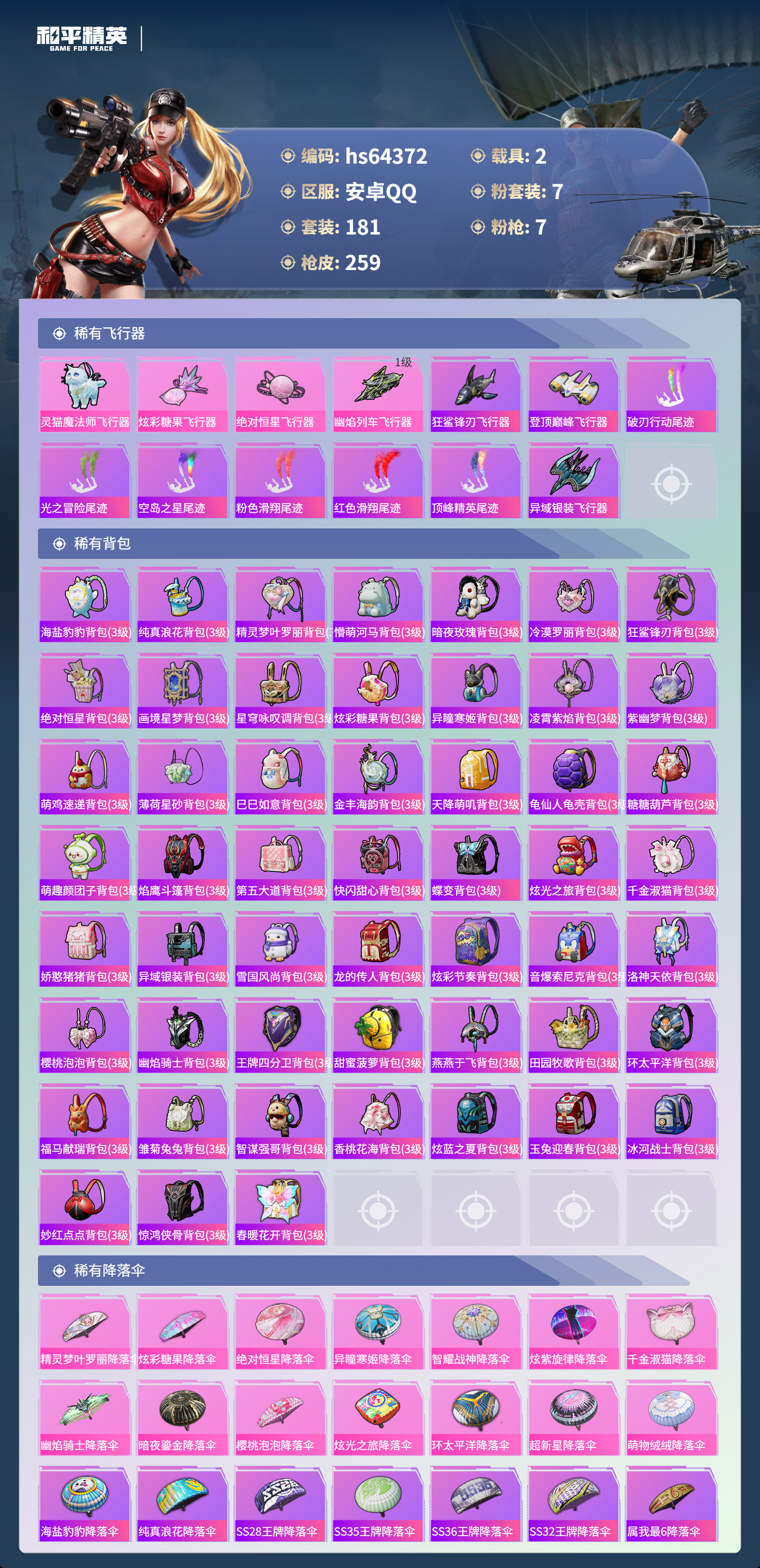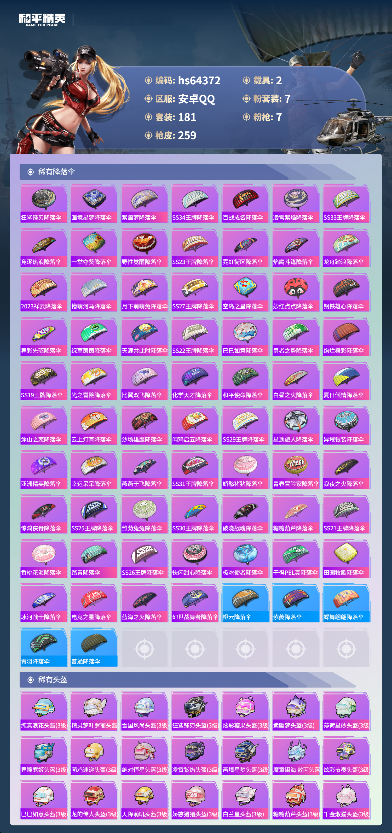 hs64372 安卓手Q-17王牌印记-1红装-7粉装-7特效枪-2载具-88333热力值-181套装-259枪皮-5卓越印记