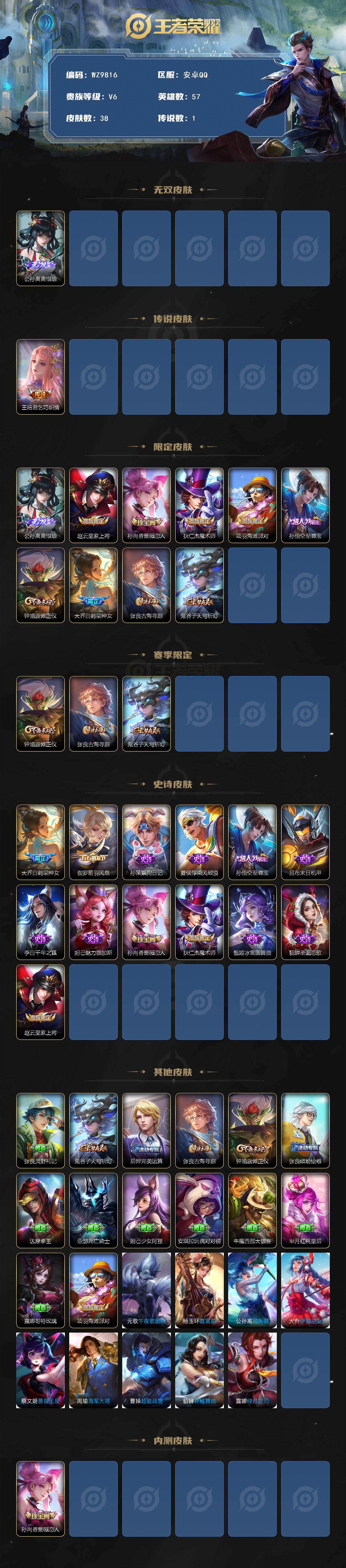 安卓Q-V6-秩序白银II段位-57英雄-38皮肤-1无双-1传说-13史诗