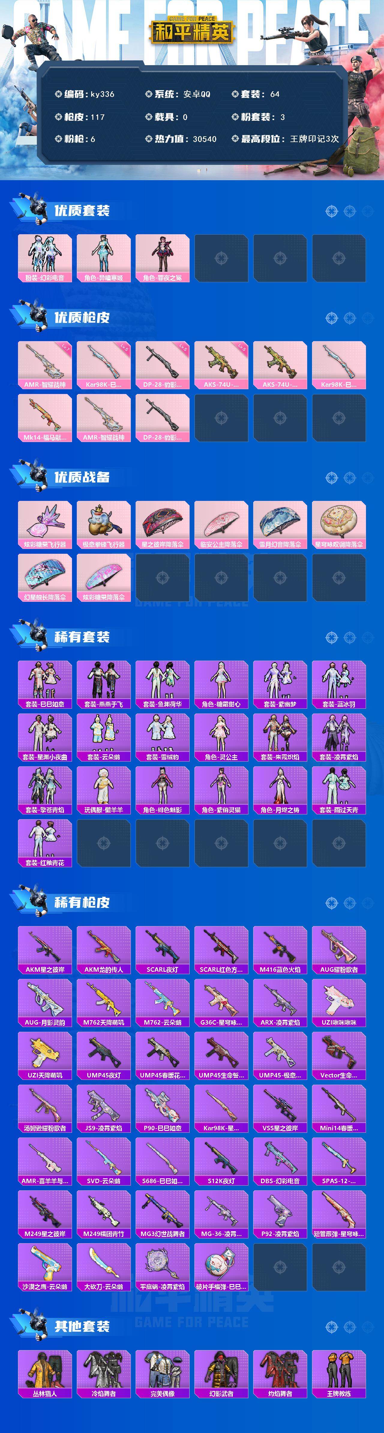 安卓 手Q-3粉装-6特效枪-0载具-2粉色飞行器-30540热力值-3王牌印记-64套装-117枪皮