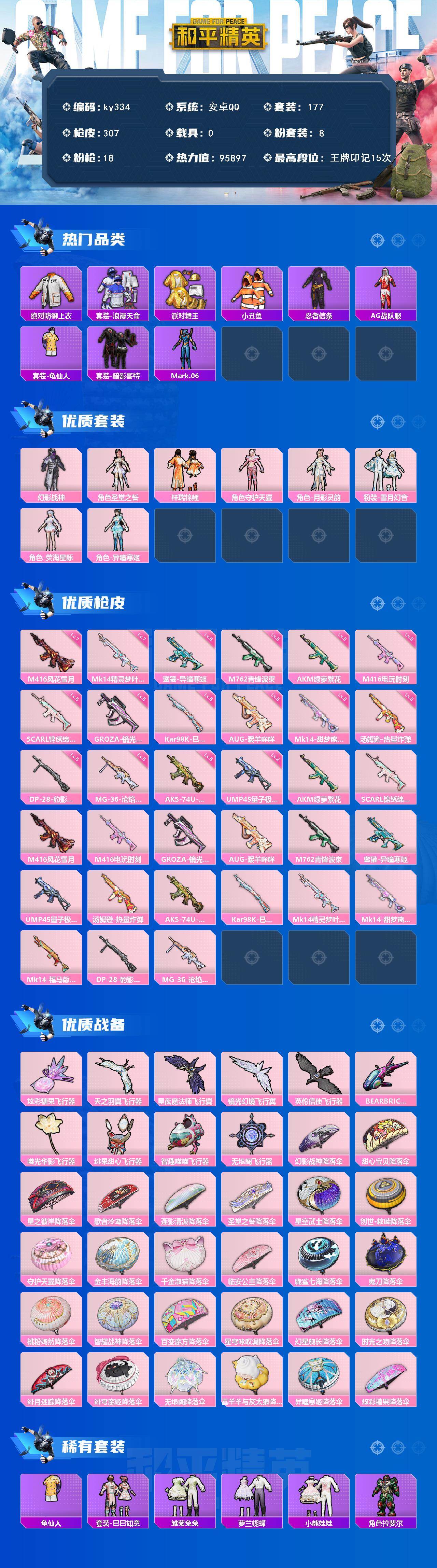 安卓 手Q-8粉装-18特效枪-0载具-10粉色飞行器-95897热力值-15王牌印记-177套装-307枪皮
