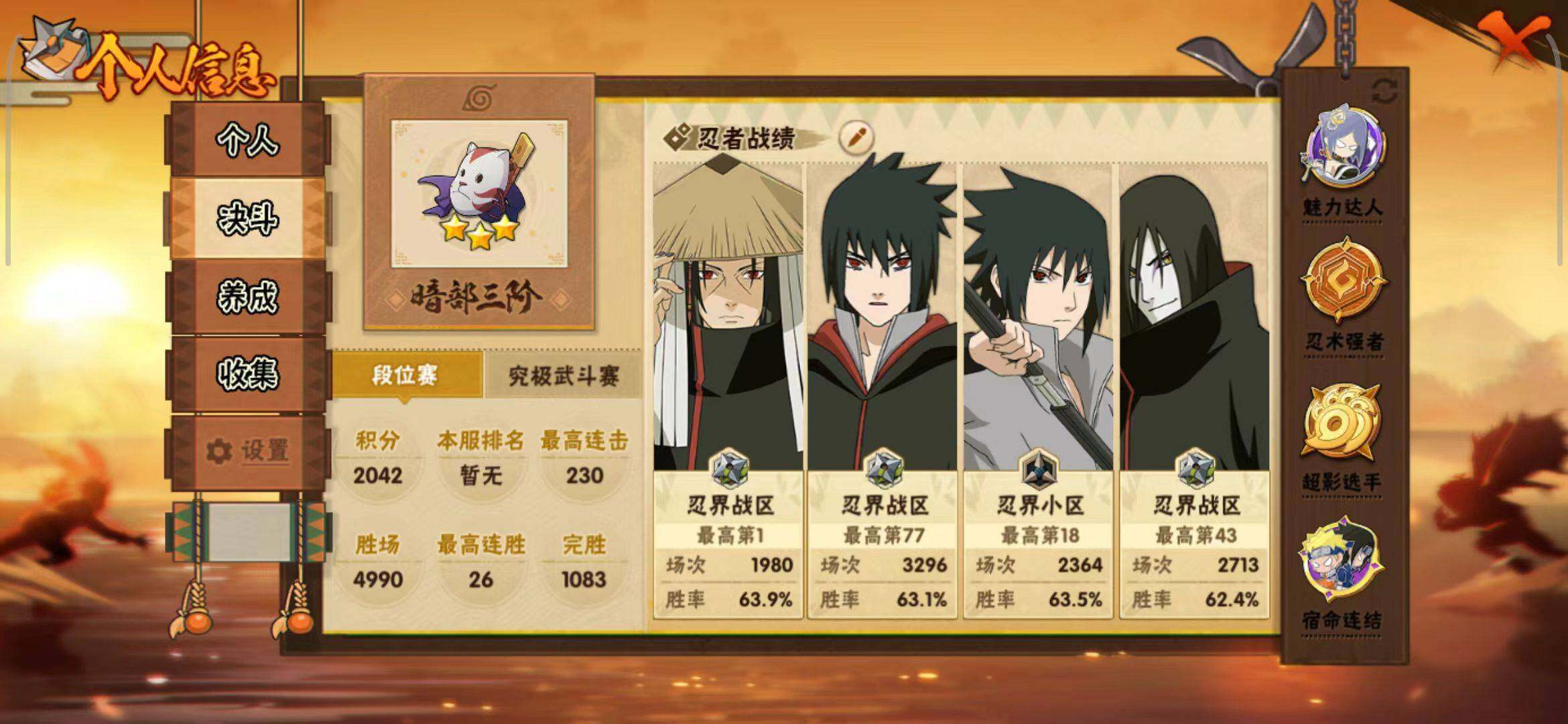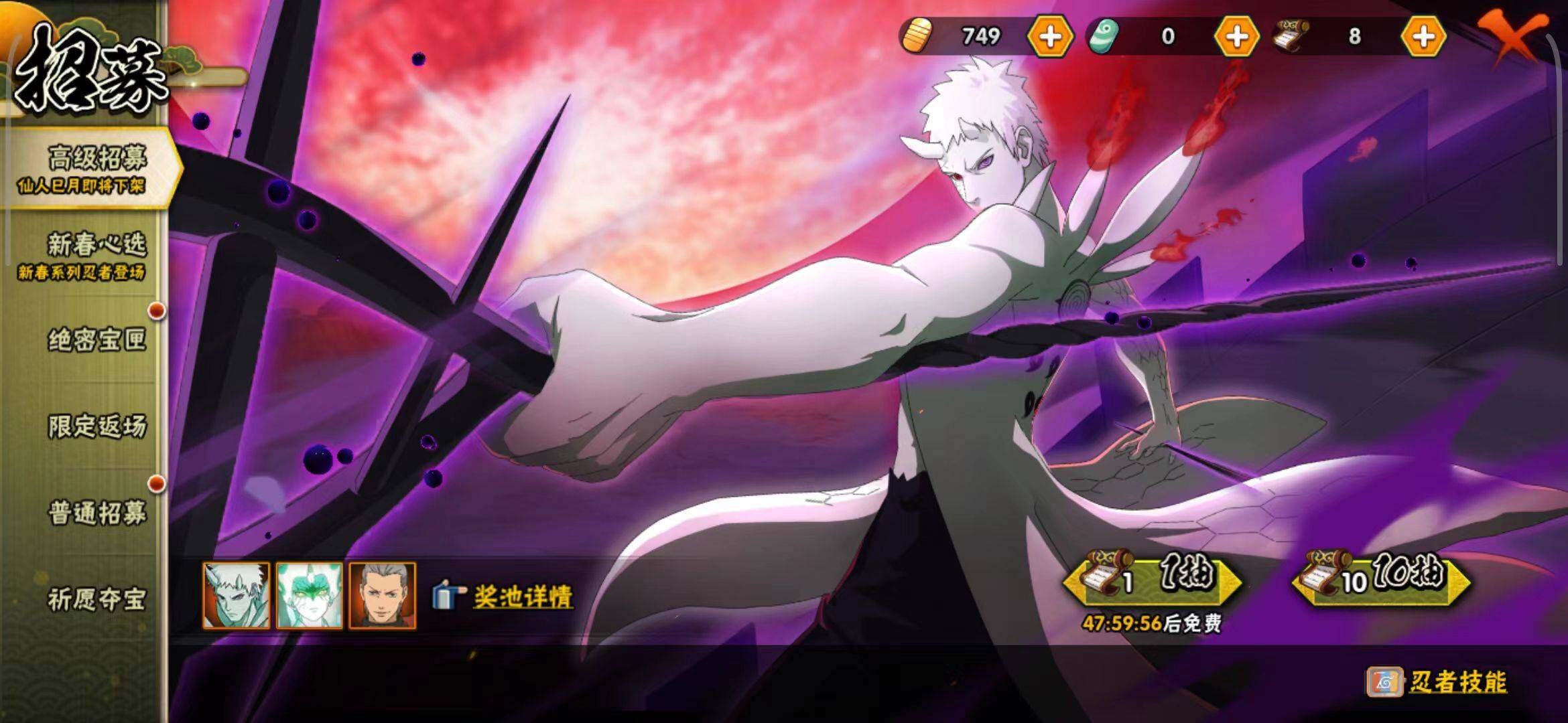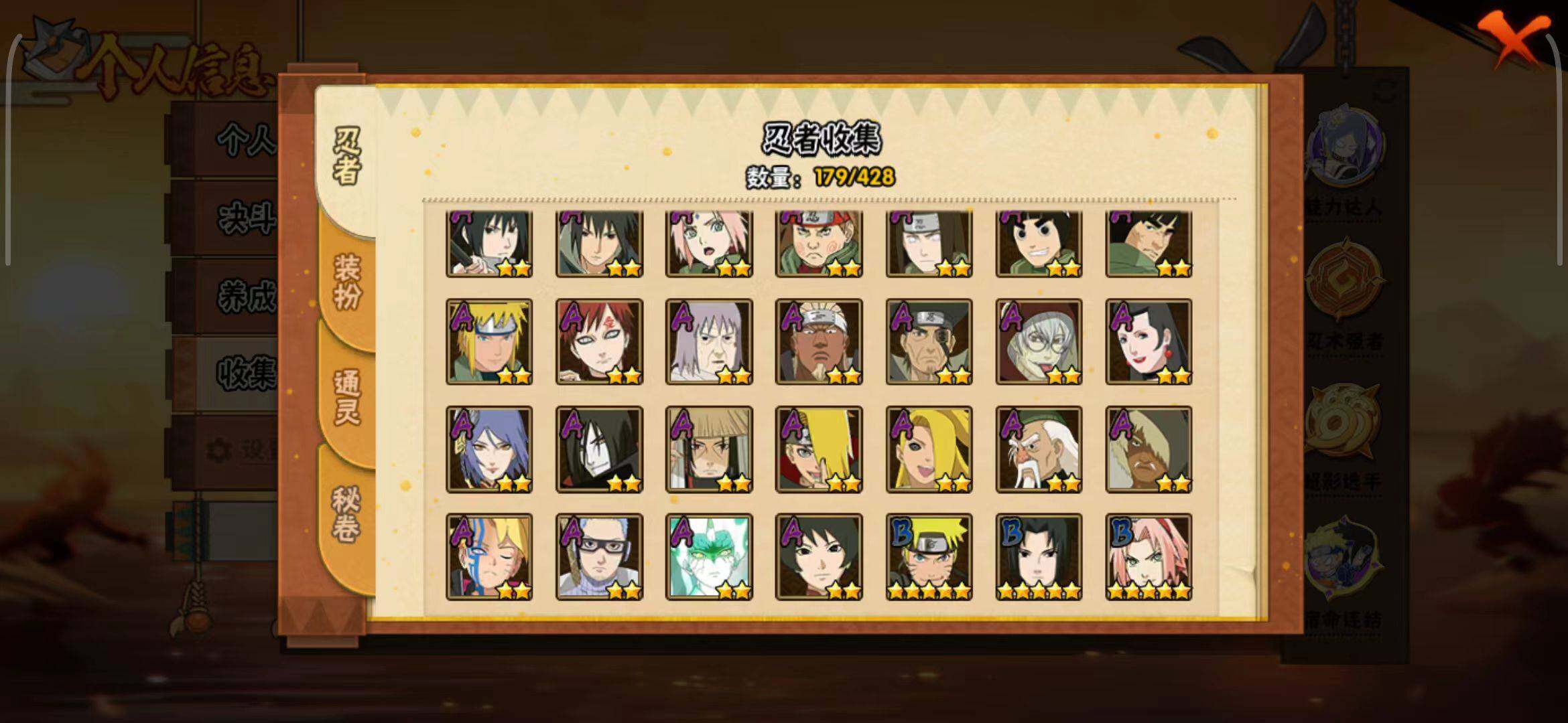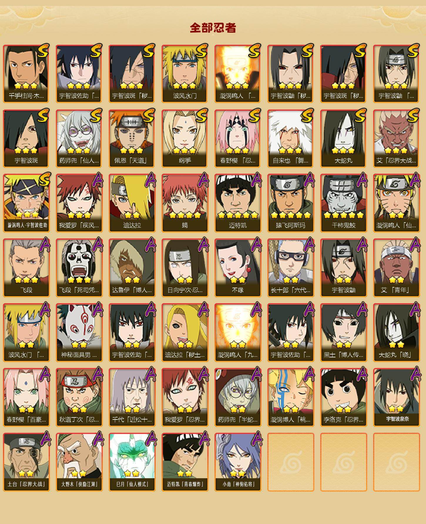 【S级忍者】:宇智波鼬「秽土转生」(3星),宇智波斑「秽土转生」(3星),宇智波斑「秽土转生·解」(3星),春野樱「忍界大战」(3星),艾「忍界大战」(3星),宇智波鼬「须佐能乎」(3星),千手柱间「木叶创立」(3星),自来也「舞之豪杰」(3星),大蛇丸(3星),纲手(3星),宇智波斑(3星),波风水门(3星),药师兜「仙人模式」(3星),漩涡鸣人「九喇嘛连结」(3星),佩恩「天道」(3星),宇智波佐助「永恒万花筒」(3星),漩涡鸣人·宇智波佐助(3星)
