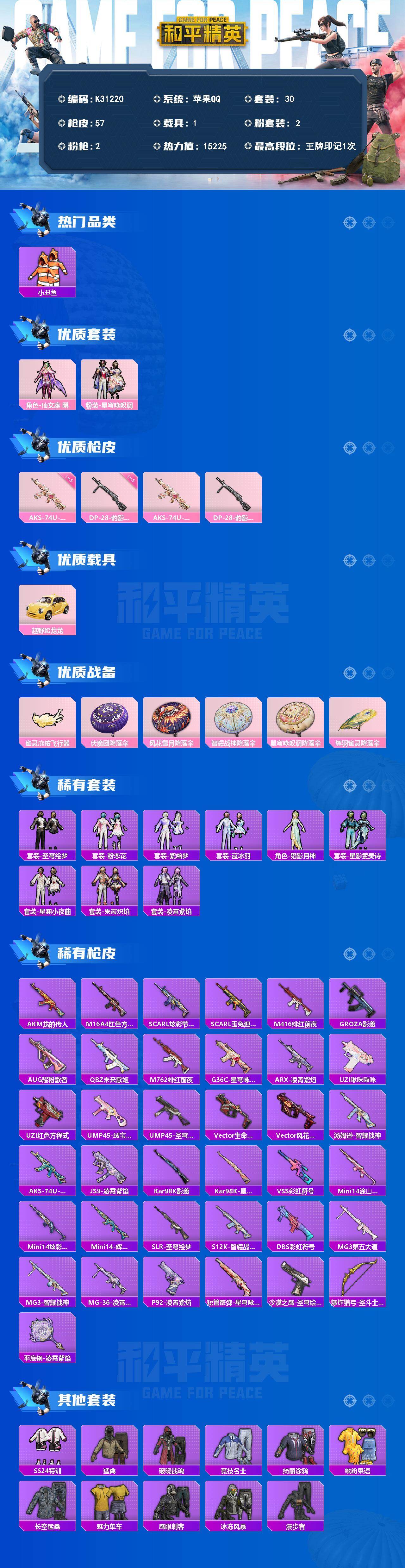 苹果 手Q-2粉装-2特效枪-1载具-1粉色飞行器-15225热力值-1王牌印记-30套装-57枪皮