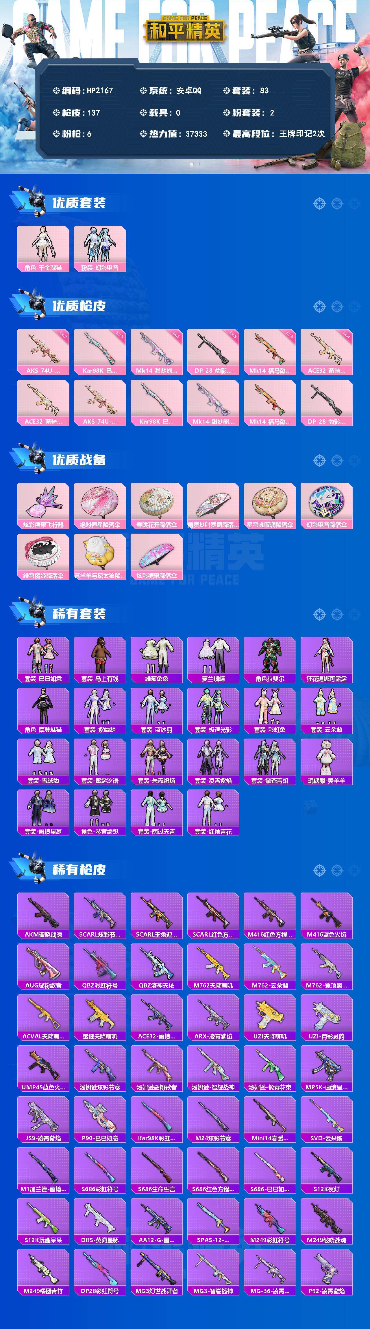 【HP2167】83套装/枪械6/装备150/战备102/王牌印记2/热力值37333/四级ACE32-萌骑漫游/七级AKS-74U-星穹咏叹调/五级Kar98K-巳巳如意/五级Mk14-甜梦熊击/五级Mk14-福马献瑞/五级DP-28-豹影疾电/角色-千金淑猫/粉装-幻彩电音/ACE32-萌骑漫游/AKS-74U-星穹咏叹调/Kar98K-巳巳如意/Mk14-甜梦熊击/Mk14-福马献瑞/DP-28-豹影疾电/炫彩糖果飞行器/绝对恒星降落伞/春暖花开降落伞/精灵梦叶罗丽降落伞/星穹咏叹调降落伞
