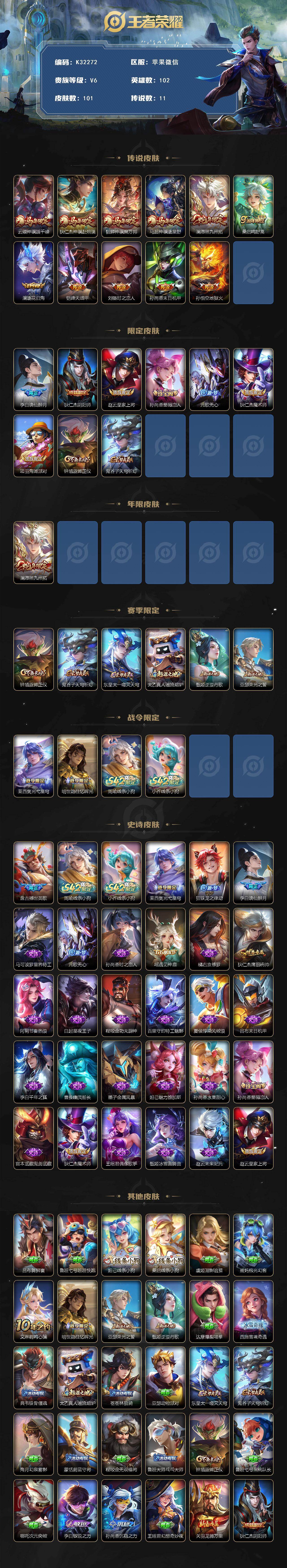 苹果WX-V6-最强王者段位-102英雄-101皮肤-11传说-29史诗【传说