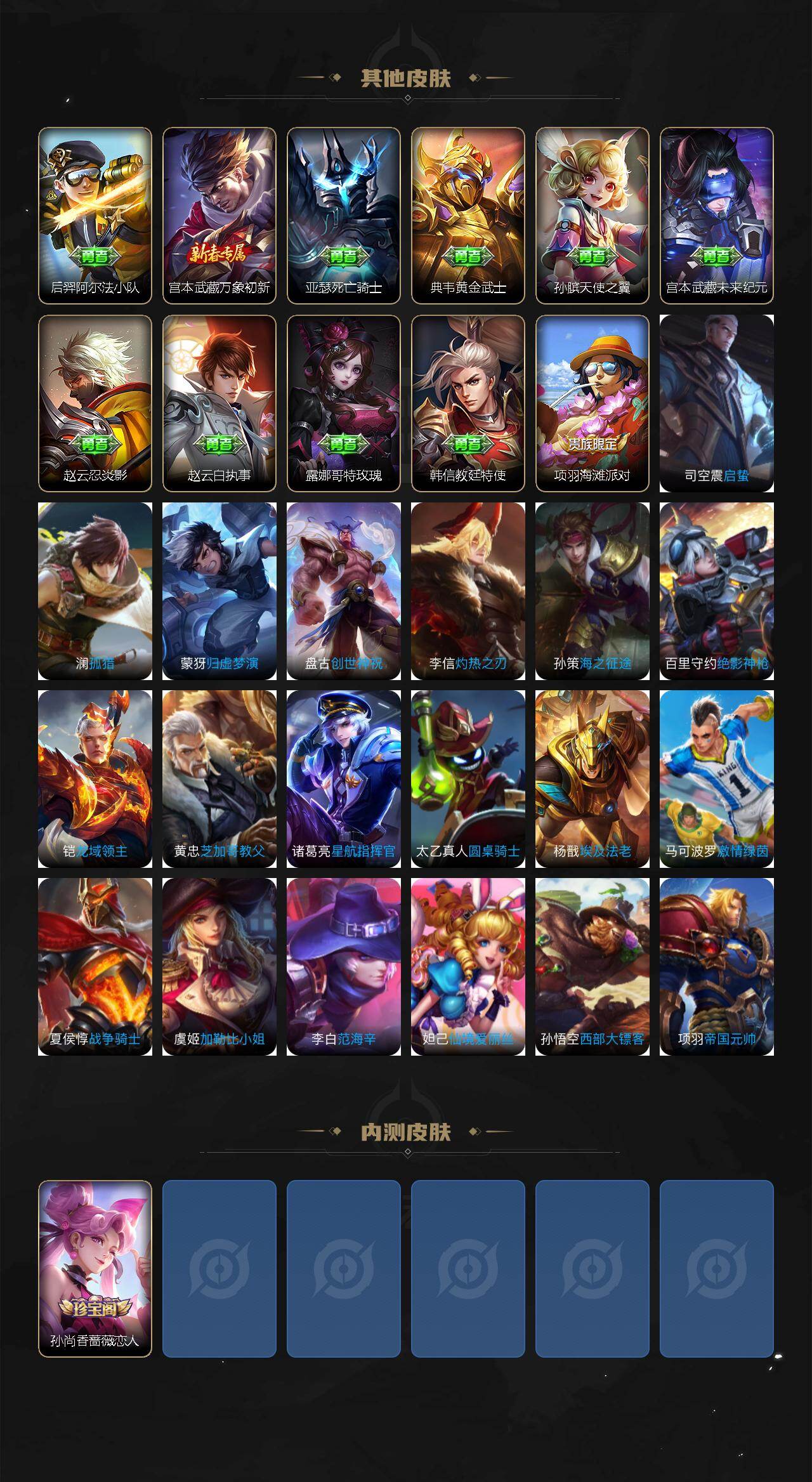 【传说皮肤】:云缨神骥越千峰,狄仁杰神骥赴朔漠,貂蝉神骥聚万邦,马超神骥逐星野,澜愿照九州拓,桑启鸣野蒿,澜逐花归海,铠绛天战甲,刘备时之恋人,孙尚香末日机甲,孙悟空地狱火