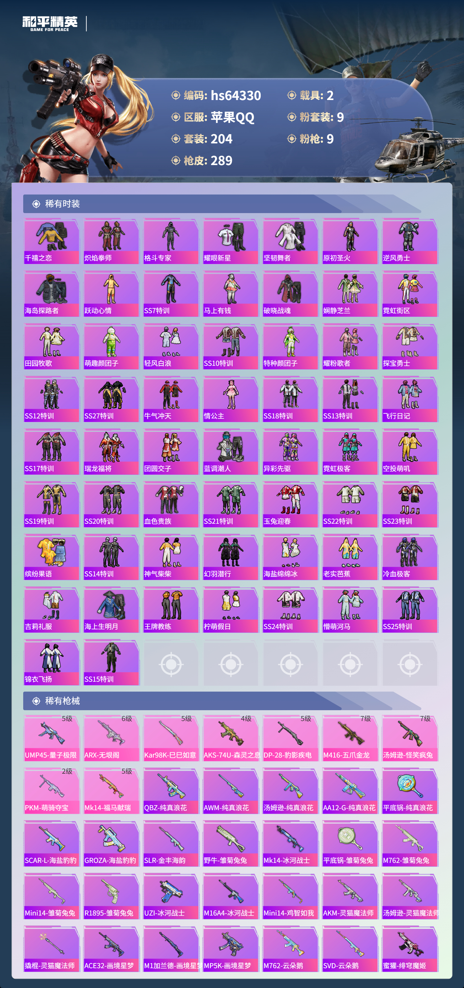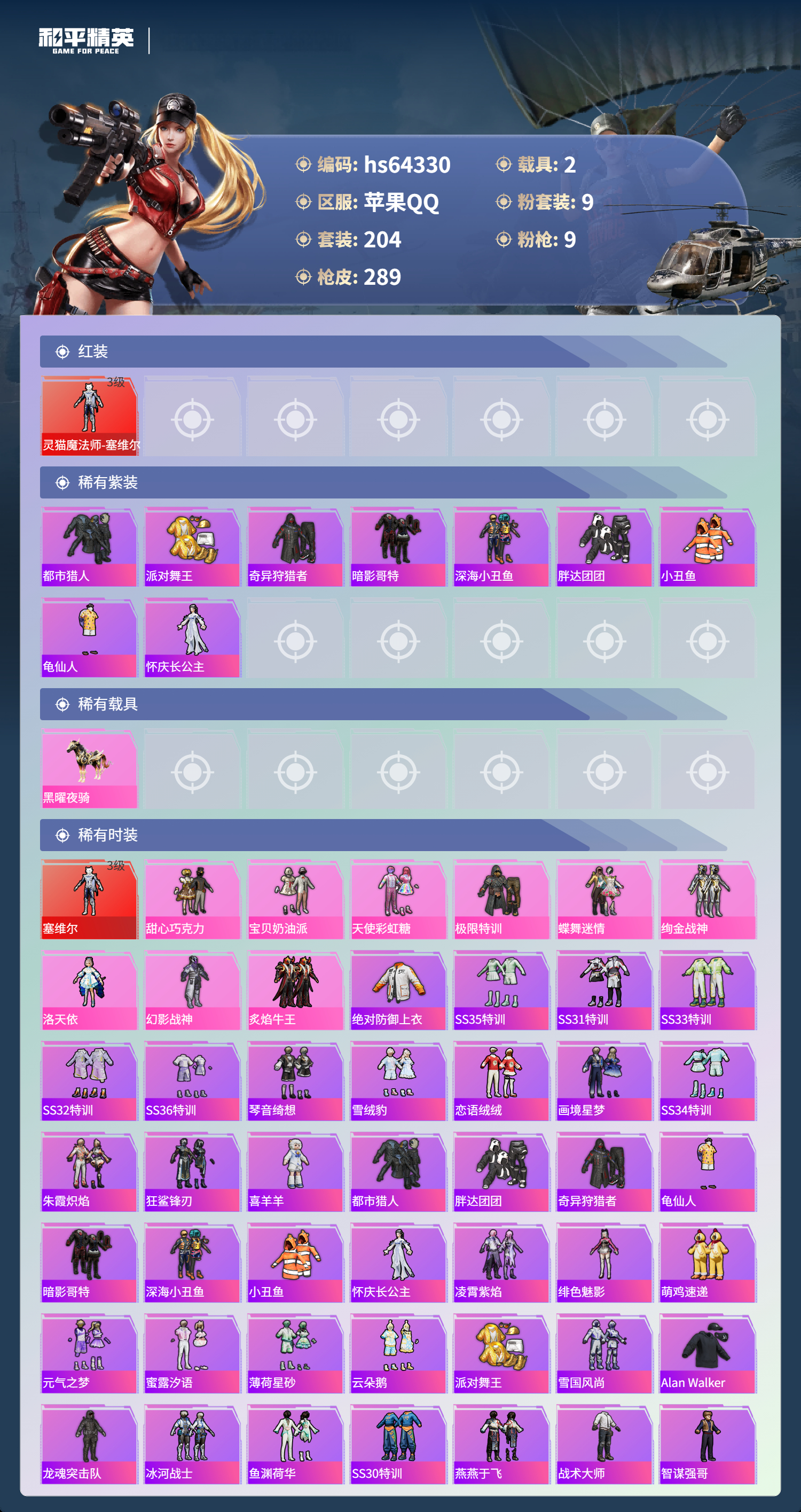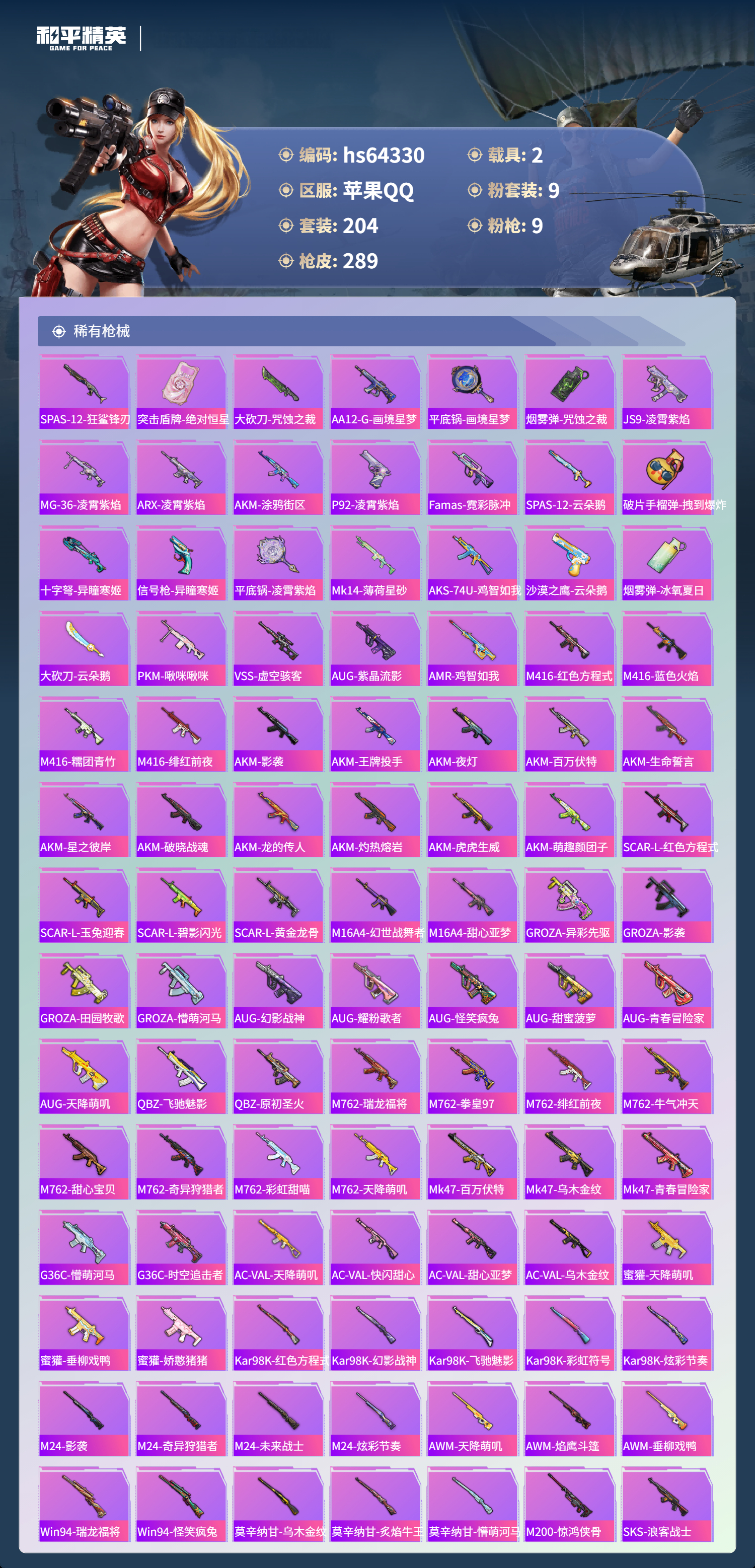 hs64330 苹果手Q-19王牌印记-有战神框-1红装-9粉装-9特效枪-2载具-92875热力值-204套装-289枪皮-2卓越印记-1传奇印记