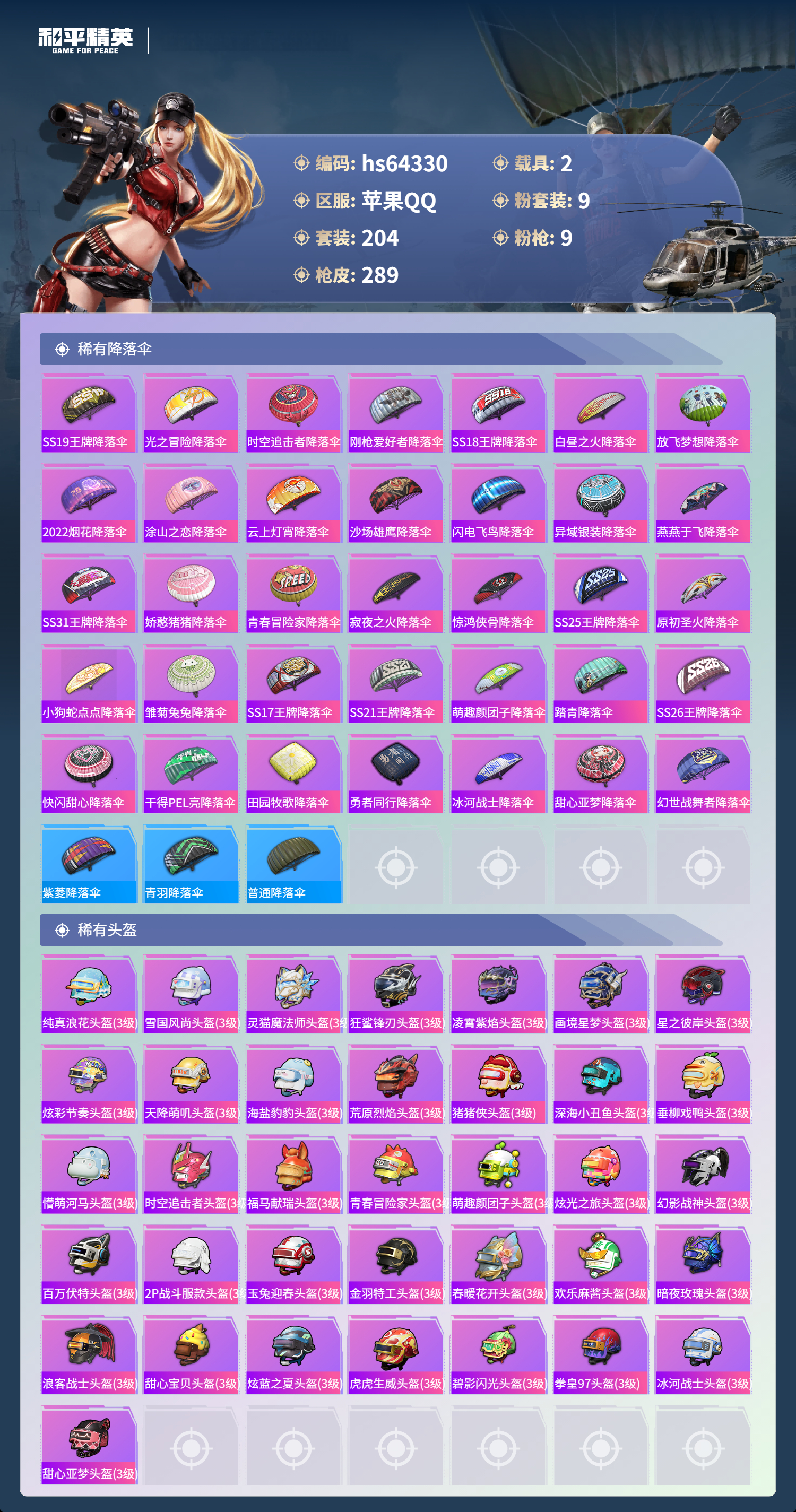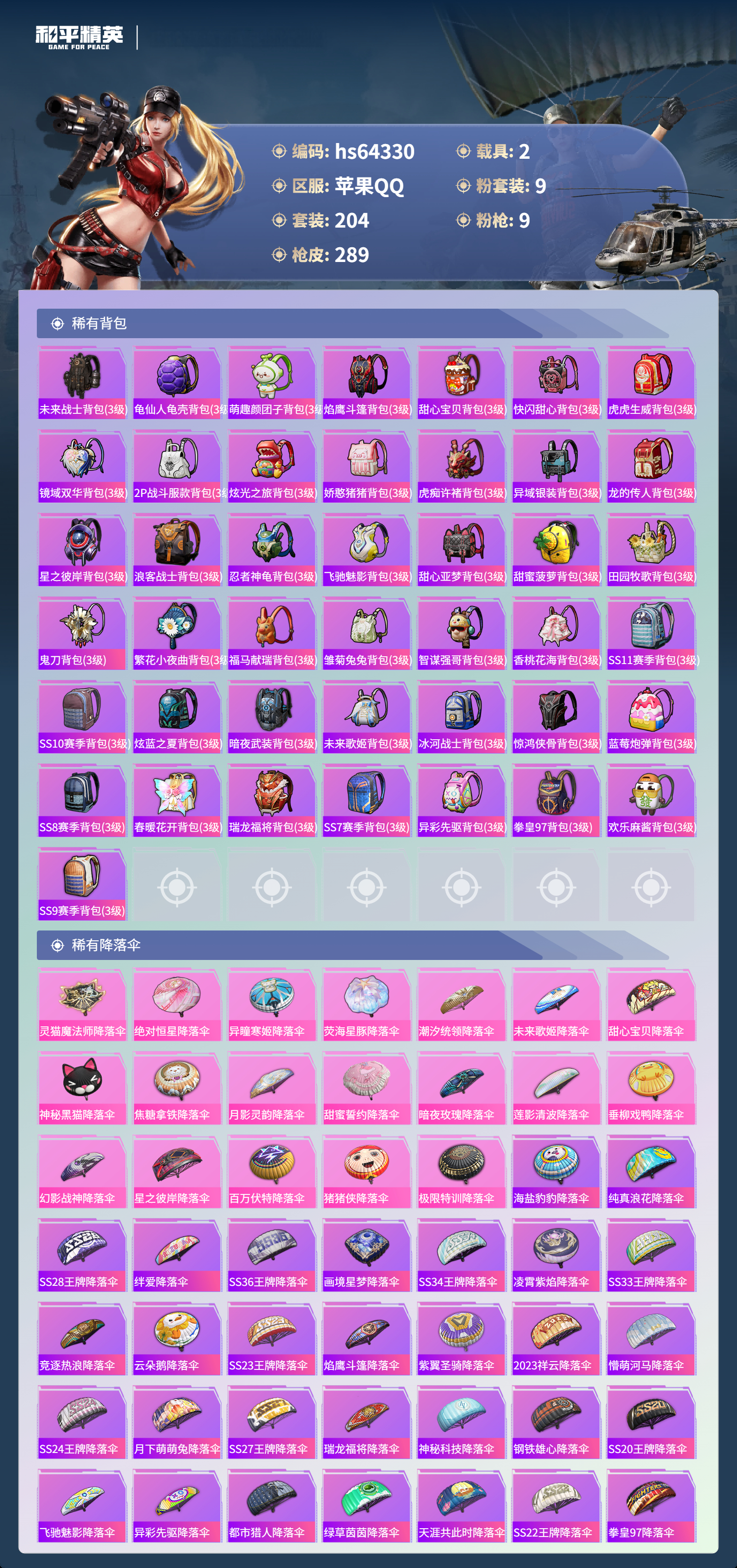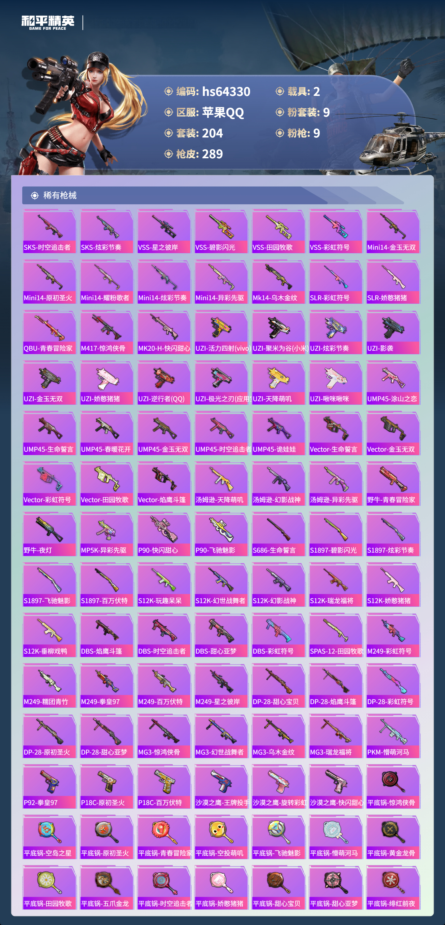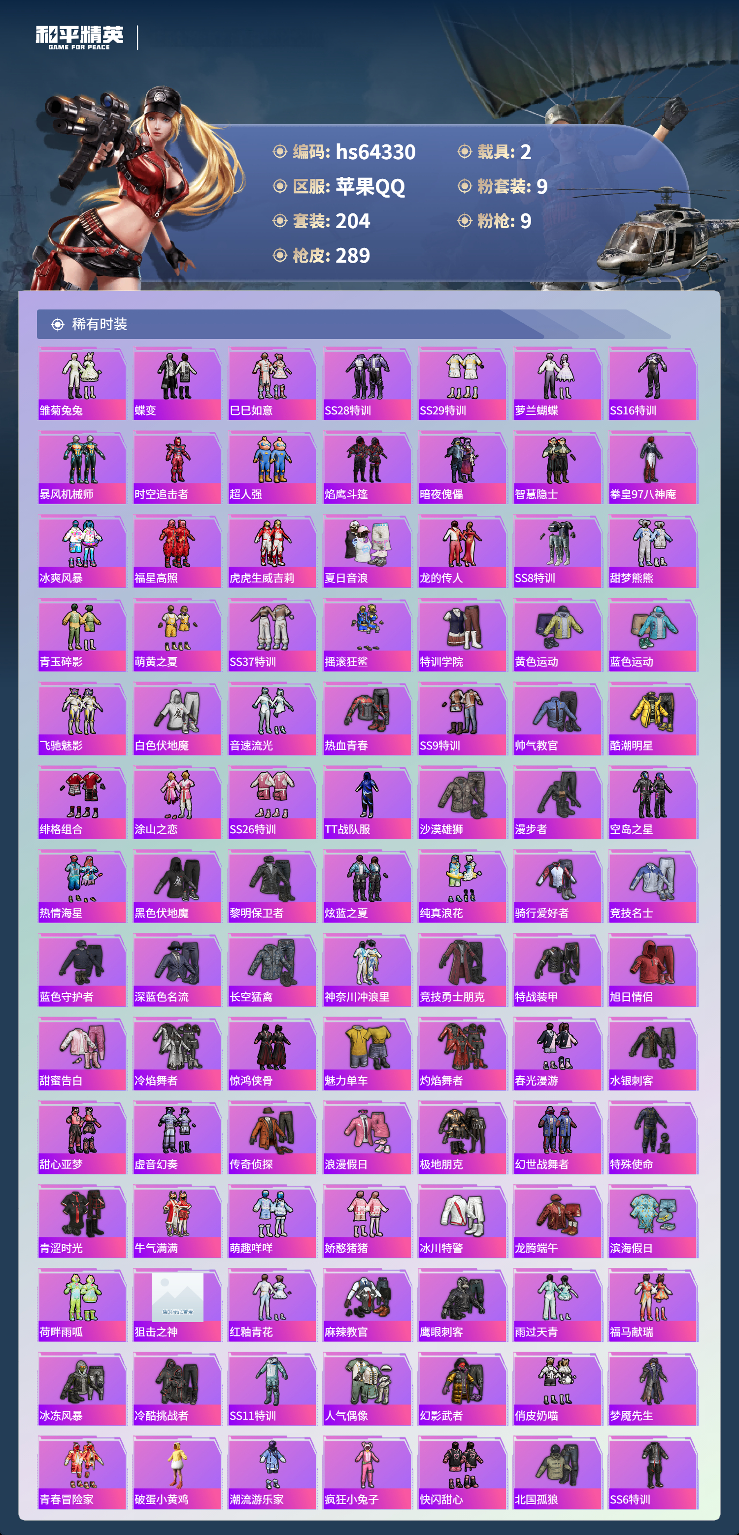 hs64330 苹果手Q-19王牌印记-有战神框-1红装-9粉装-9特效枪-2载具-92875热力值-204套装-289枪皮-2卓越印记-1传奇印记