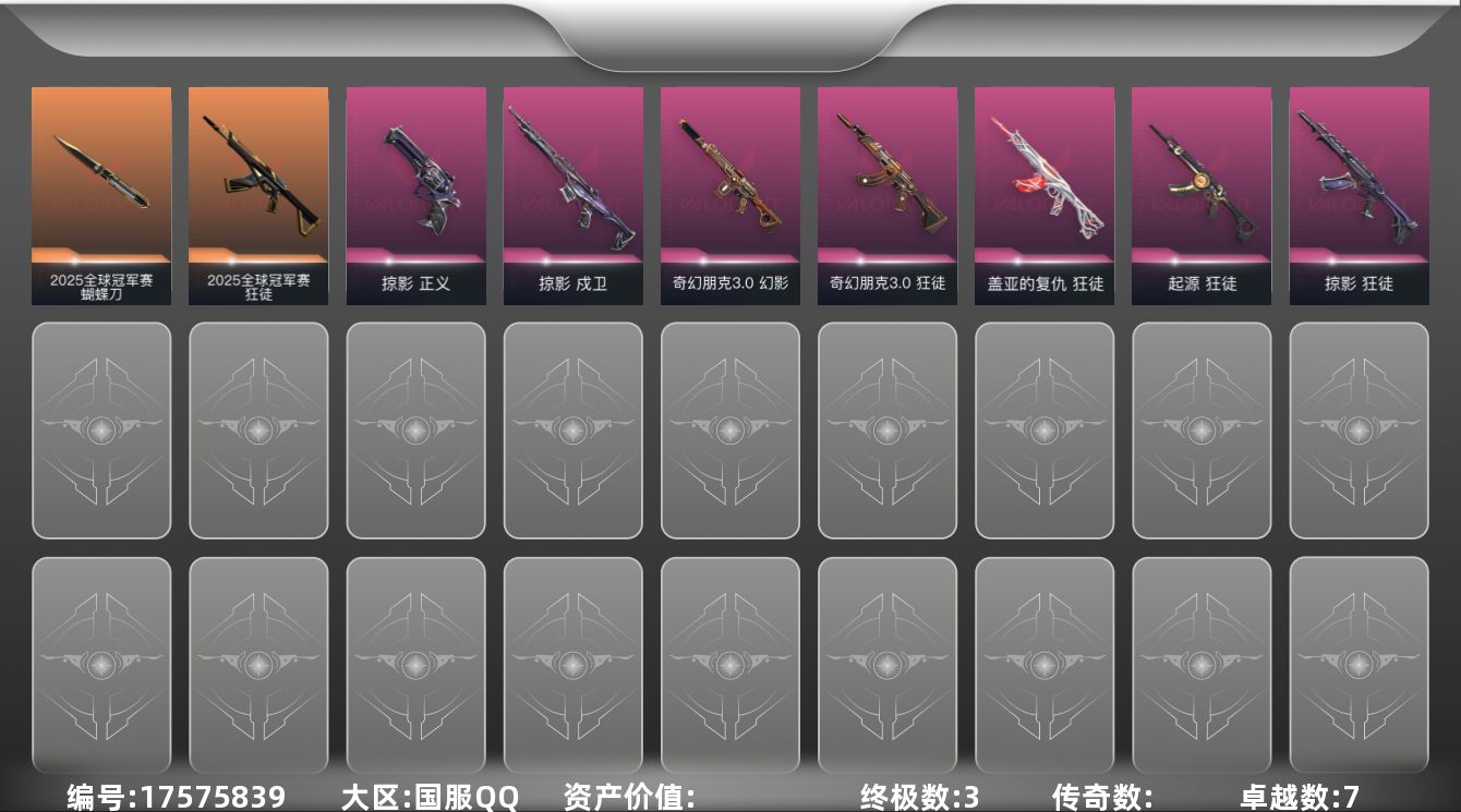 【套装】:2025全球冠军赛套装【英雄】:幻棱,炼狱,维斯,暮蝶,壹决,铁臂,捷风,不死鸟,贤者,猎枭,芮娜,尚勃勒,霓虹,盖可,黑梦【近战武器】:近战武器-2025全球冠军赛 蝴蝶刀,近战武器-魔术火花,近战武器-魔术火花【狂徒】:狂徒-2025全球冠军赛,狂徒-掠影,狂徒-盖亚的复仇,狂徒-起源,狂徒-奇幻朋克//3.0【幻影】:幻影-奇幻朋克//3.0【戍卫】:戍卫-掠影【正义】:正义-掠影【卡面】:《双城之战》拥抱 卡面,欢迎来到底城 卡面,南瓜盛典 卡面,正义的化身 卡面,梦幻奶茶 卡