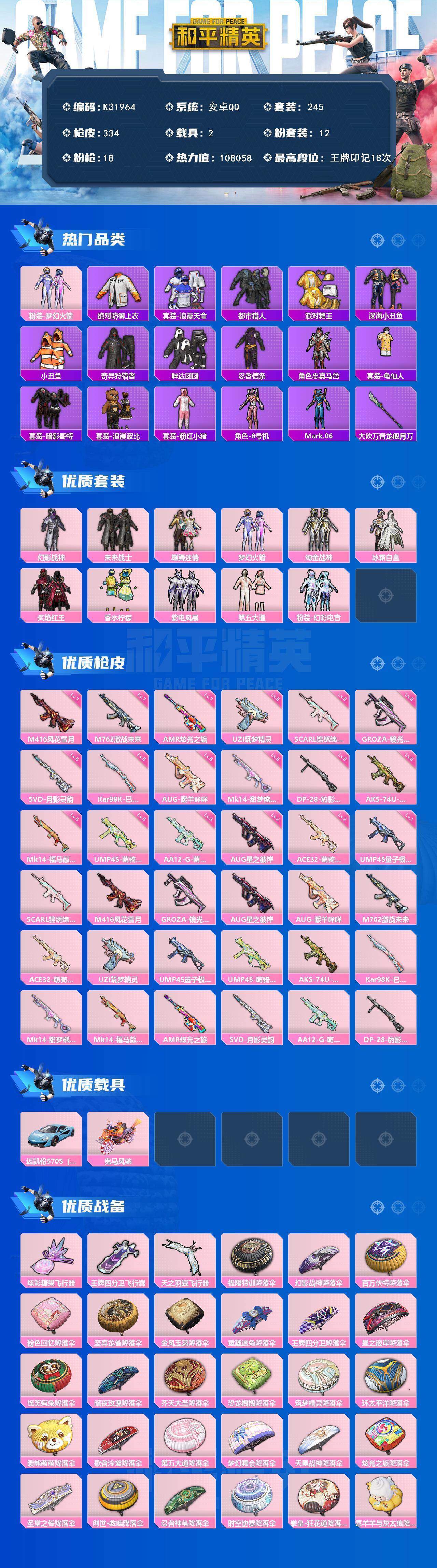 安卓 手Q-12粉装-18特效枪-2载具-3粉色飞行器-108058热力值-18王牌印记-245套装-334枪皮