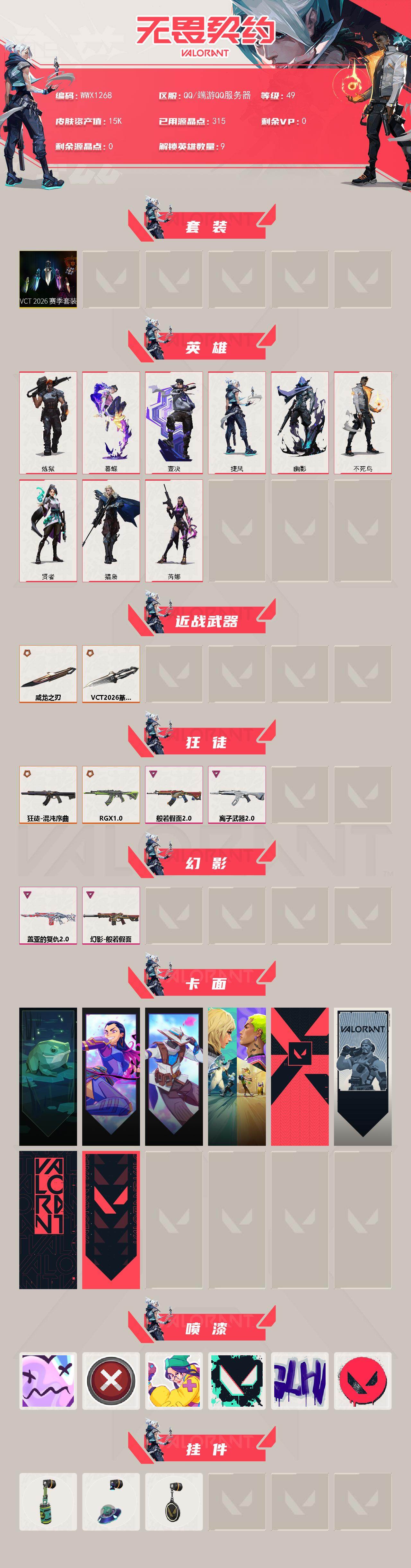 【WWX1268】终极*5/卓越*4/皮肤*20/等级*49/段位:青铜/VCT 2026 赛季套装/炼狱/暮蝶/壹决/捷风/幽影/不死鸟/贤者/猎枭/芮娜/近战武器-VCT 2026 篆刀/近战武器-威龙之刃/狂徒-混沌序曲/狂徒-RGX 11z Pro/狂徒-般若假面//2.0/狂徒-离子武器//2.0/幻影-般若假面/幻影-盖亚的复仇//2.0/霓帧牛蛙 卡面/无畏契约GO!第一卷:芮娜 卡面/无畏契约GO!第一卷:零 卡面/钢锁vs盖可 卡面/代号红色 卡面/新兵报到 卡面/V契约 卡面
