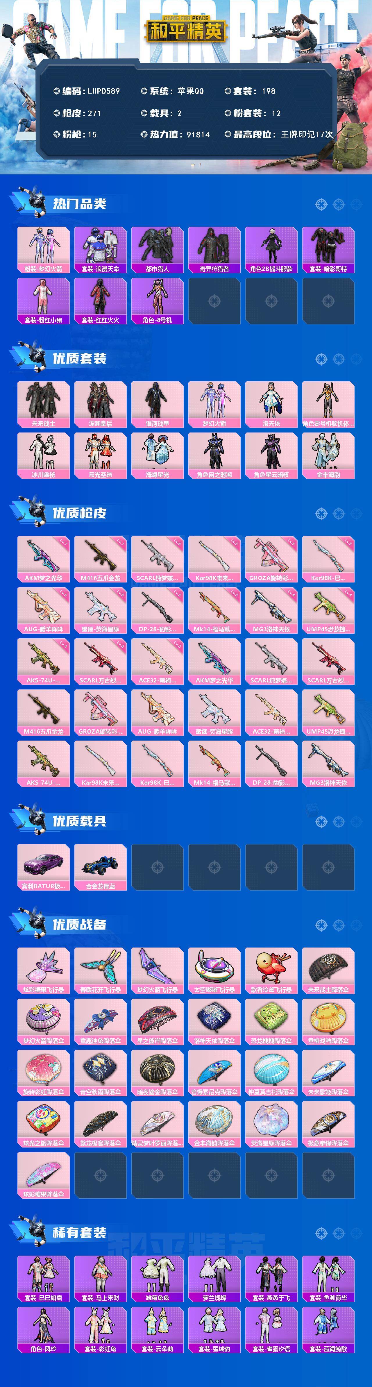 【店主推荐捡漏号!可直接换绑】苹果 手Q-12粉装-15特效枪-2载具-6粉色飞行器-91814热力值-17王牌印记-198套装-271枪皮