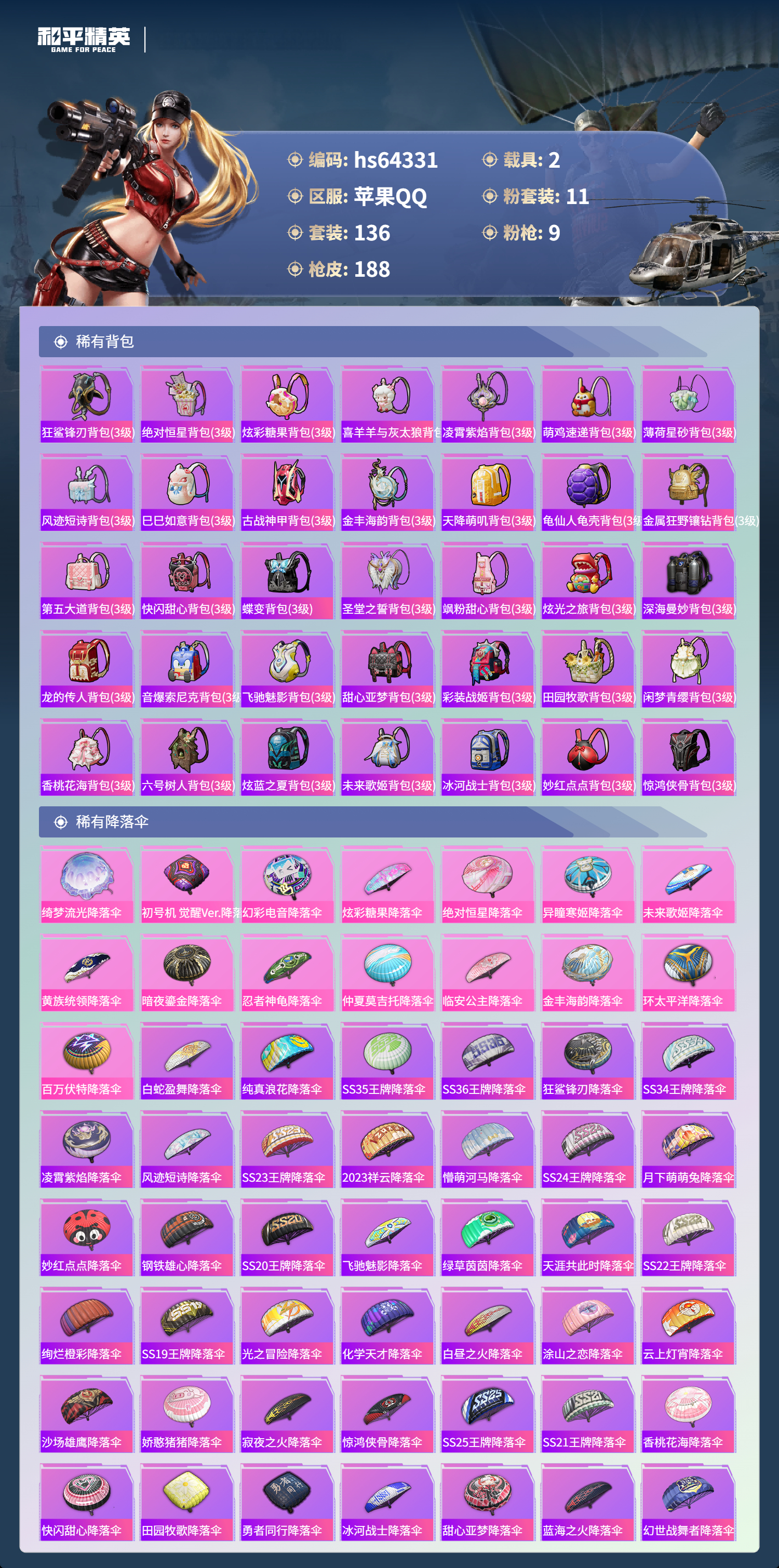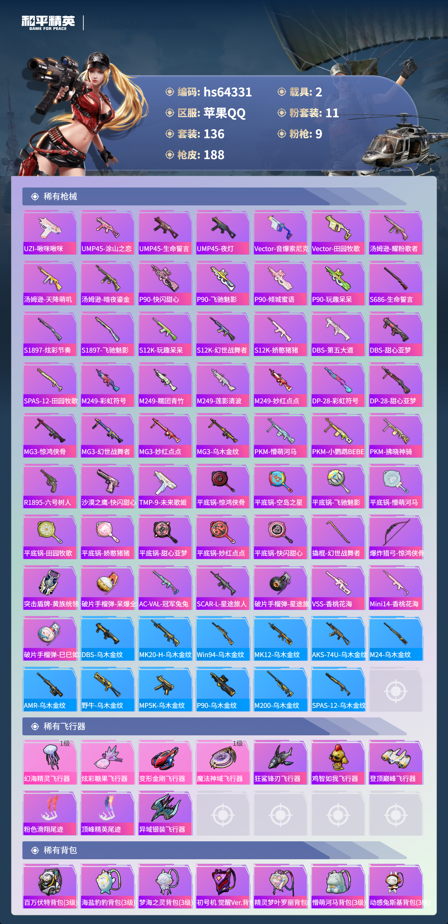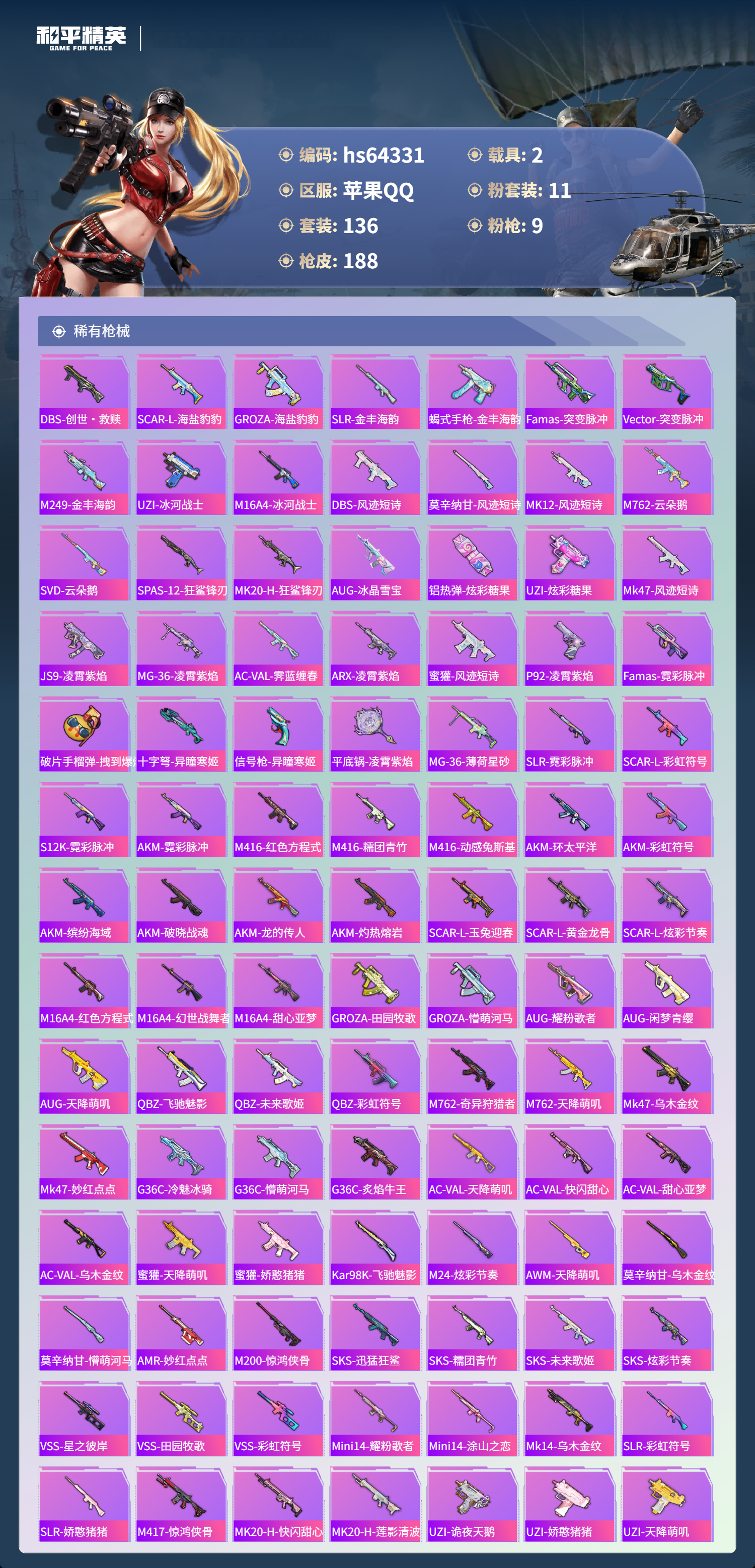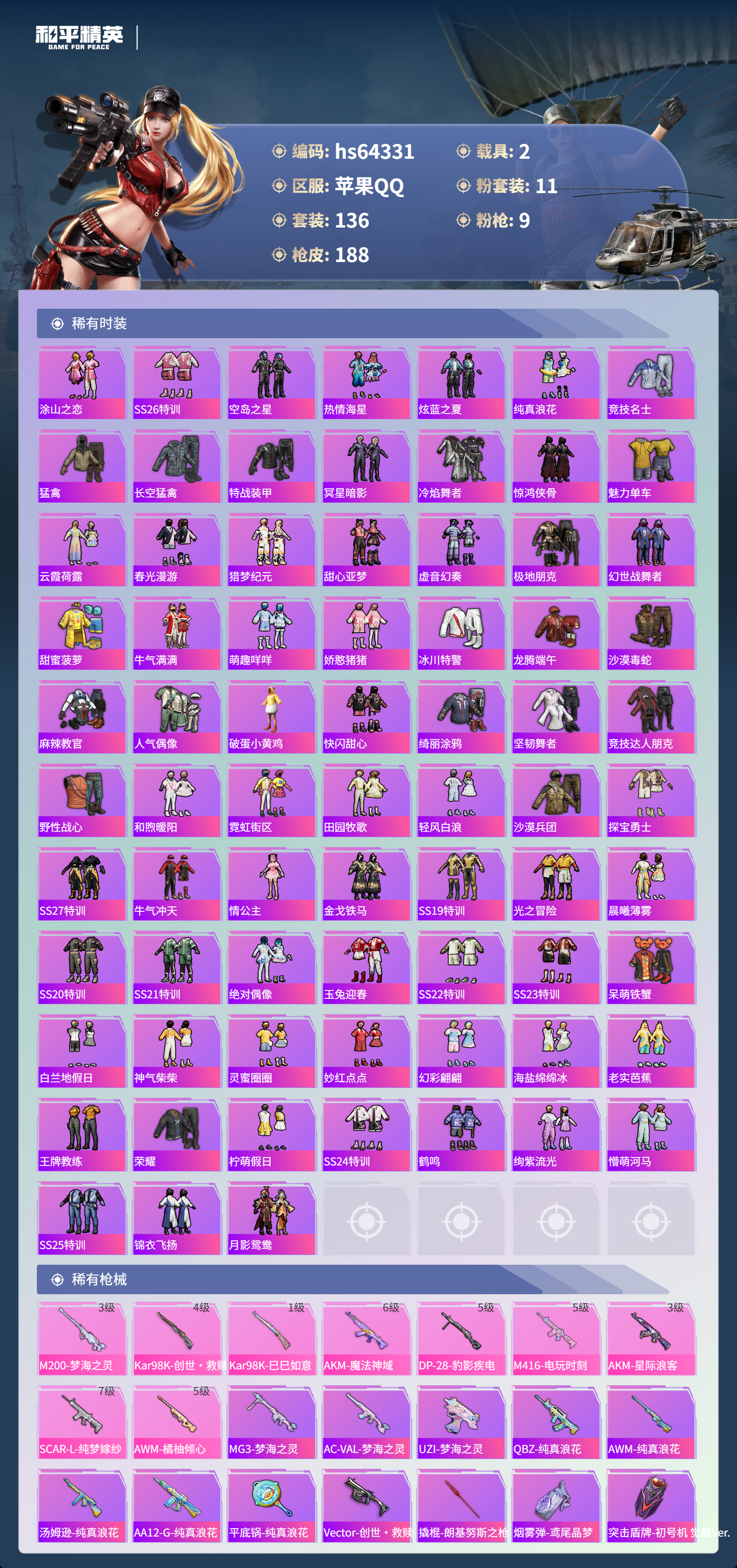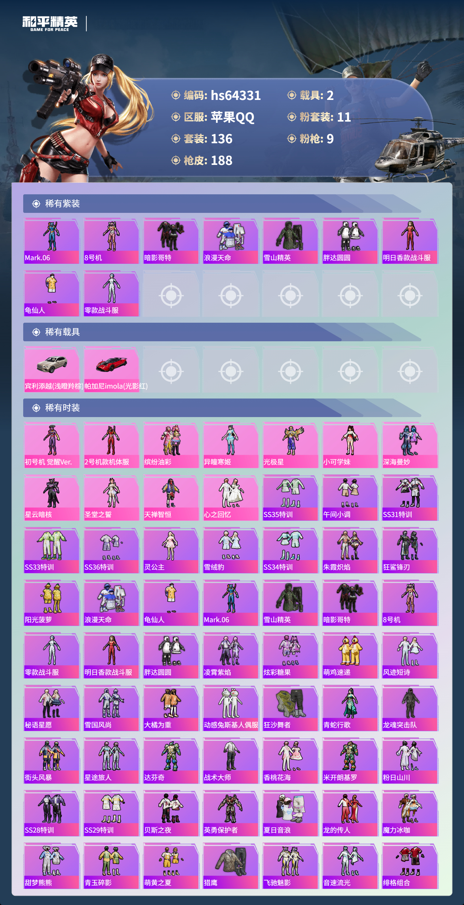 hs64331 苹果手Q-10王牌印记-11粉装-9特效枪-2载具-66332热力值-136套装-188枪皮-4卓越印记-3传奇印记