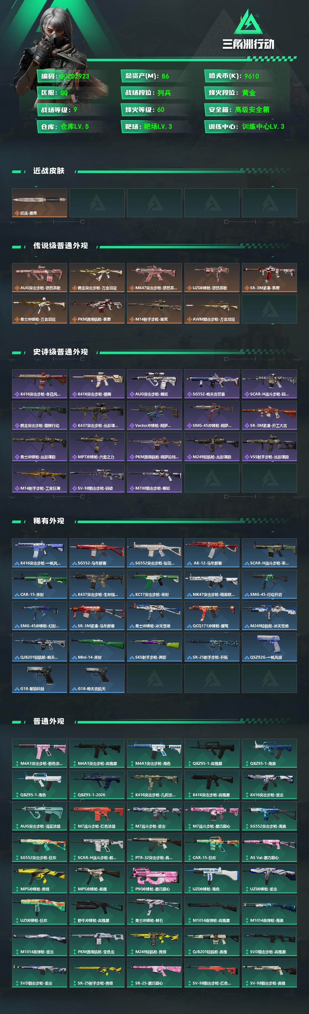 【SJZD2923】总资产(M):86M/哈夫币(K):9610K/哈夫币(K):9610K/传说枪皮数:9/全面战场等级:9_段位:列兵/烽火地带等级:60_段位:黄金/近战-黑鹰/AUG突击步枪-悠然茶歇/腾龙突击步枪-万金泪冠/MK47突击步枪-悠然茶歇/UZI冲锋枪-悠然茶歇/SR-3M紧凑突击步枪-荼蘼/勇士冲锋枪-万金泪冠/PKM通用机枪-荼蘼/M14射手步枪-蛮荒/AWM狙击步枪-万金泪冠/K416突击步枪-冬日风情/K416突击步枪-腊梅/AUG突击步枪-蝮蛇/SG552突击步枪