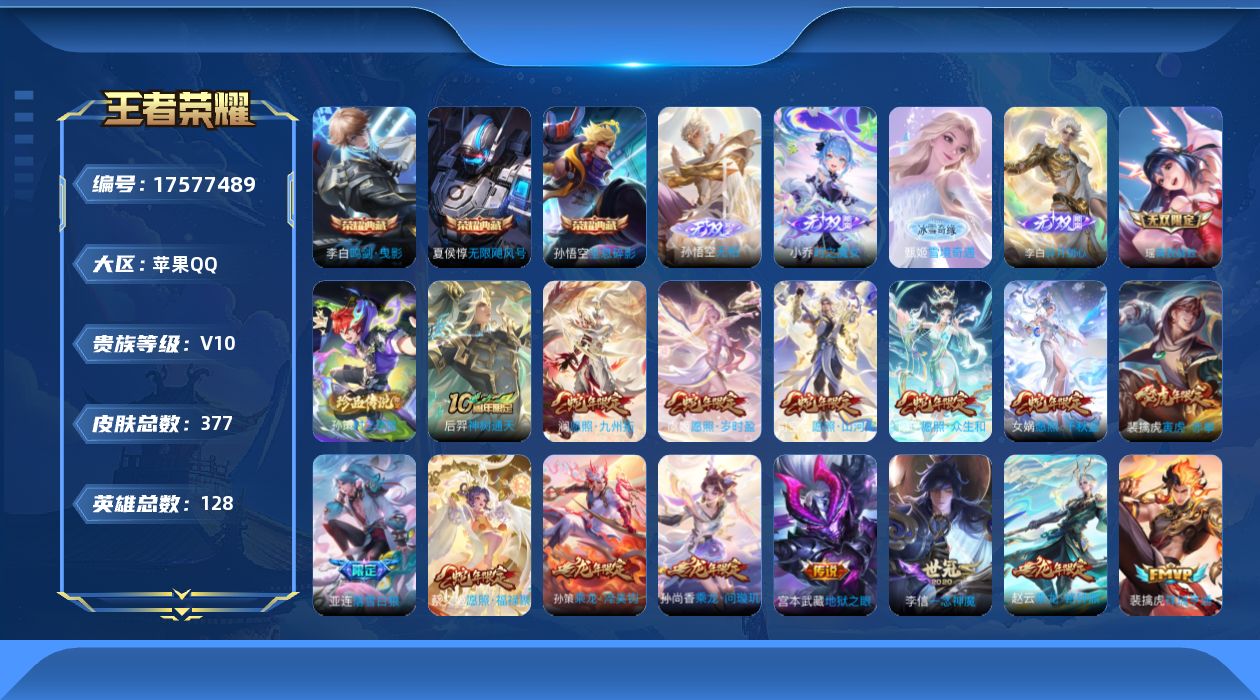 875-[17577489]可二次 万战孙悟空 冰雪奇缘小兵皮肤 冰雪奇缘天幕 贵族10-流光积分13821-贵族积分202709-377皮3典藏25传说5无双1珍品传说-8个英雄全皮 苹果手Q103区377皮3典藏25传说5无双1珍品传说V10 营地ID2119788901无双王者【珍品传说皮肤】:时之奇旅【无双皮肤】:瑶真我赫兹,无相,雪境奇遇,时之魔女,碎月剑心【荣耀典藏】:鸣剑·曳影,无限飓风号,全息碎影【优质限定皮肤】:神威,至尊宝【传说皮肤】:地狱之眼