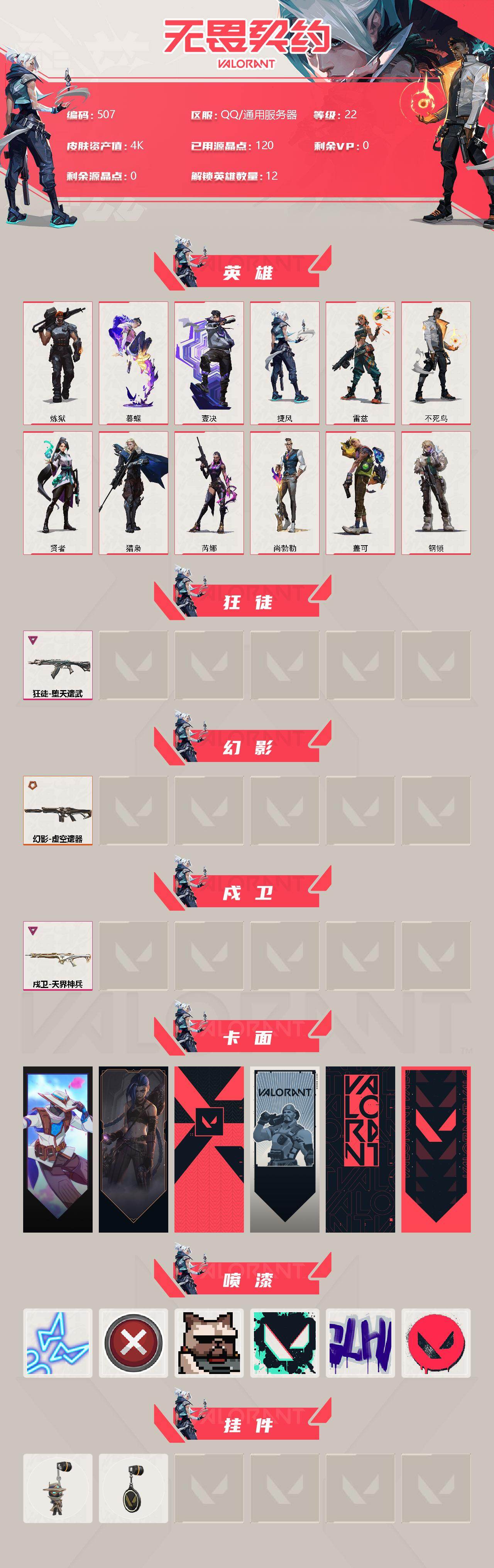 【英雄】:炼狱,暮蝶,壹决,捷风,雷兹,不死鸟,贤者,猎枭,芮娜,尚勃勒,盖可,钢锁【狂徒】:狂徒-堕天遗武【幻影】:幻影-虚空遗器【戍卫】:戍卫-天界神兵【卡面】:无畏契约GO!第一卷:零 卡面,《双城之战》金克丝 卡面,代号红色 卡面,新兵报到 卡面,V契约 卡面,无畏契约 卡面【喷漆】:霓光四射 喷漆,买装还是存钱 喷漆,关门放狗 喷漆,胜利属于无畏契约 喷漆,GLHF 喷漆,无畏契约 喷漆【挂饰】:无畏契约GO!第一卷 零 挂饰,无畏契约 纪念币 挂饰
