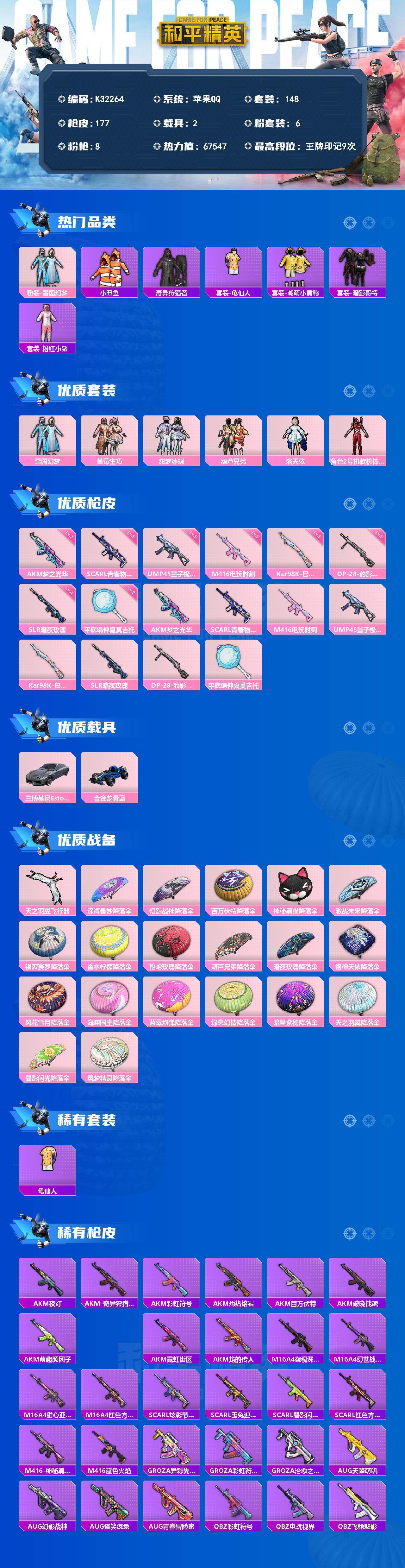 苹果 手Q-6粉装-8特效枪-2载具-1粉色飞行器-67547热力值-9王牌印记-148套装-177枪皮