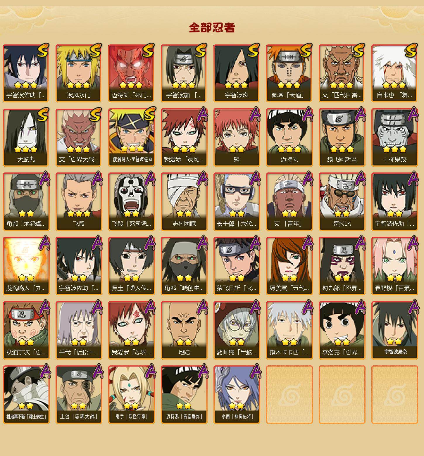 11S级忍者数-34A级忍者数【S级忍者】:艾「忍界大战」(3星),宇智波鼬「须佐能乎」(3星),艾「四代目雷影」(3星),自来也「舞之豪杰」(3星),大蛇丸(3星),宇智波斑(3星),波风水门(3星),迈特凯「死门」(3星),佩恩「天道」(3星),宇智波佐助「永恒万花筒」(3星),漩涡鸣人·宇智波佐助(3星)【A级忍者】:艾「青年」(2星),奇拉比(2星),飞段(3星),飞段「死司凭血」(2星),干柿鬼鲛(3星),漩涡鸣人「九尾查克拉」(2星),迈特凯(3星),旗木卡卡西「幻之真容」(2星),