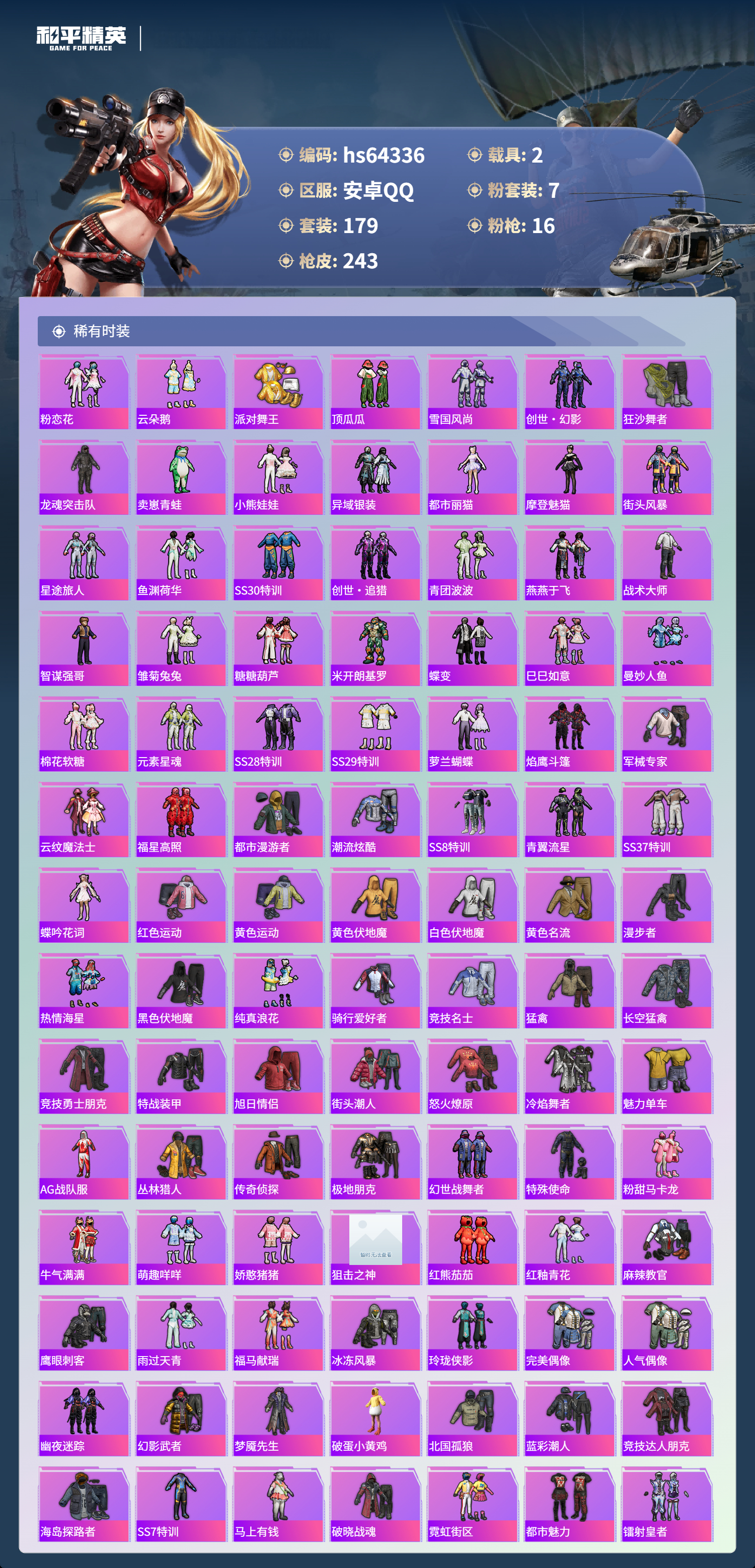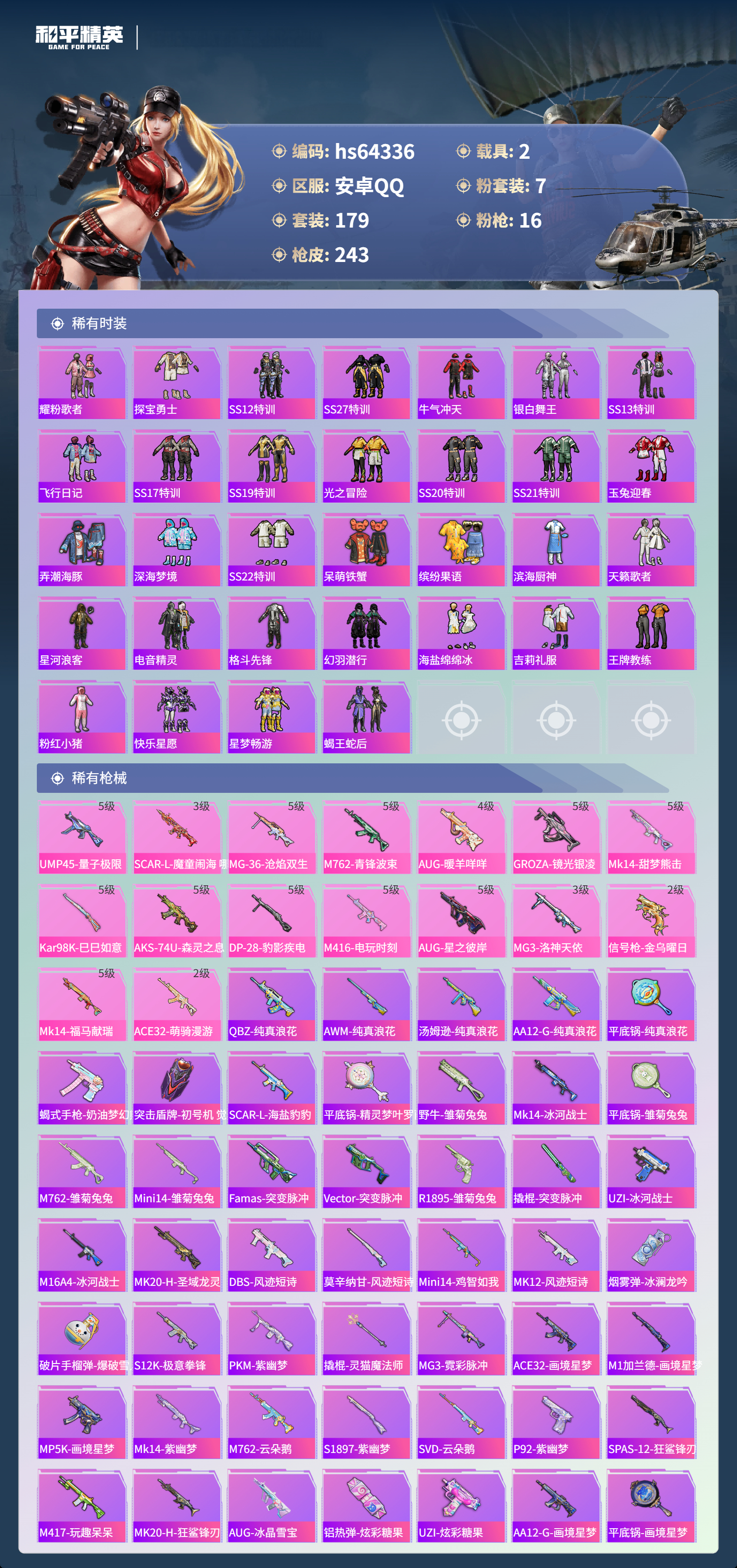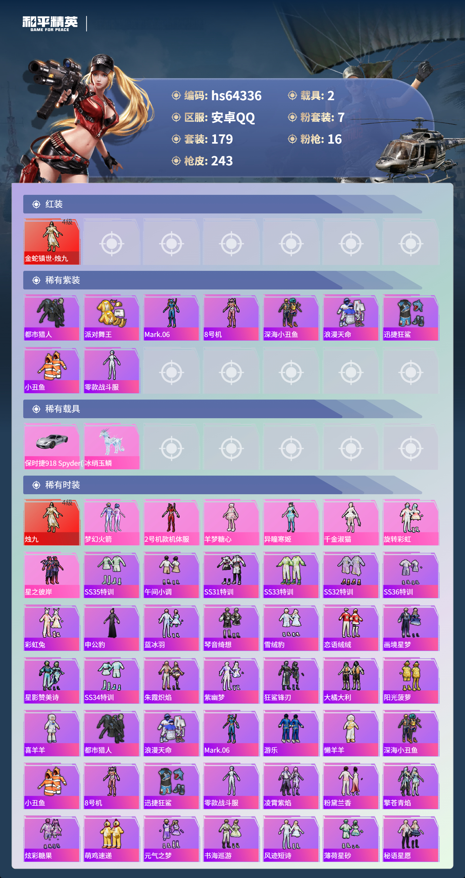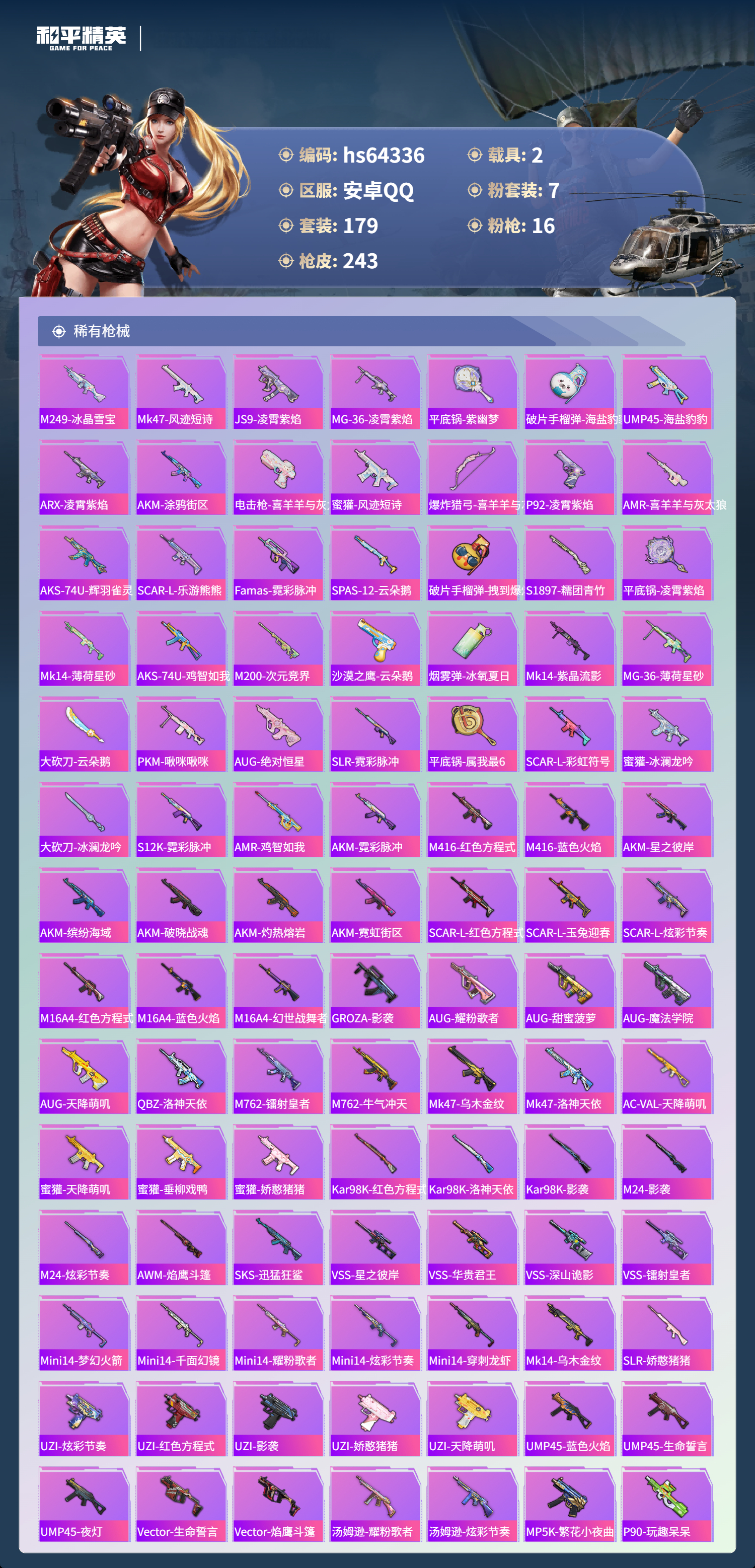 hs64336 安卓手Q-11王牌印记-1红装-7粉装-16特效枪-2载具-84679热力值-179套装-243枪皮-5卓越印记-4传奇印记