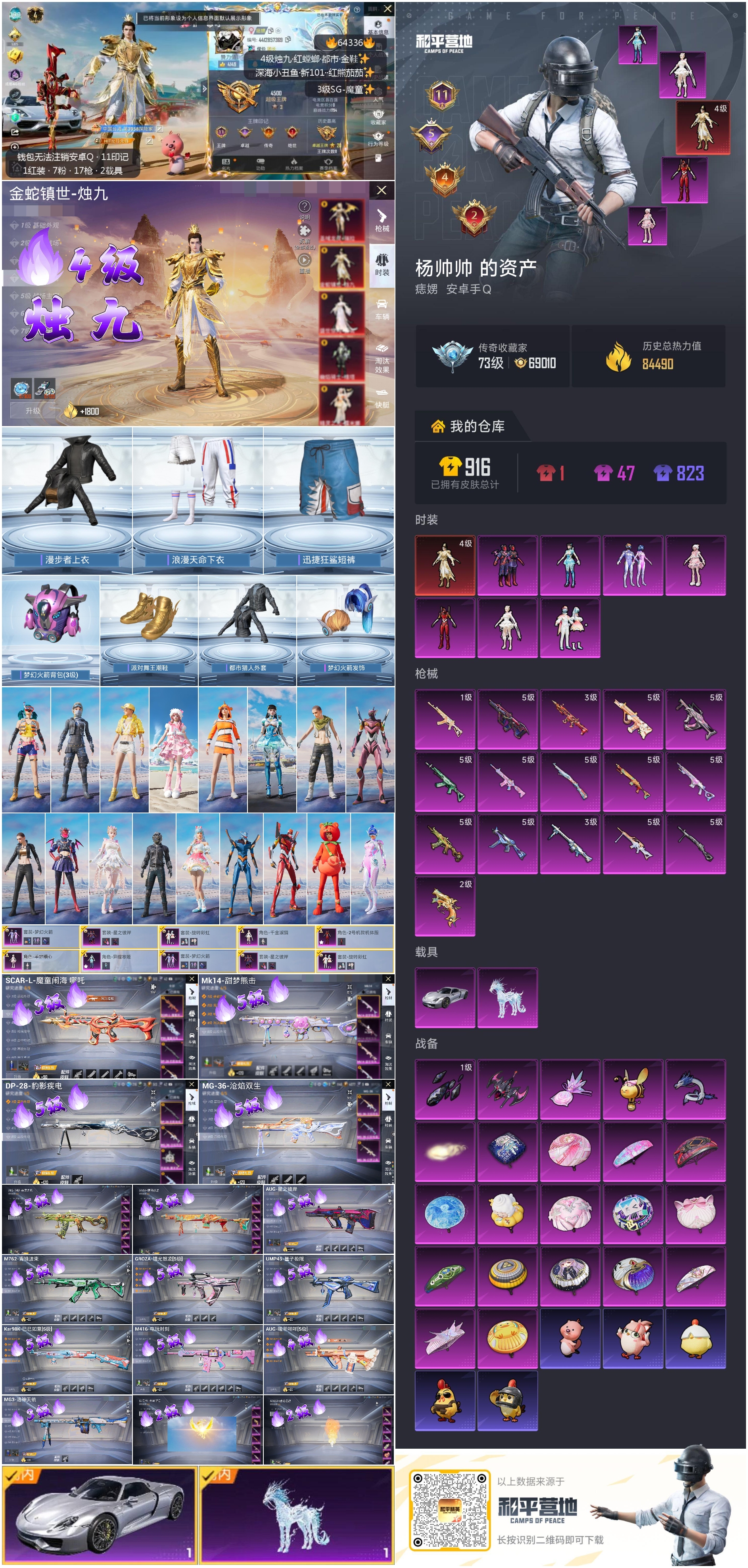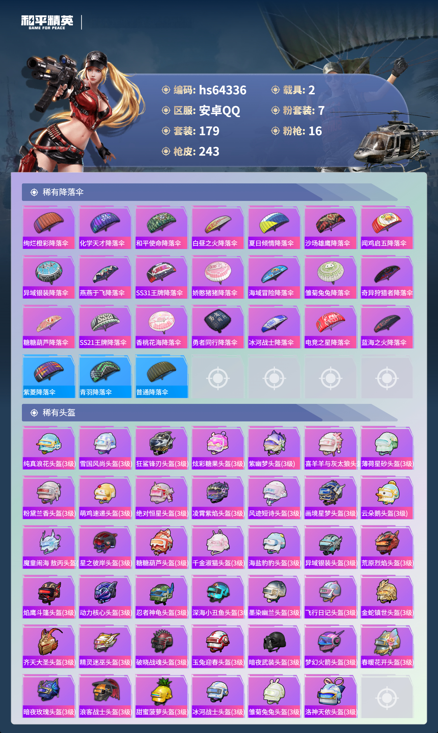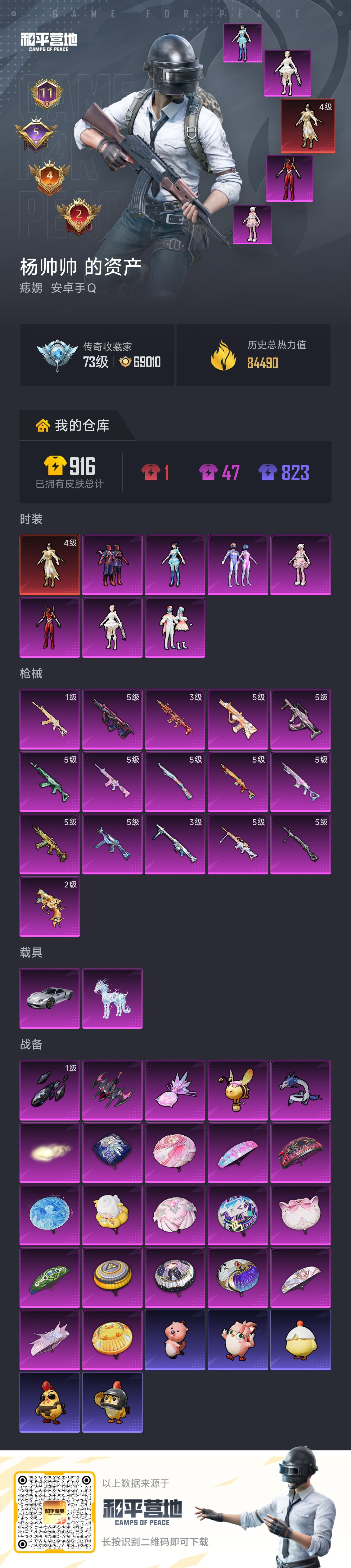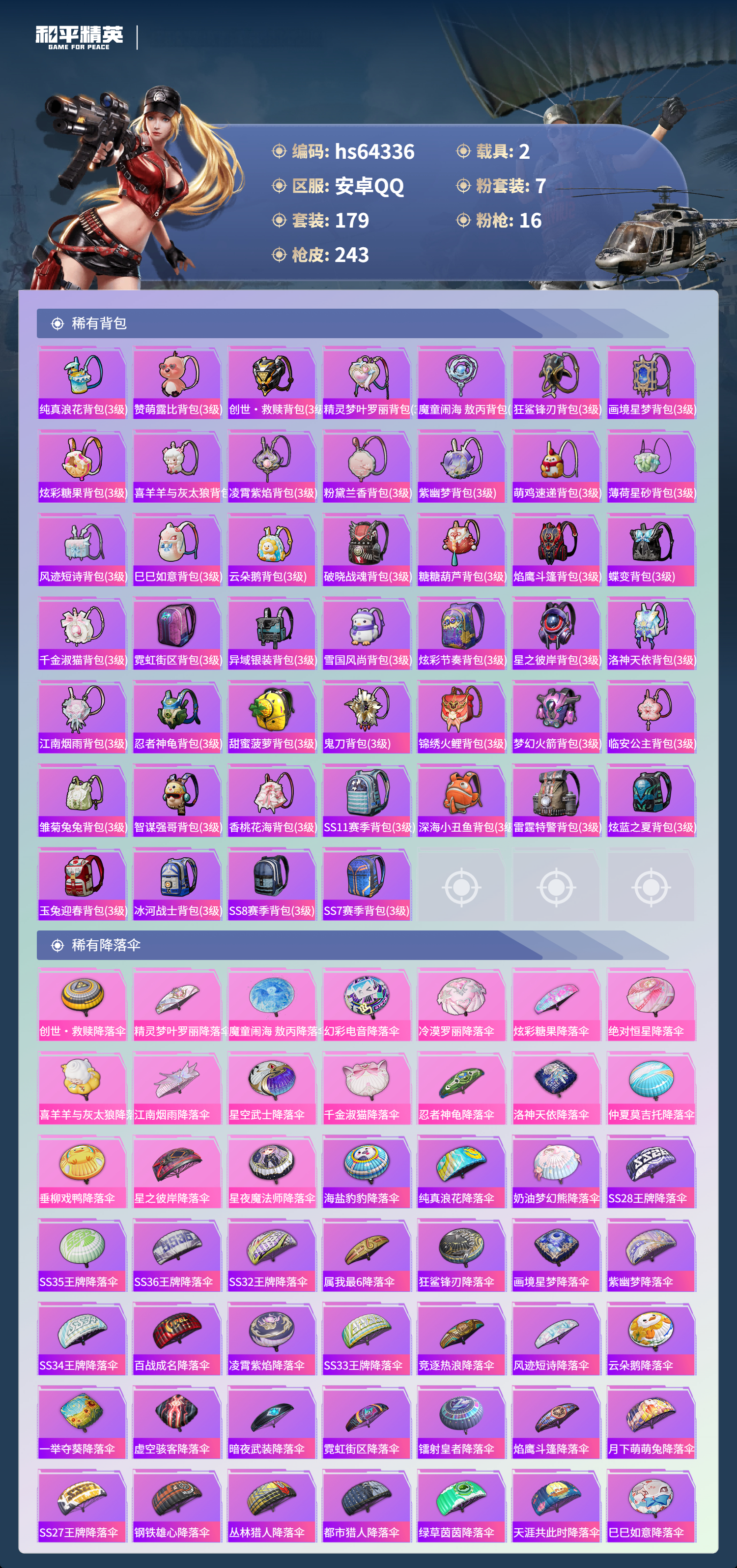 hs64336 安卓手Q-11王牌印记-1红装-7粉装-16特效枪-2载具-84679热力值-179套装-243枪皮-5卓越印记-4传奇印记