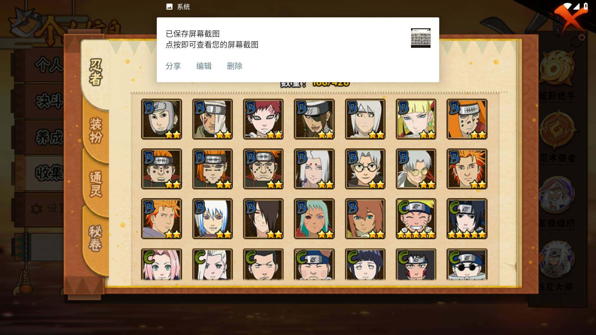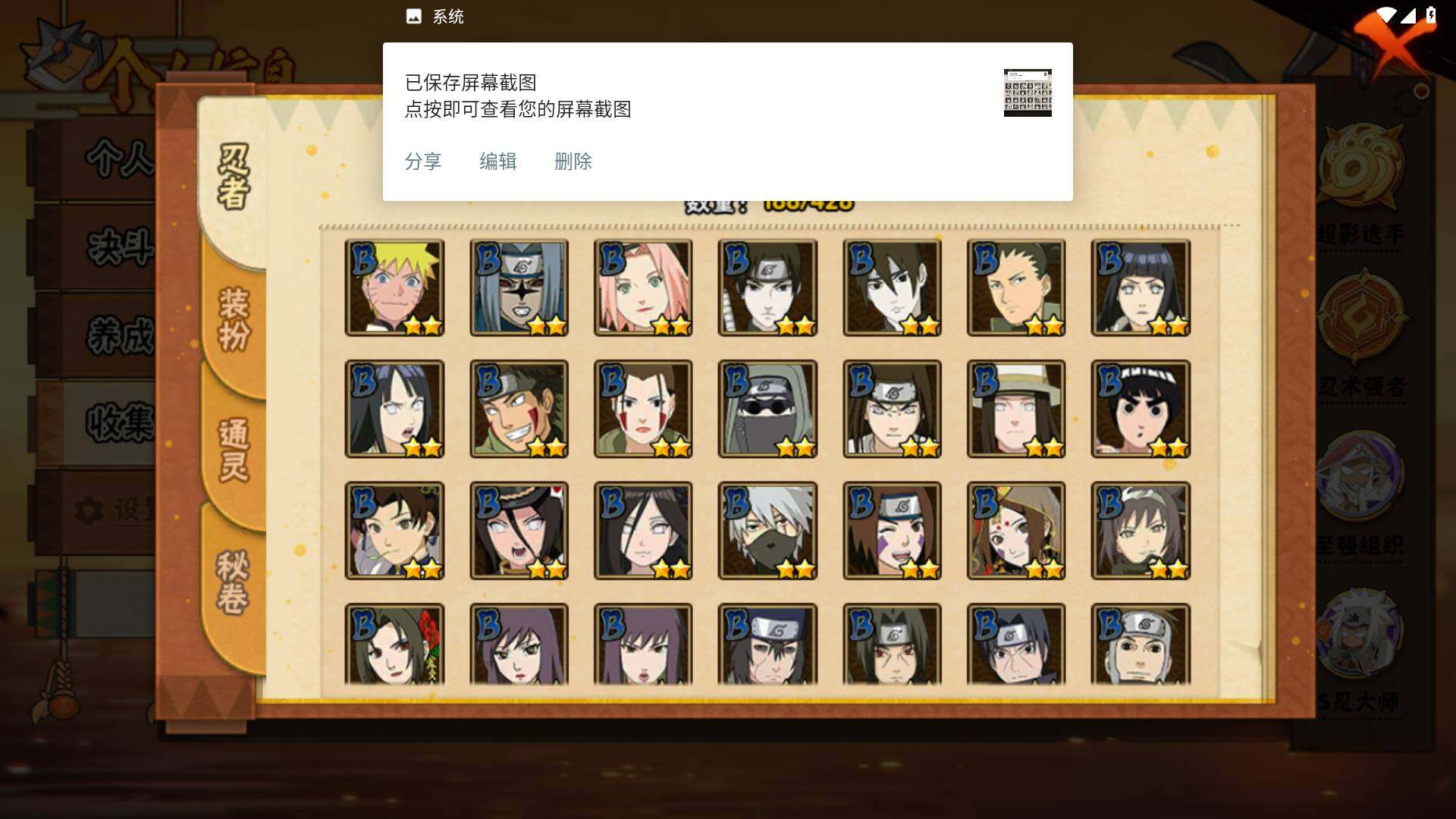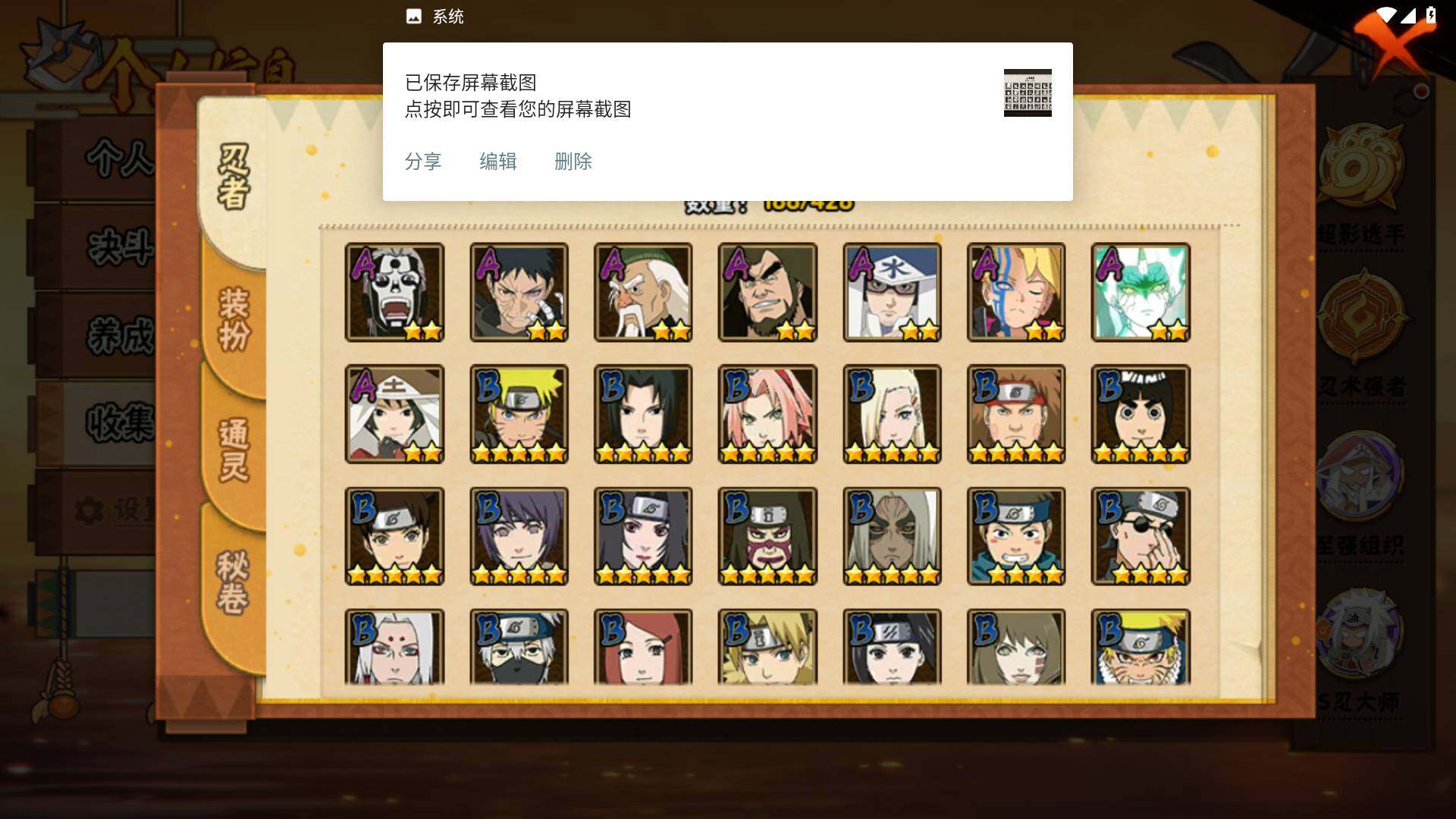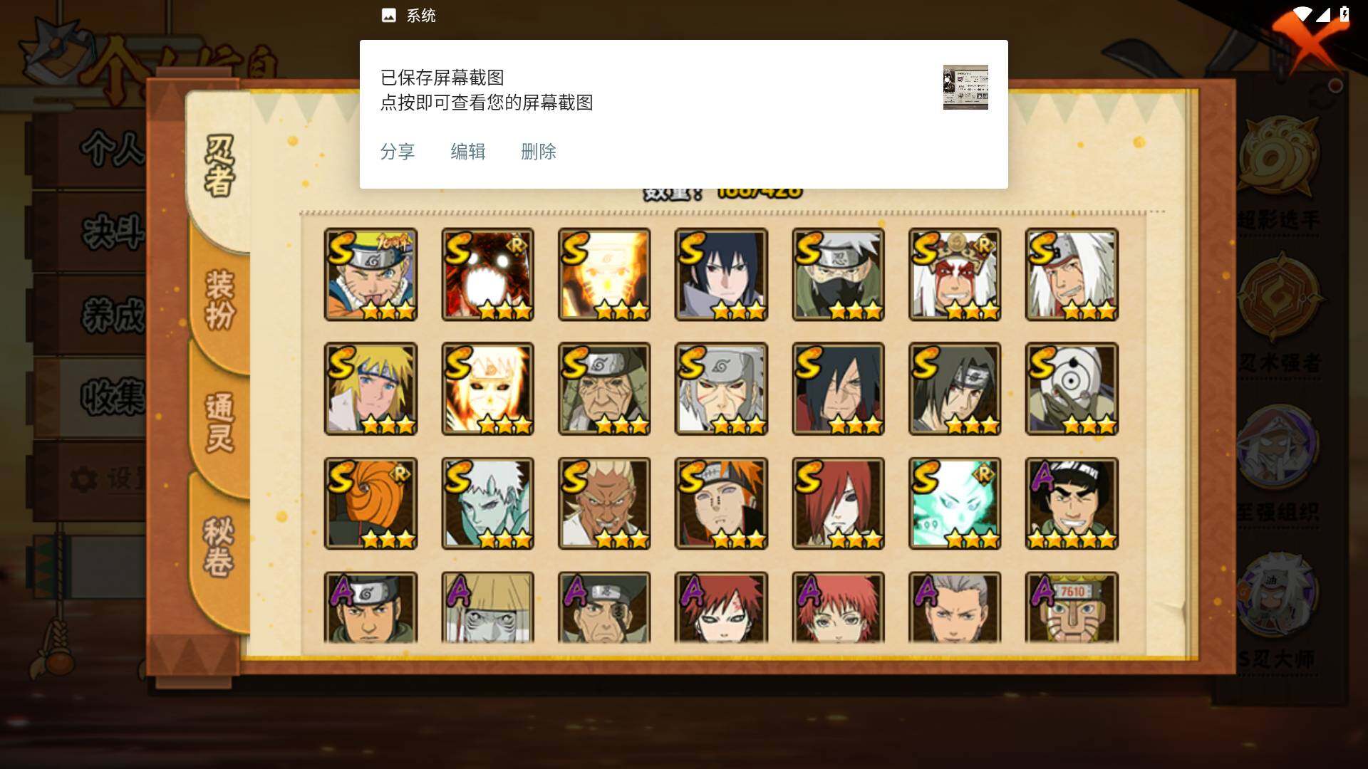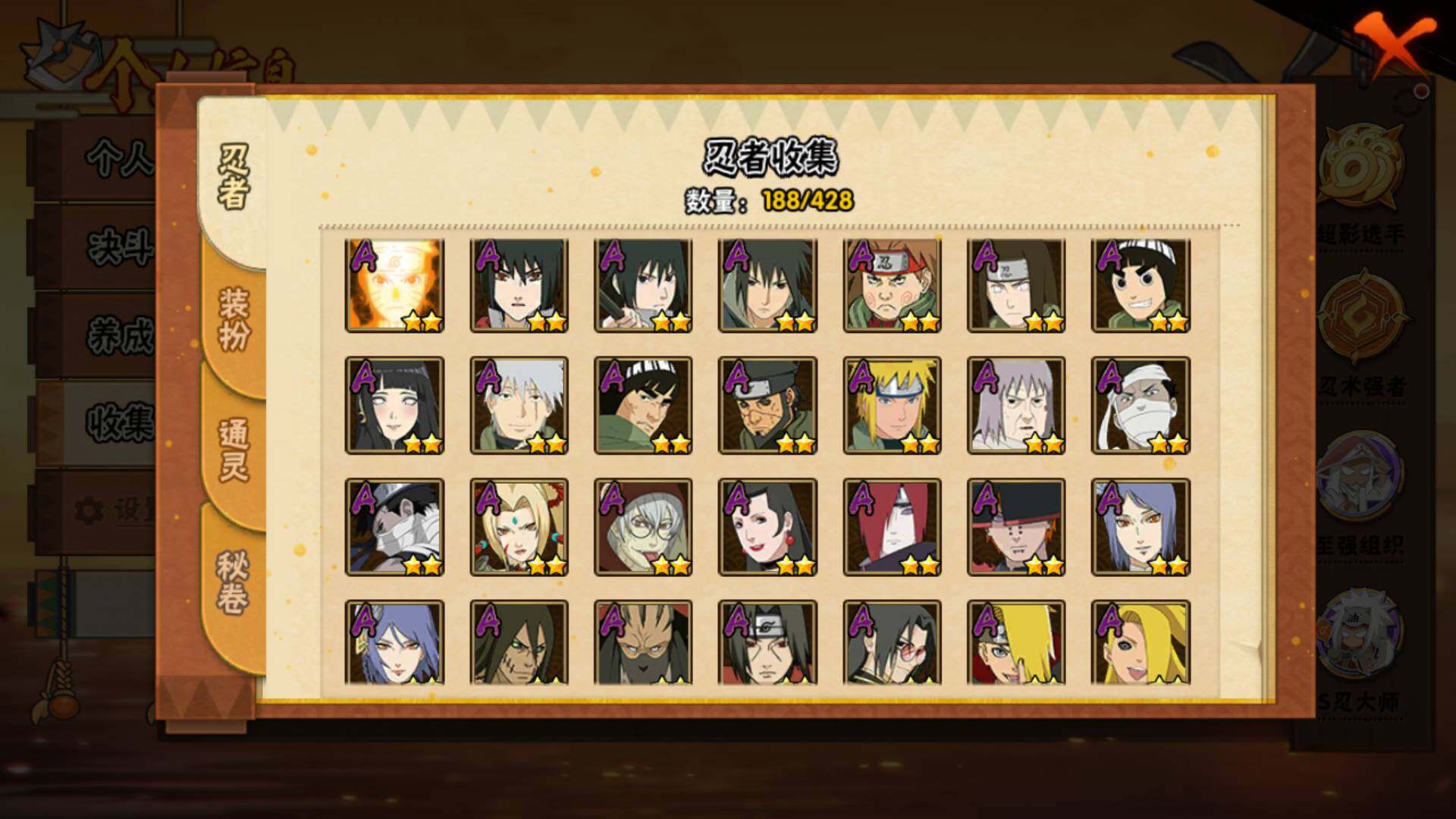 【S级忍者】:长门「秽土转生」(3星),猿飞日斩「秽土转生」(3星),千手扉间「秽土转生」(3星),宇智波斑「秽土转生·解」(3星),艾「忍界大战」(3星),宇智波鼬「须佐能乎」(3星),旗木卡卡西「须佐能乎」(3星),自来也「舞之豪杰」(3星),自来也「传说中的三忍」(3星),