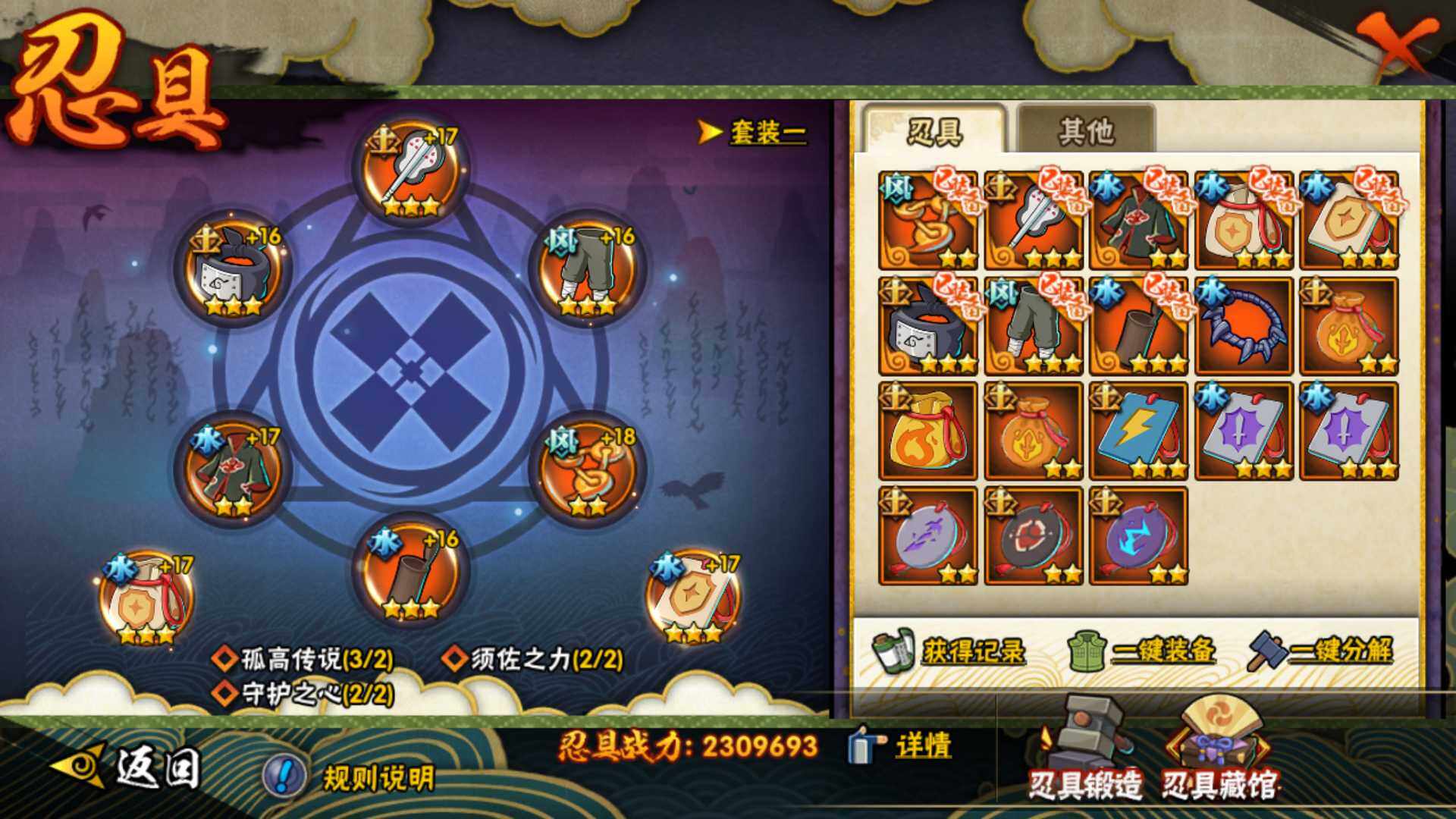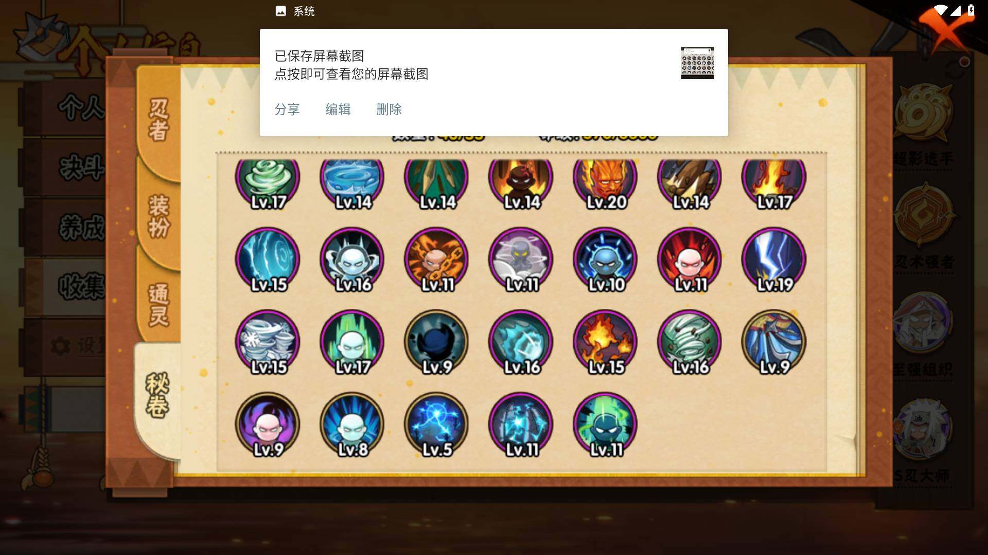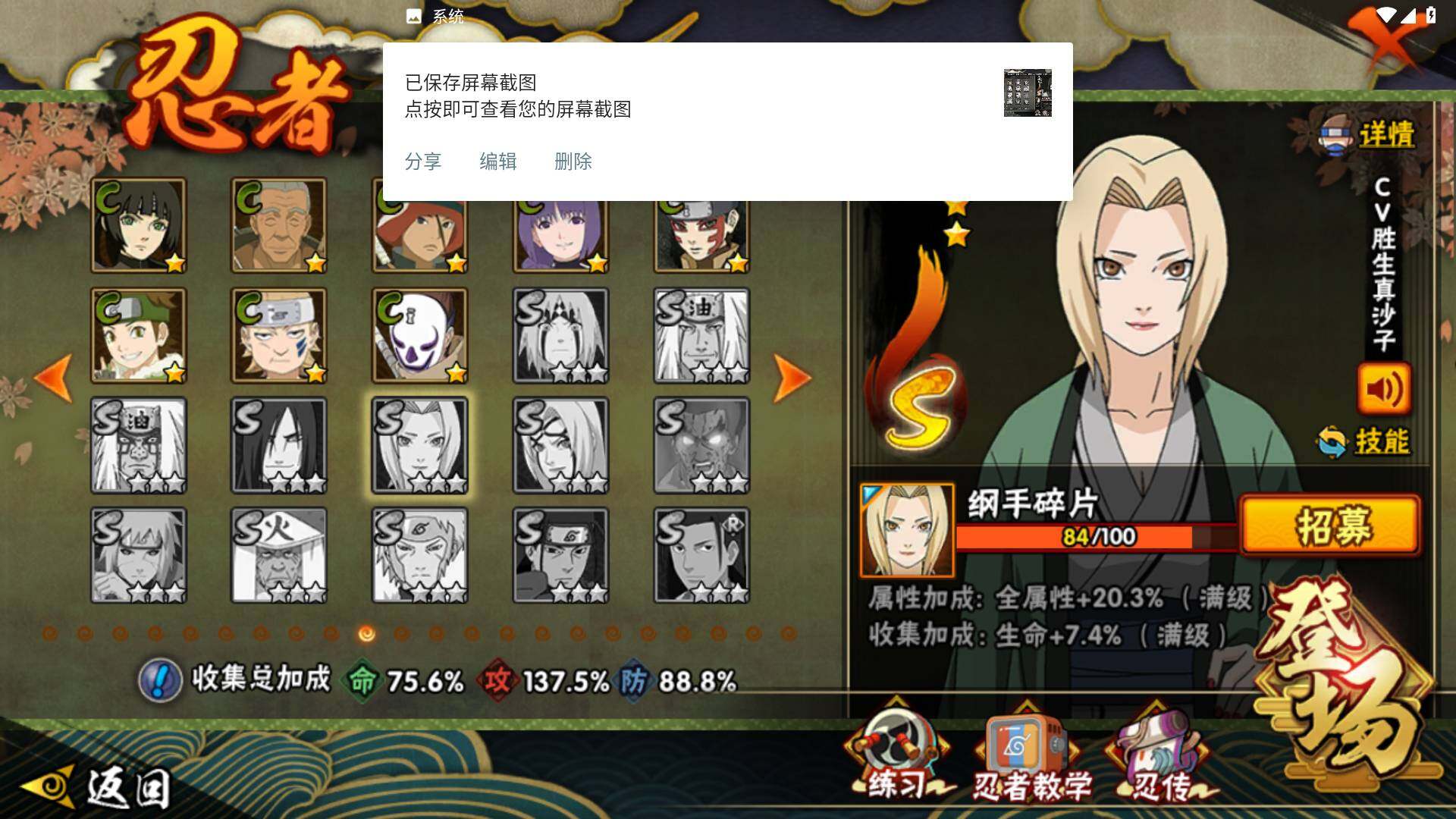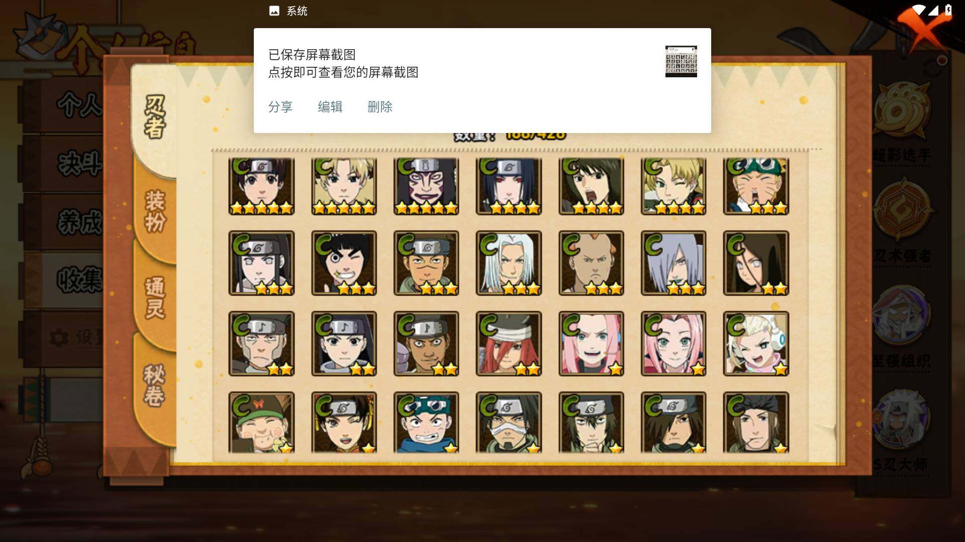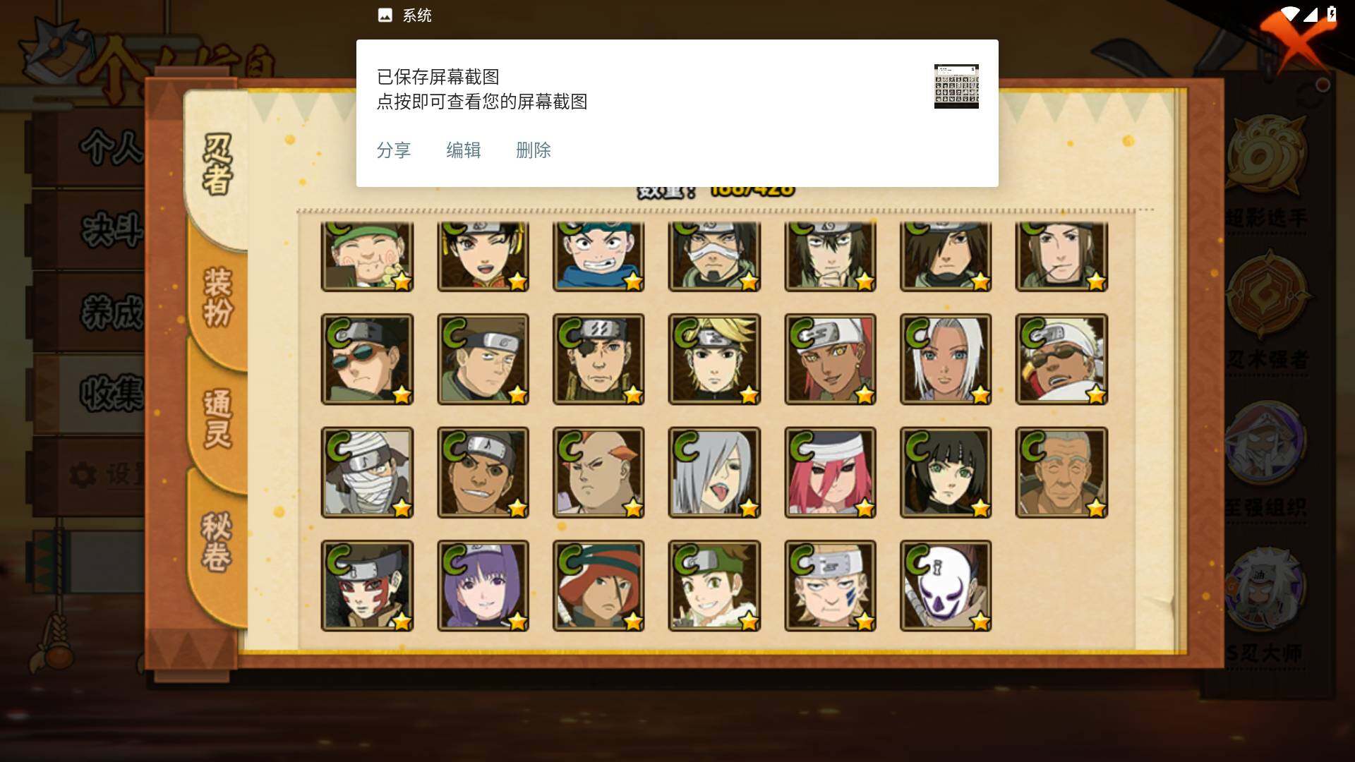 【S级忍者】:长门「秽土转生」(3星),猿飞日斩「秽土转生」(3星),千手扉间「秽土转生」(3星),宇智波斑「秽土转生·解」(3星),艾「忍界大战」(3星),宇智波鼬「须佐能乎」(3星),旗木卡卡西「须佐能乎」(3星),自来也「舞之豪杰」(3星),自来也「传说中的三忍」(3星),