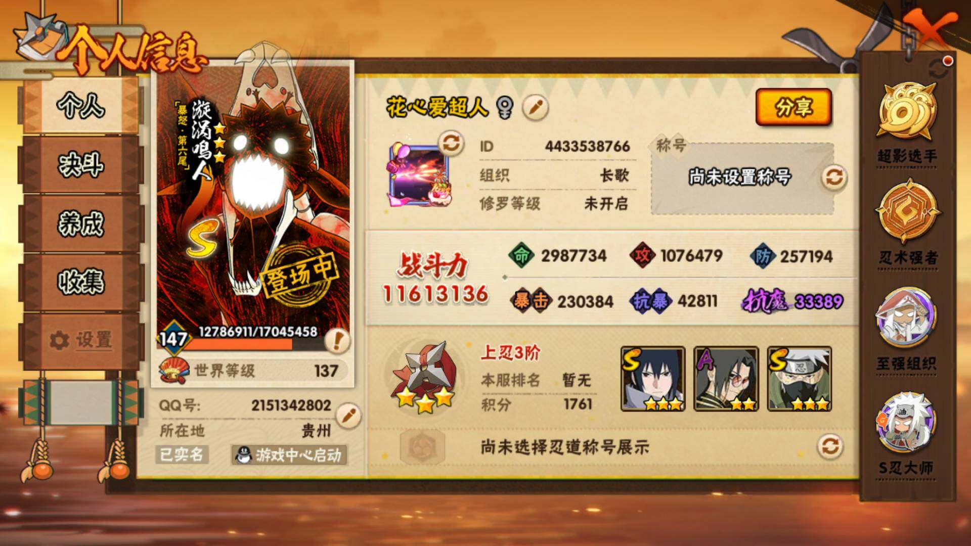 (可免费转苹果)v11 20S 44A 1161万战力 有熊猫 5300金币 大蛇丸87片 纲手84片 zp3507
