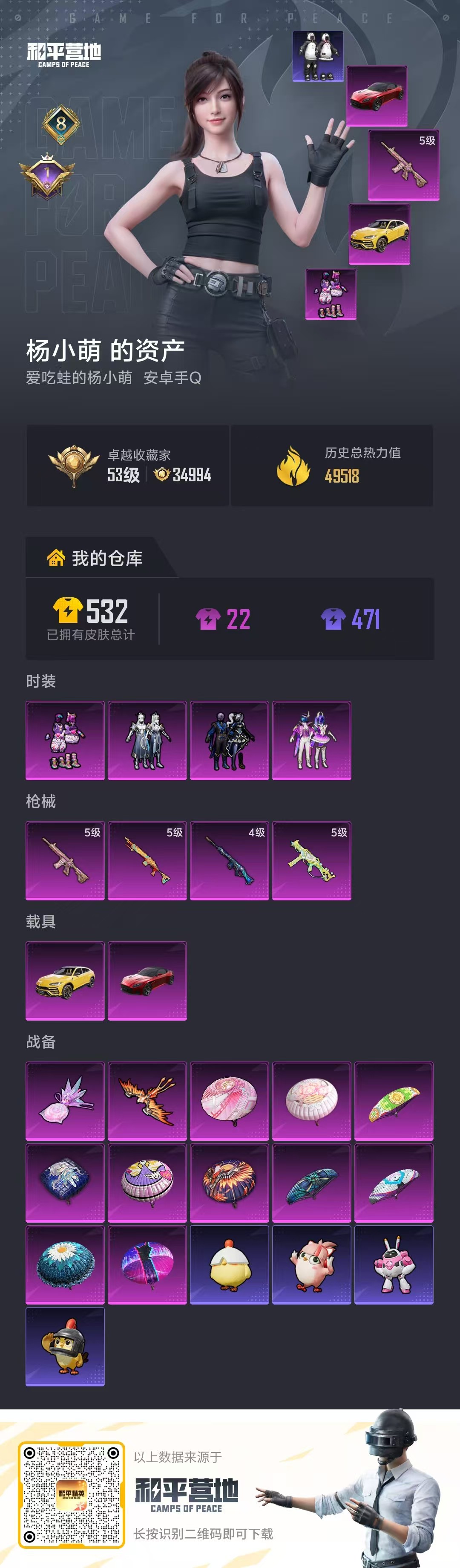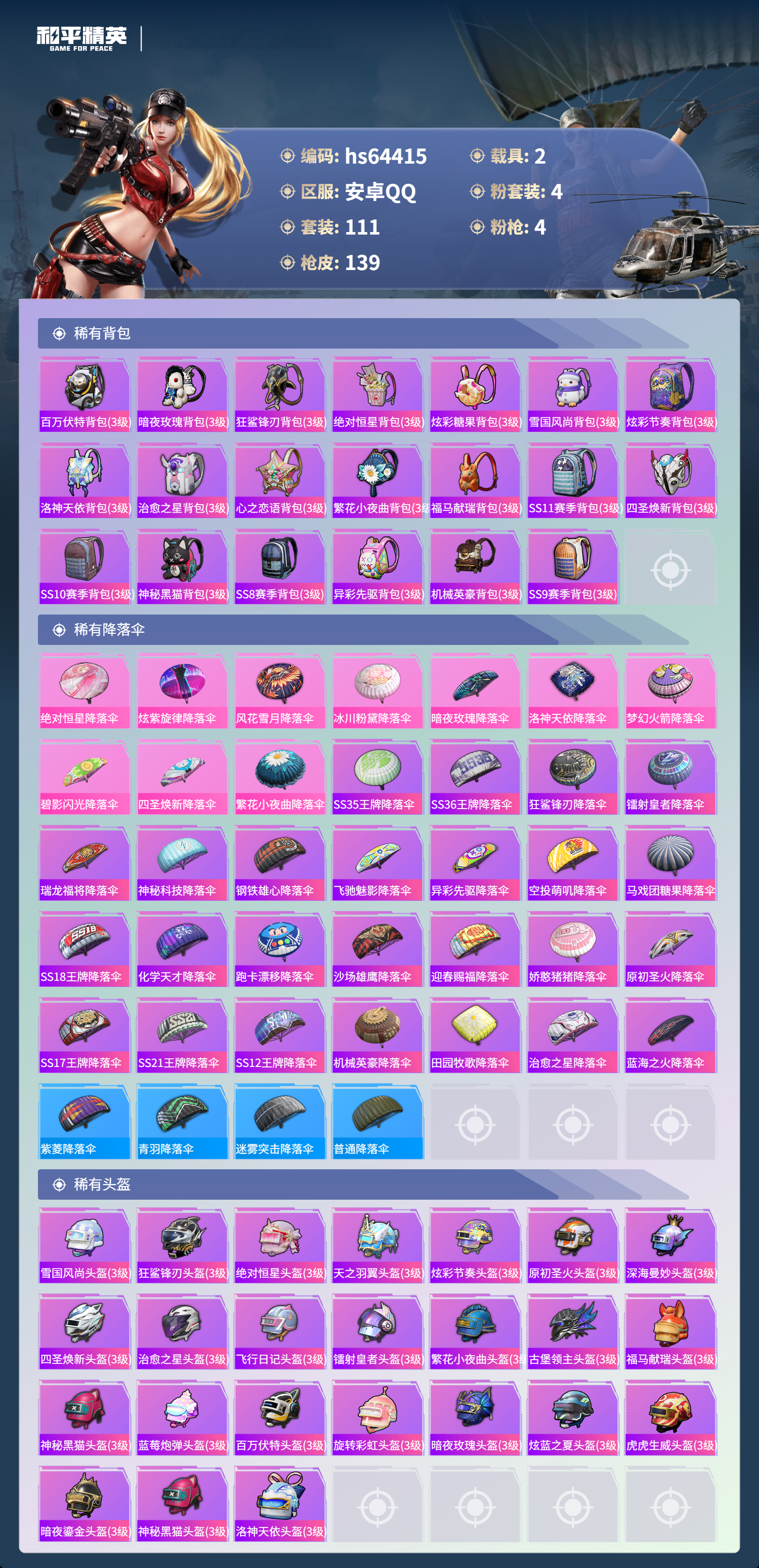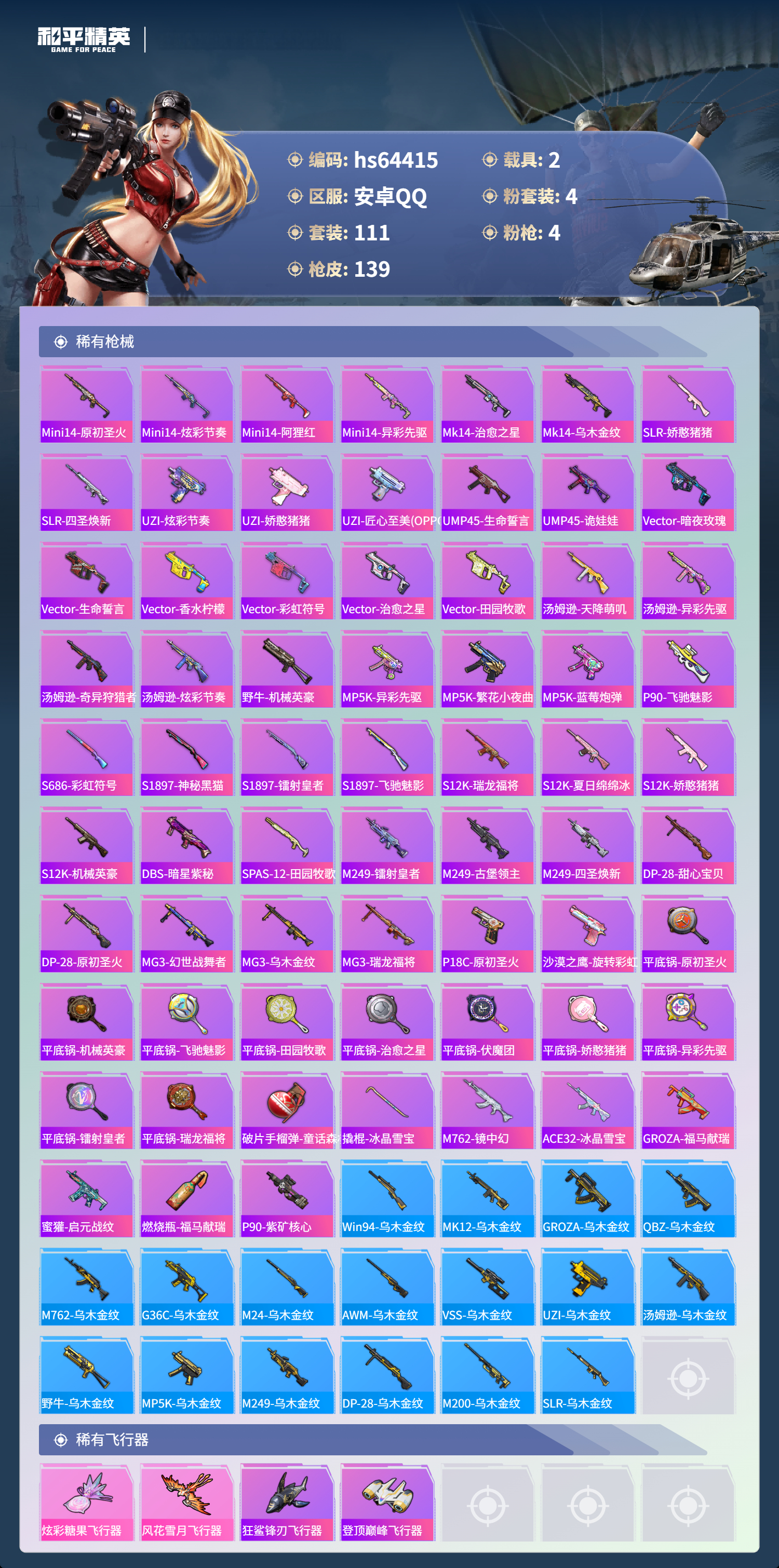 hs64415 安卓手Q-8王牌印记-4粉装-4特效枪-2载具-49518热力值-111套装-139枪皮-1卓越印记