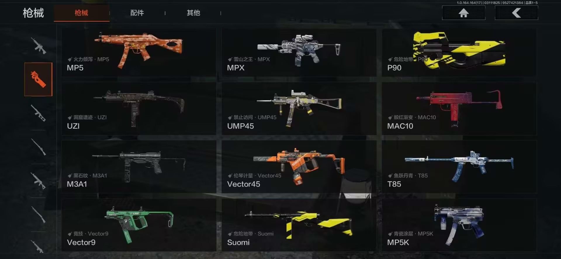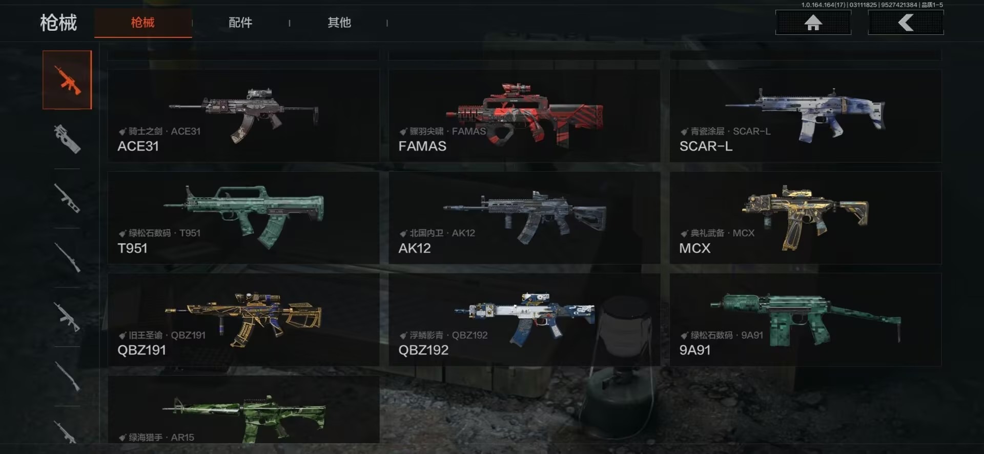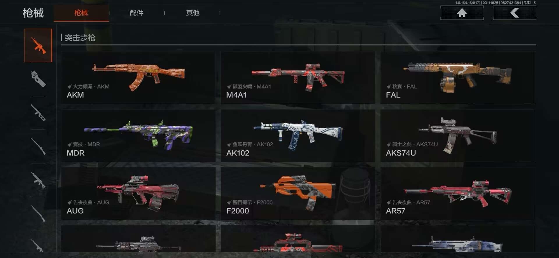 【紫色枪皮】典礼武备·MCX,伦琴计量·Vector45,鱼跃丹青·T85,鱼跃丹青·AK102,骤羽尖啸·FAMAS,骤羽尖啸·M4A1,竞技·MDR,火力倾泻·AKM,骑士之剑·AKS74U,骑士之剑·ACE31,雪山之王·M
