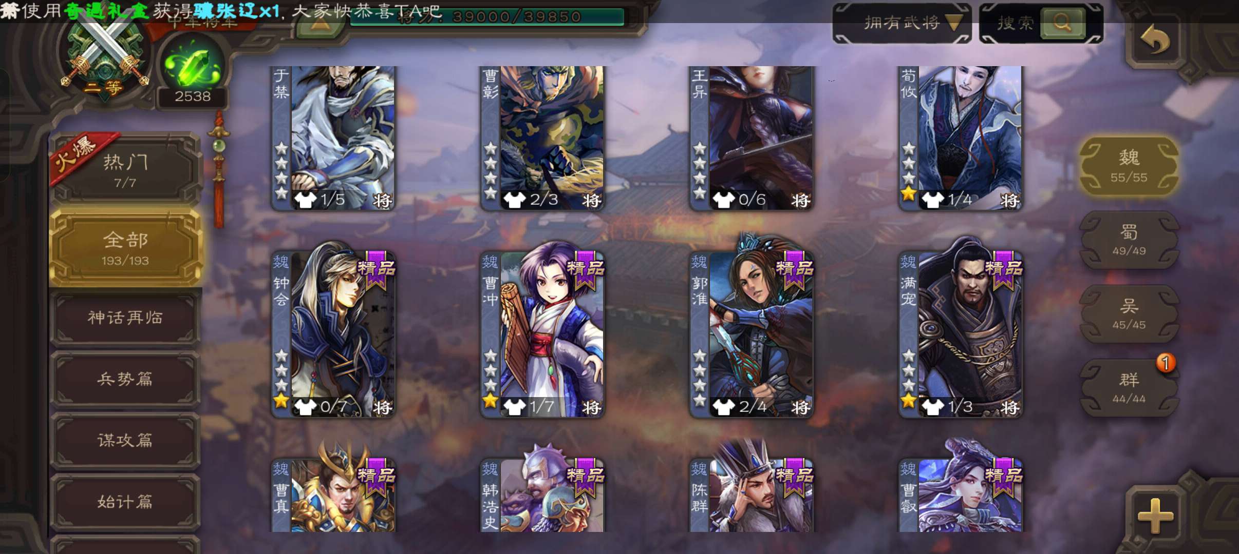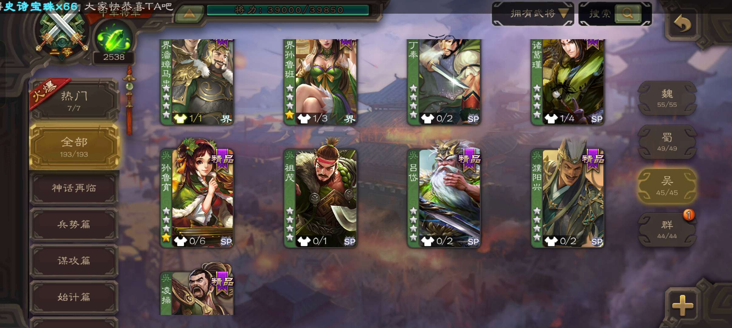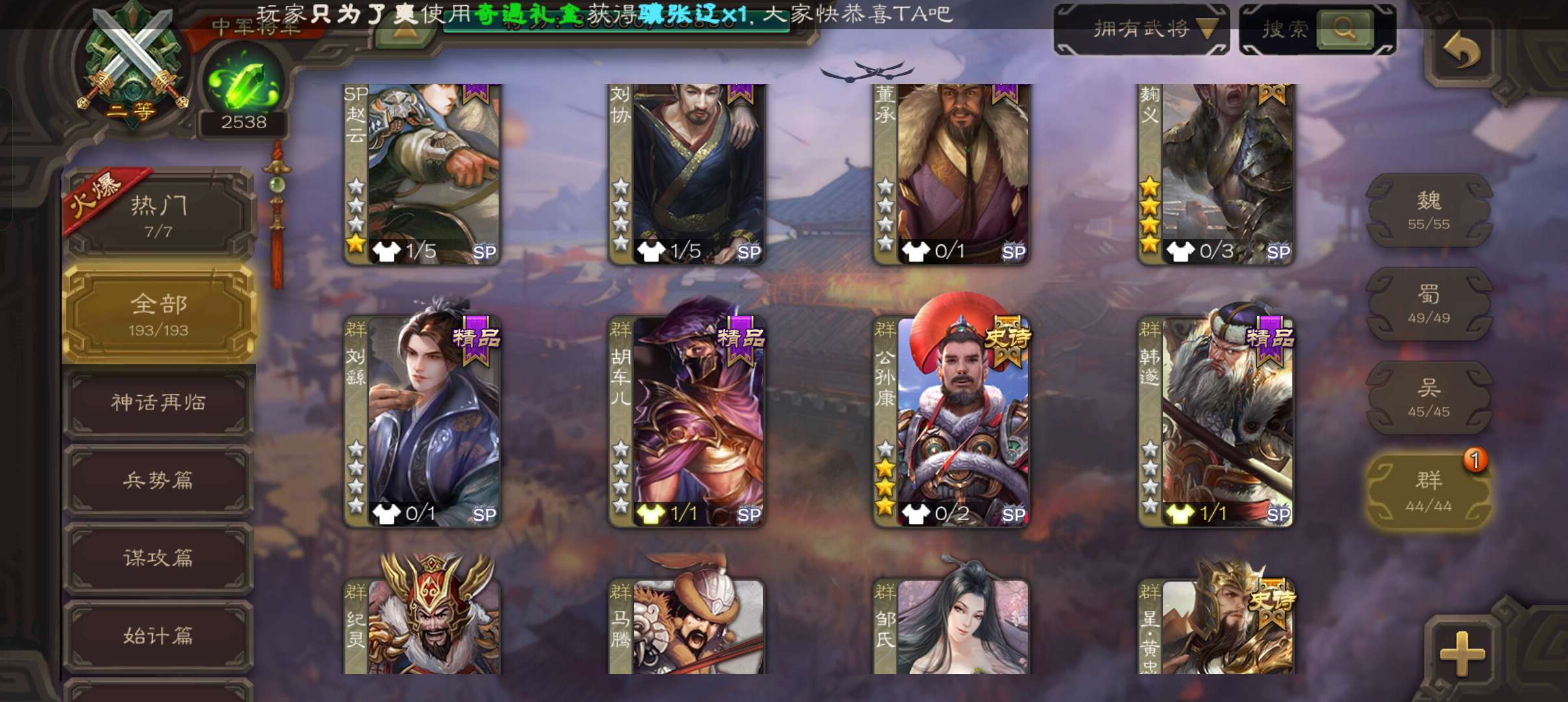 7史诗中军,2500魂,玉龙关索玉龙白马回廊星黄忠星周不疑公孙左慈程昱,谋张飞sp赵云谋卢植193将