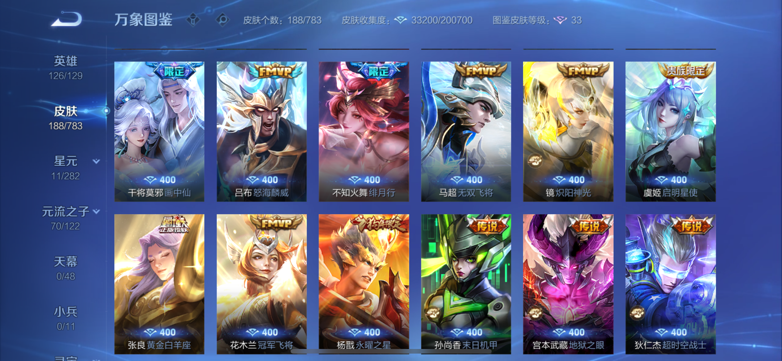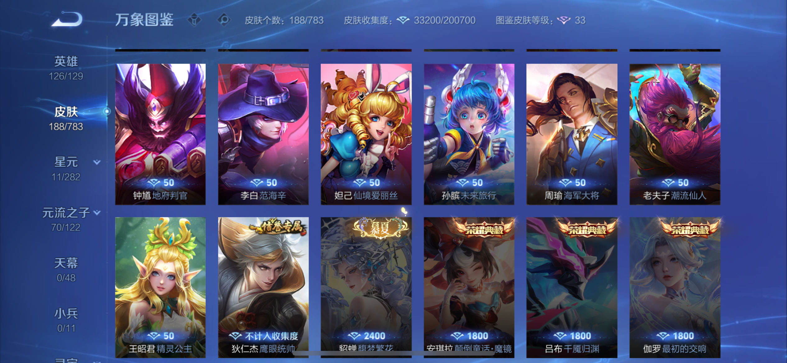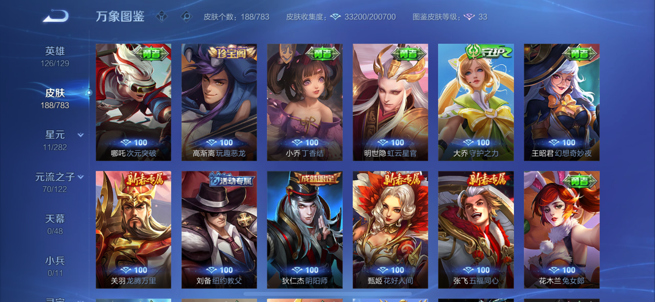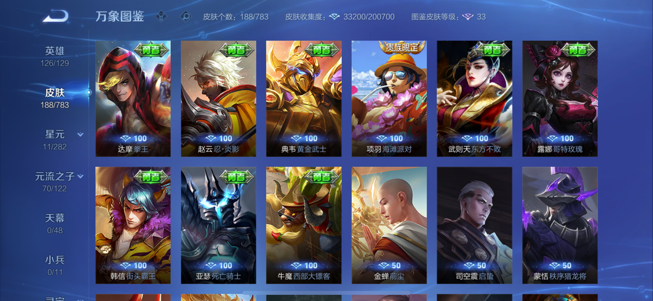 V8 皮肤188 英雄126 至圣王者 荣耀典藏1 珍品传说2 星传说2 传说22 其他皮肤168