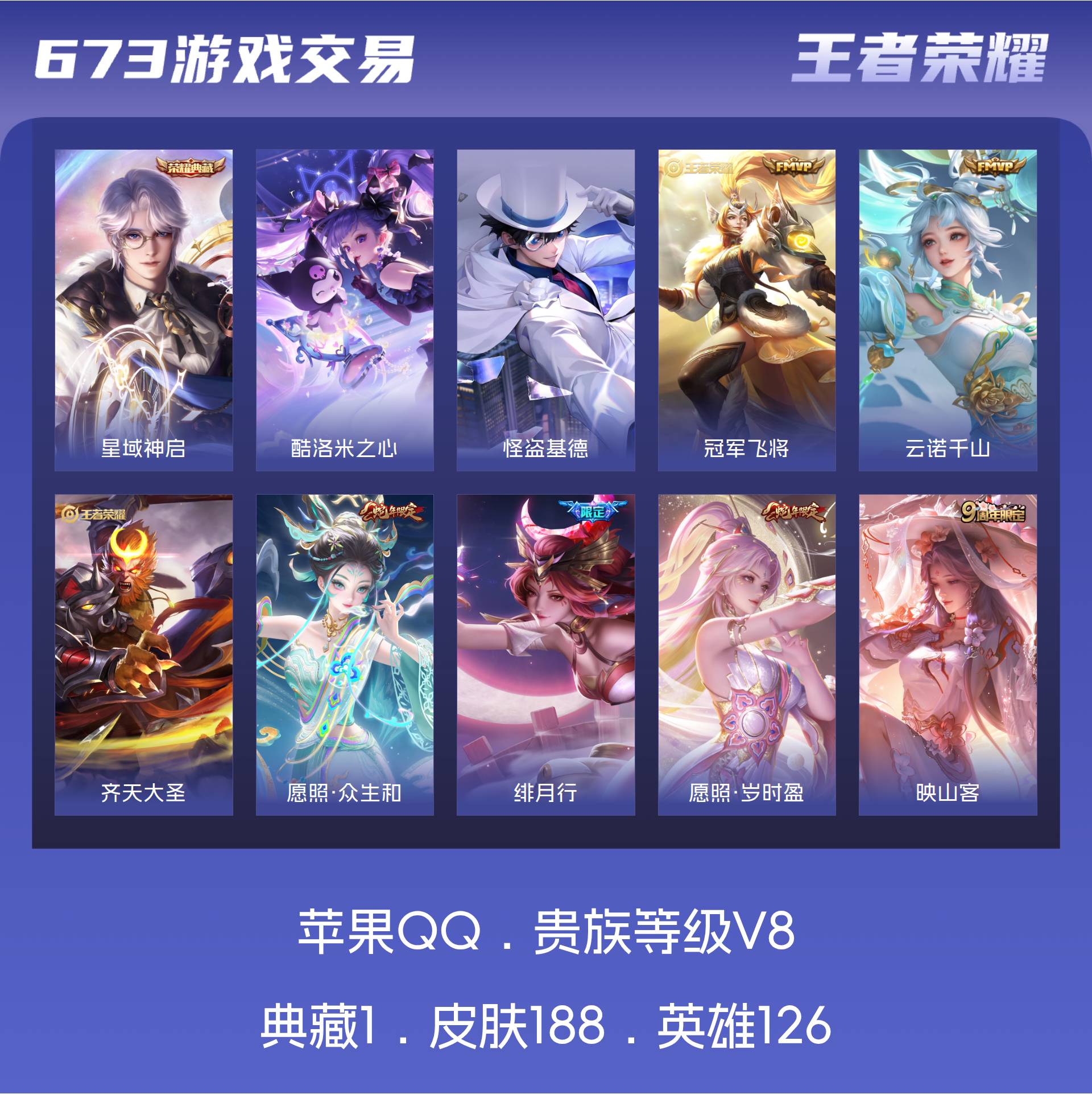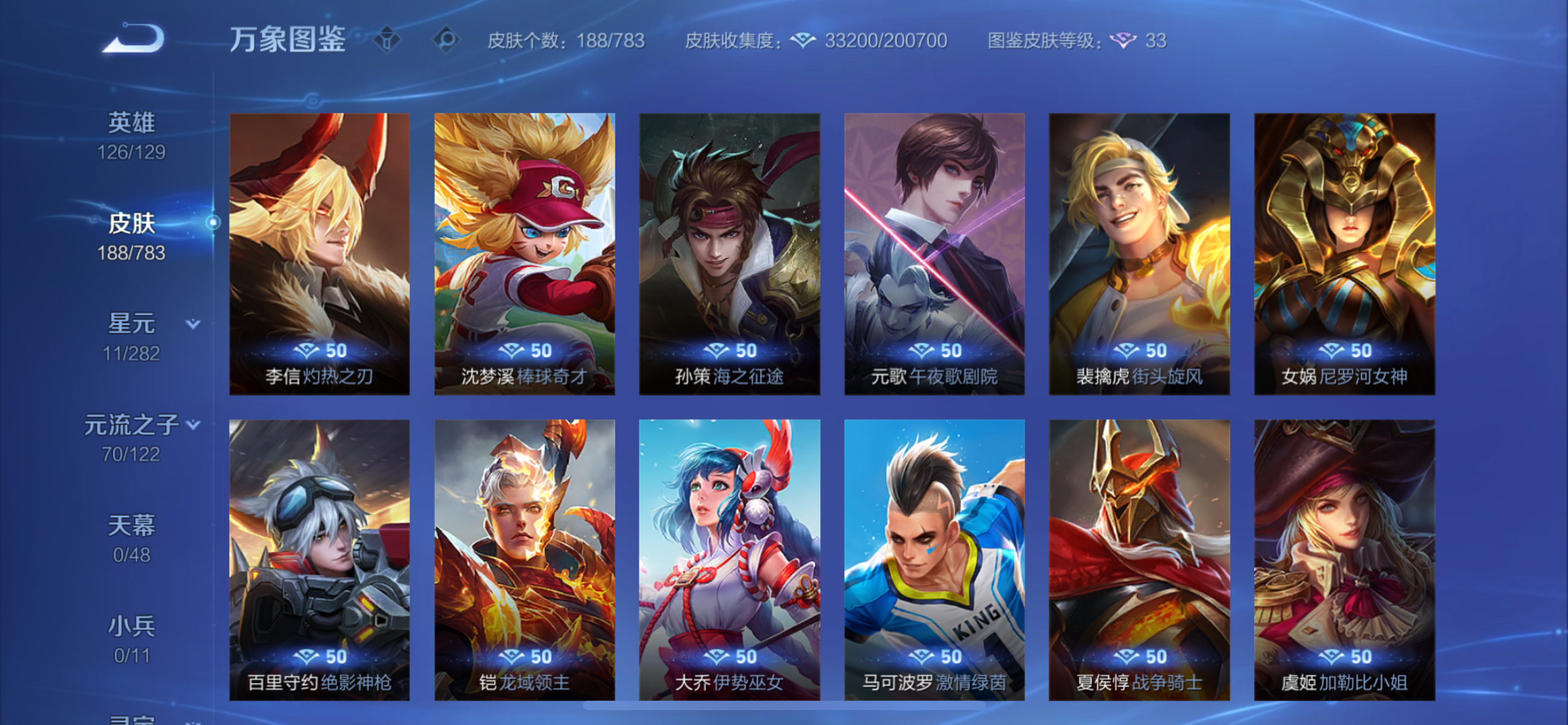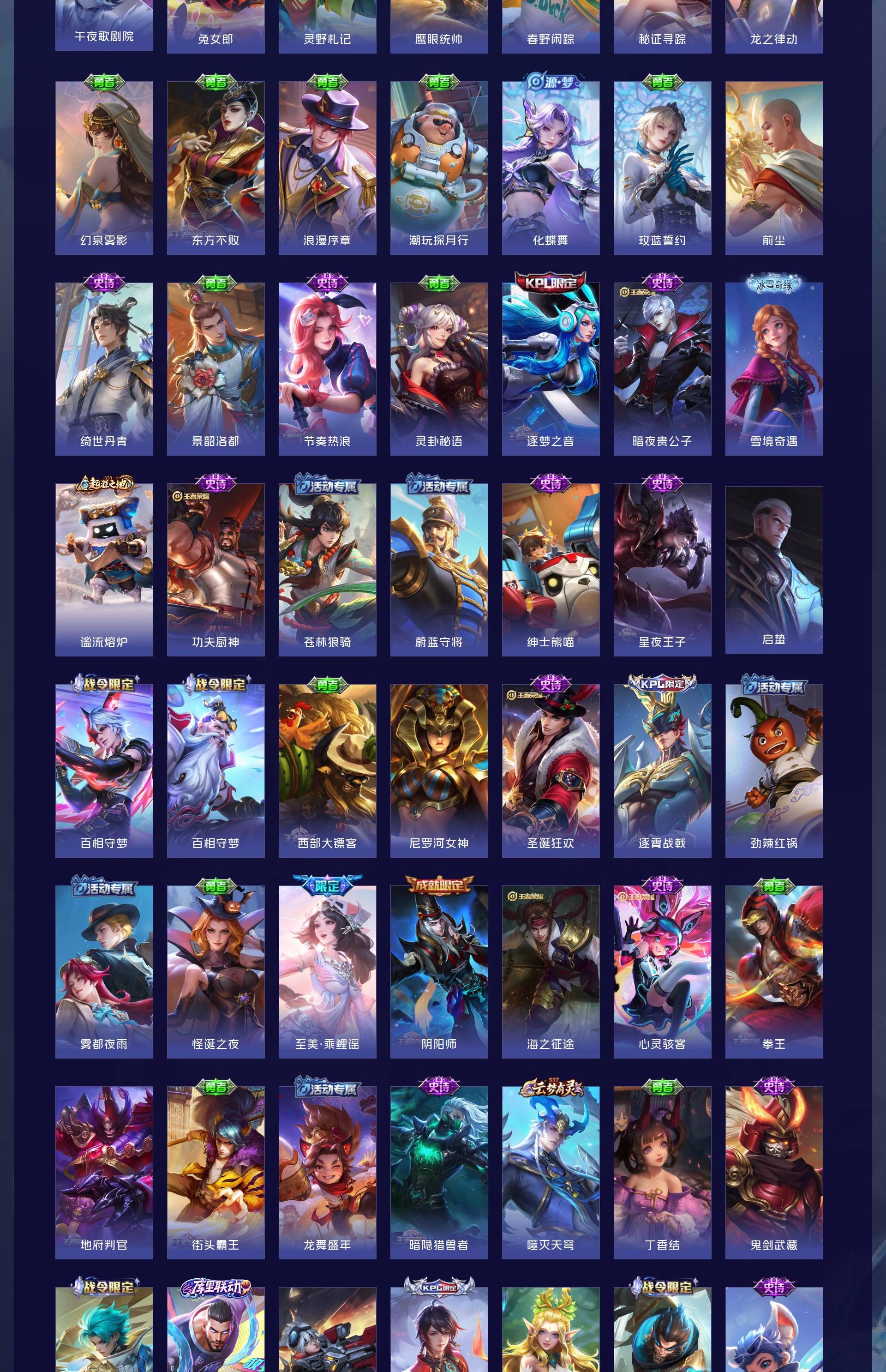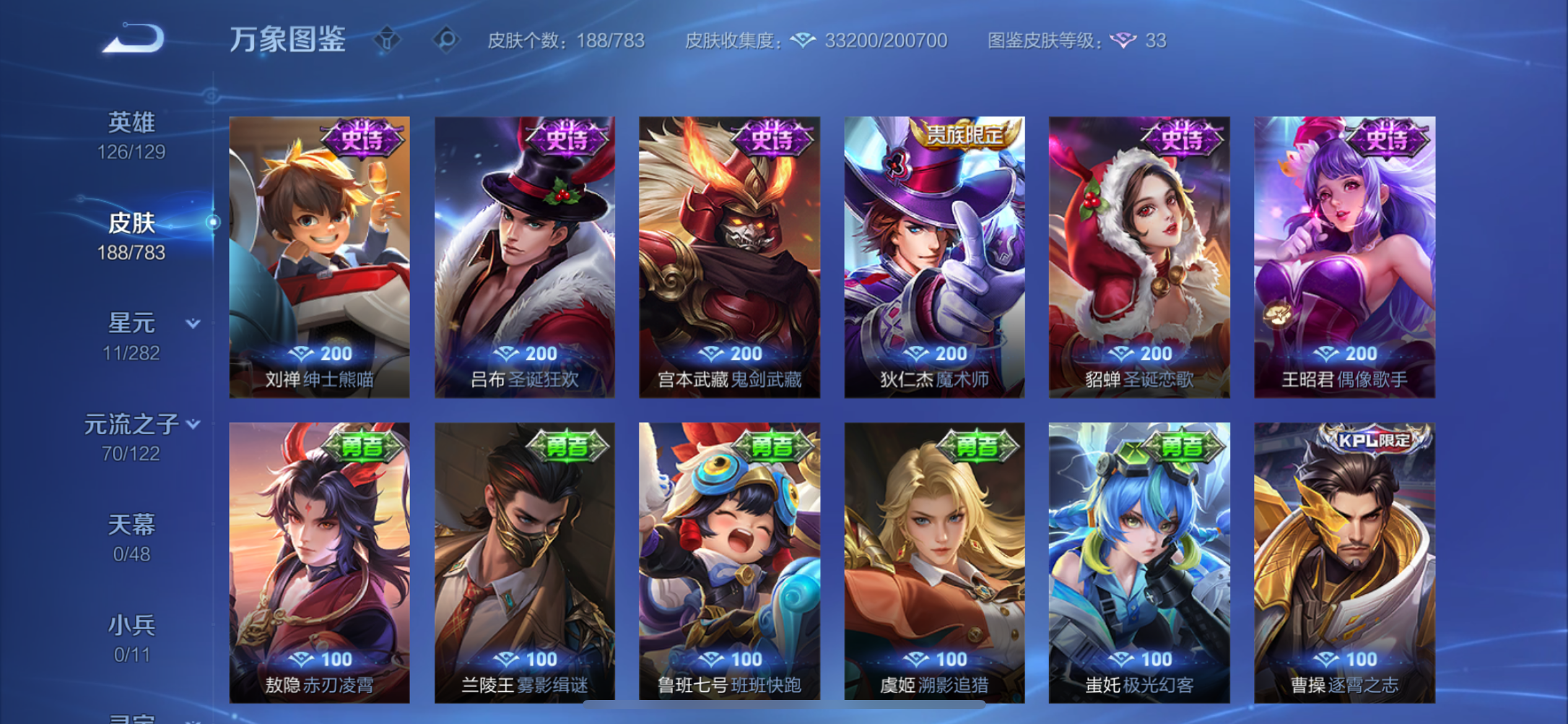 V8 皮肤188 英雄126 至圣王者 荣耀典藏1 珍品传说2 星传说2 传说22 其他皮肤168