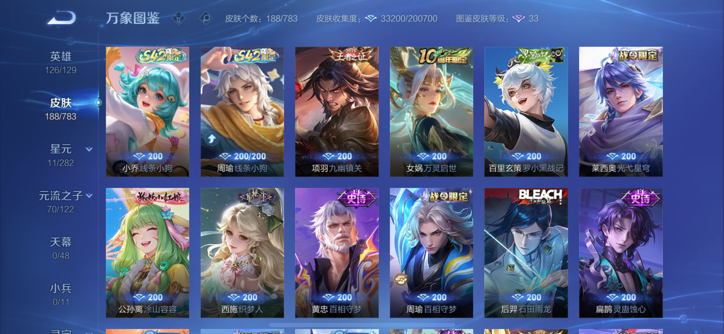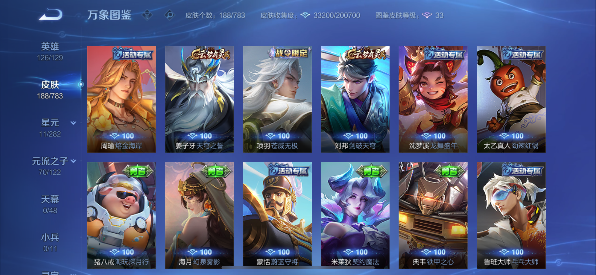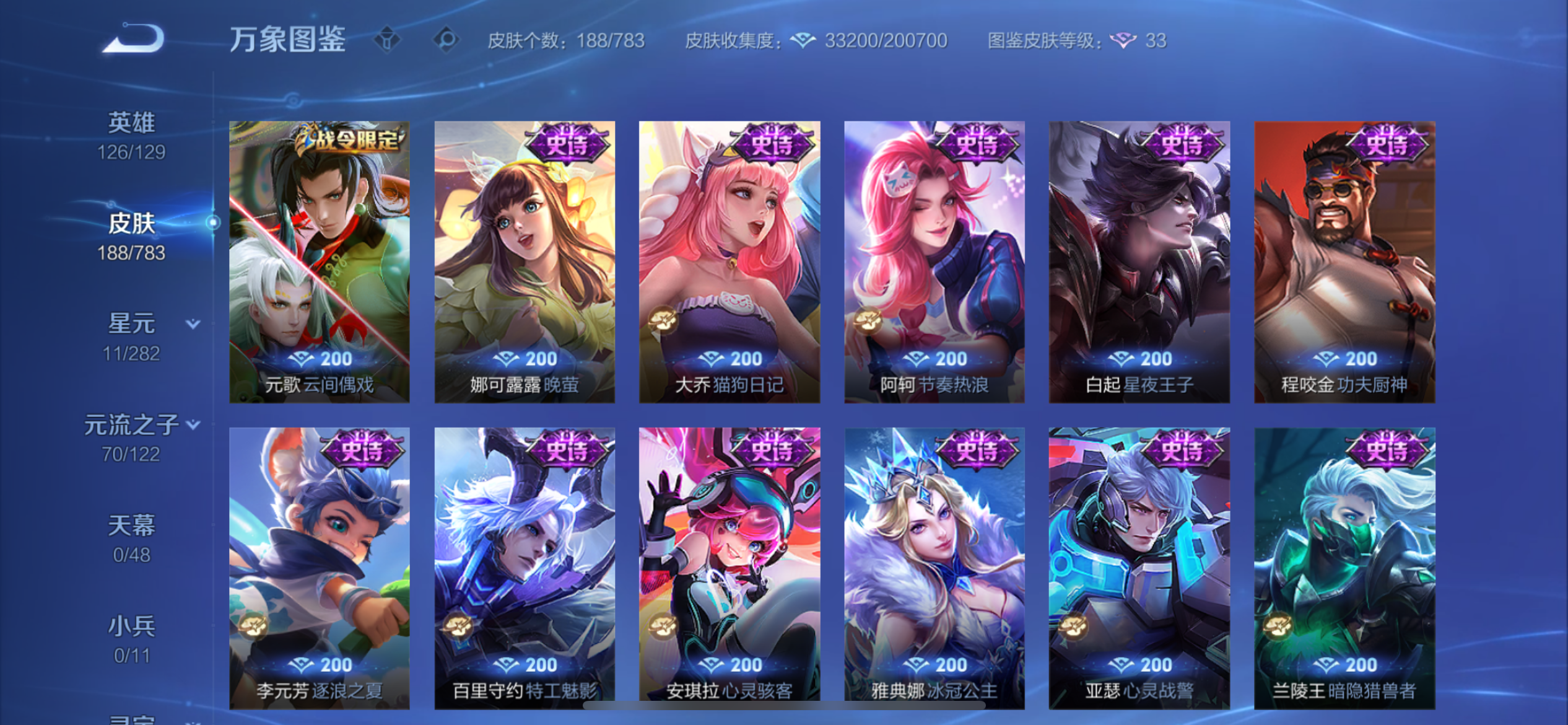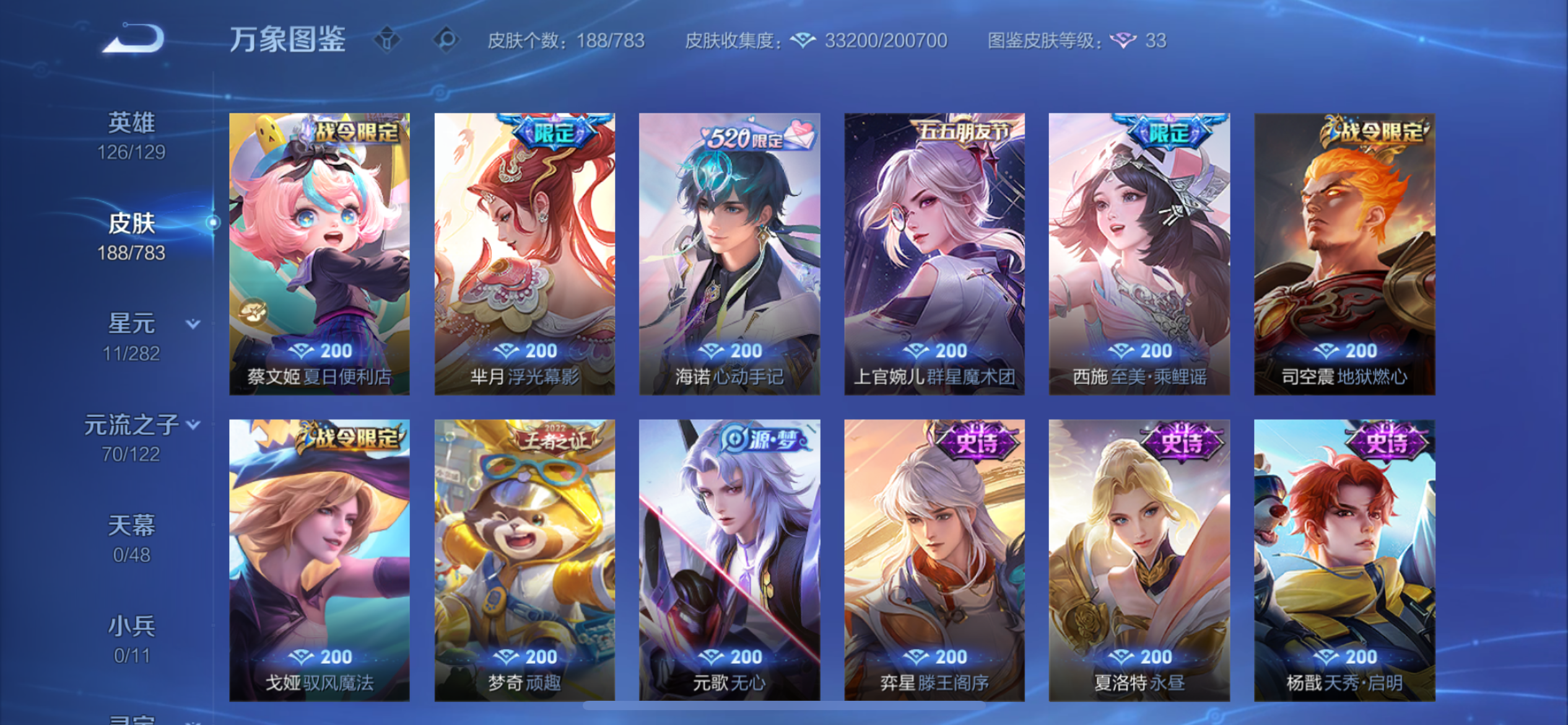 V8 皮肤188 英雄126 至圣王者 荣耀典藏1 珍品传说2 星传说2 传说22 其他皮肤168