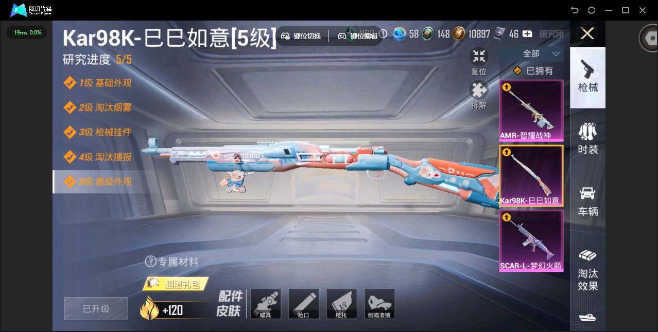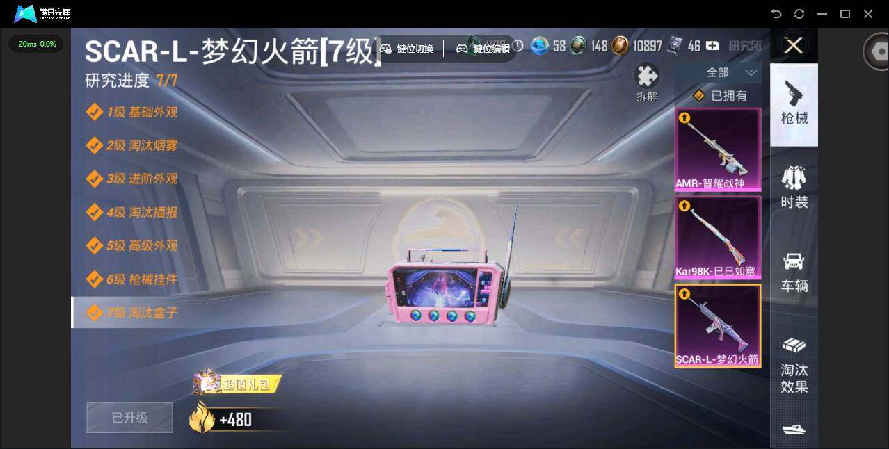 【粉色枪皮等级】:SCAR-L-梦幻火箭(七级),Kar98K-巳巳如意(五级),AMR-智耀战神(五级)