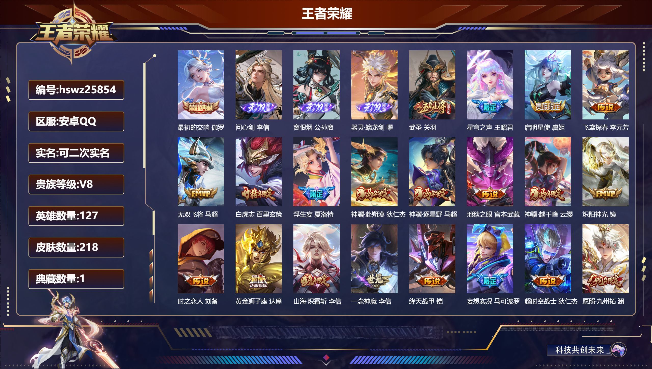 安卓QQ/荣耀王者/218皮肤/127英雄/1典藏/0珍品无双/3无双/0珍品传说/22传说/61史
