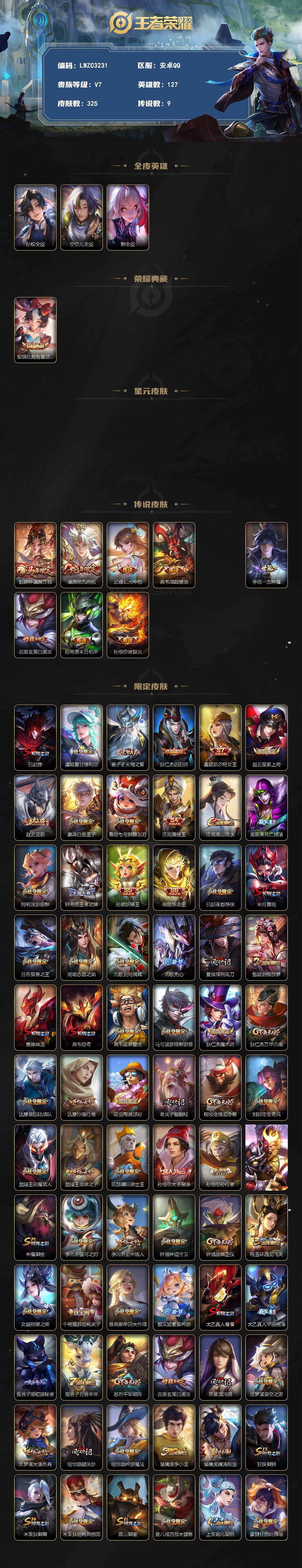 可二次【特价出售/店主推荐】安卓Q-V7-至尊星耀II段位-127英雄-325皮肤-1典藏皮肤-2星传说-9传说-82史诗【英雄全皮】:孙权全皮,空空儿全皮,影全皮【荣耀典藏】:安琪拉颠倒童话魔镜【传说皮肤】:貂蝉神骥聚万邦,澜愿照九州拓,云缨幻光神枪,典韦战鼓燎原,孙悟空齐天大圣,李信一念神魔,百里玄策白虎志,孙尚香末日机甲,孙悟空地狱火【限定皮肤】:白起狰,虞姬夏日便利店,姜子牙天穹之誓,狄仁杰阴阳师,虞姬凯尔特女王,赵云皇家上将,赵云龙胆,嬴政白昼王子,鲁班七号狮舞东方,庄周蜃楼王,庄周高
