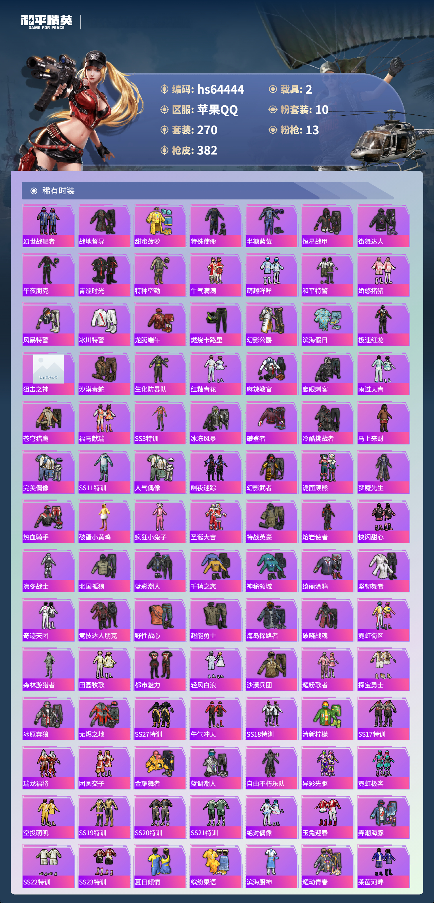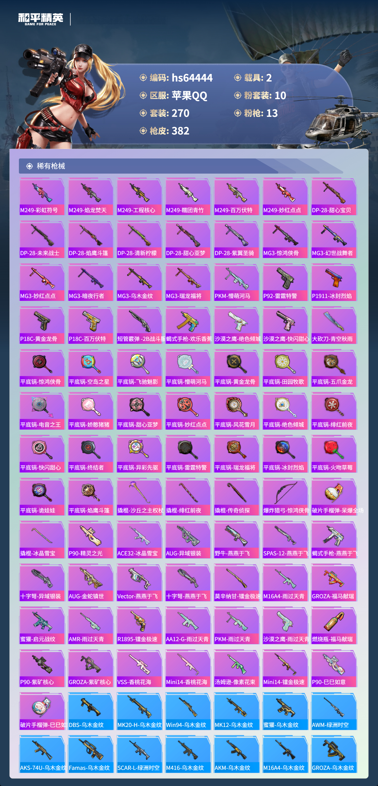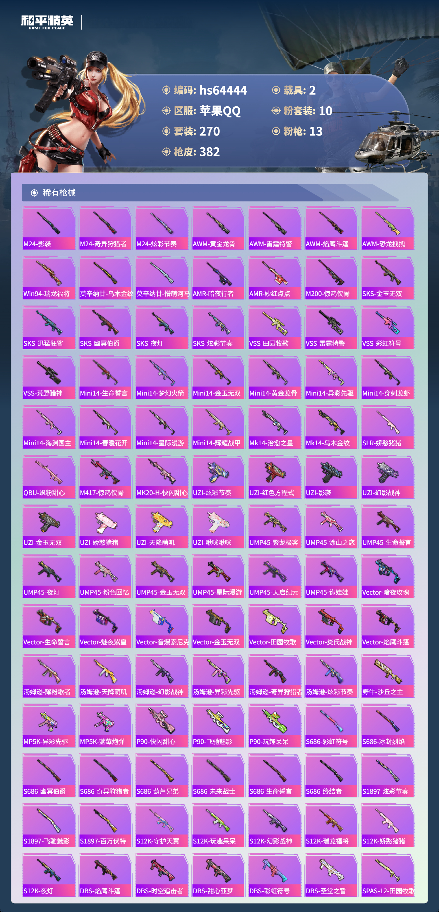 hs64444 苹果手Q-13王牌印记-1红装-10粉装-13特效枪-2载具-热力值-270套装-382枪皮-5卓越印记-2传奇印记