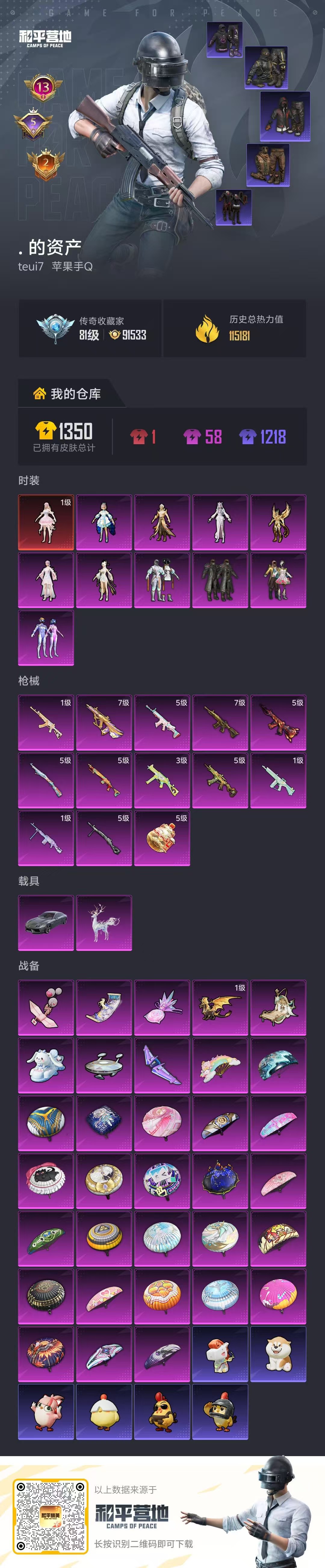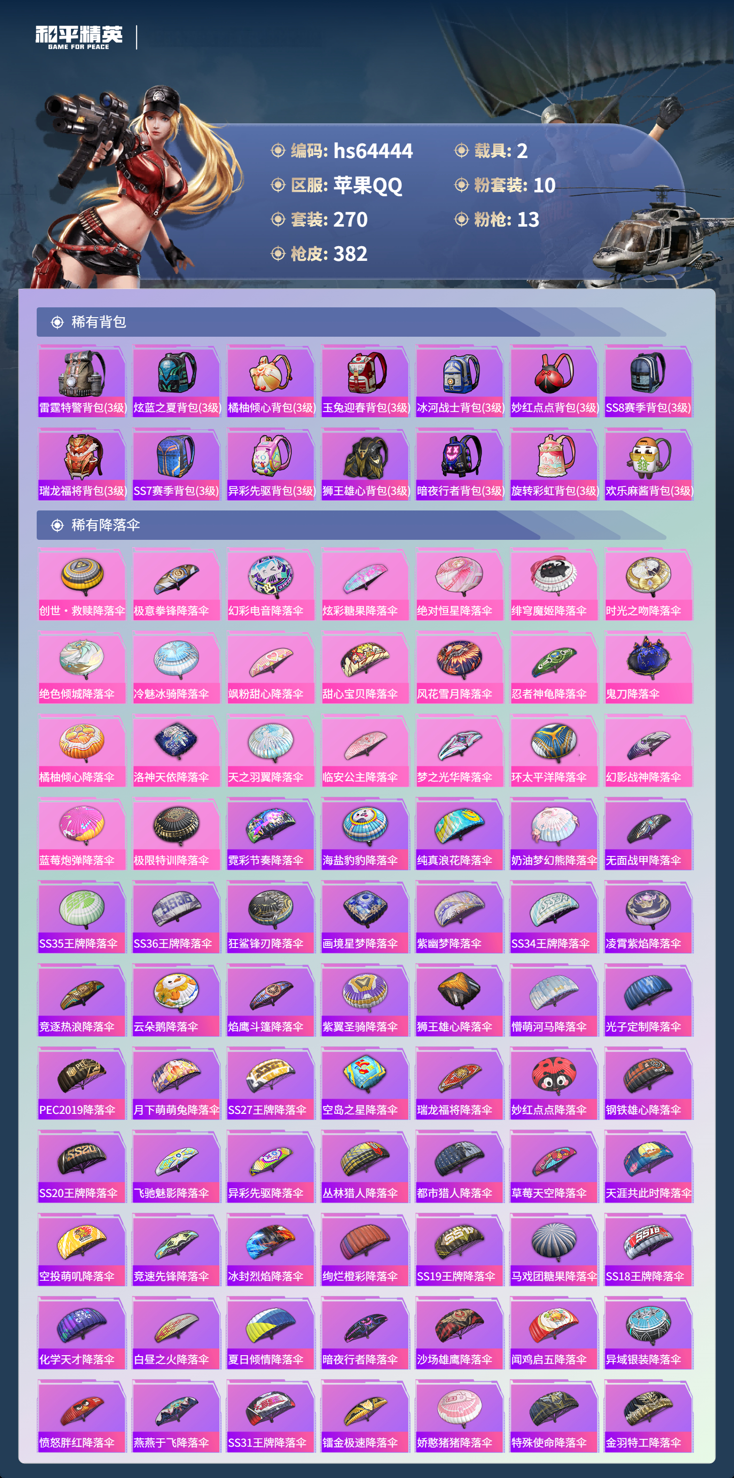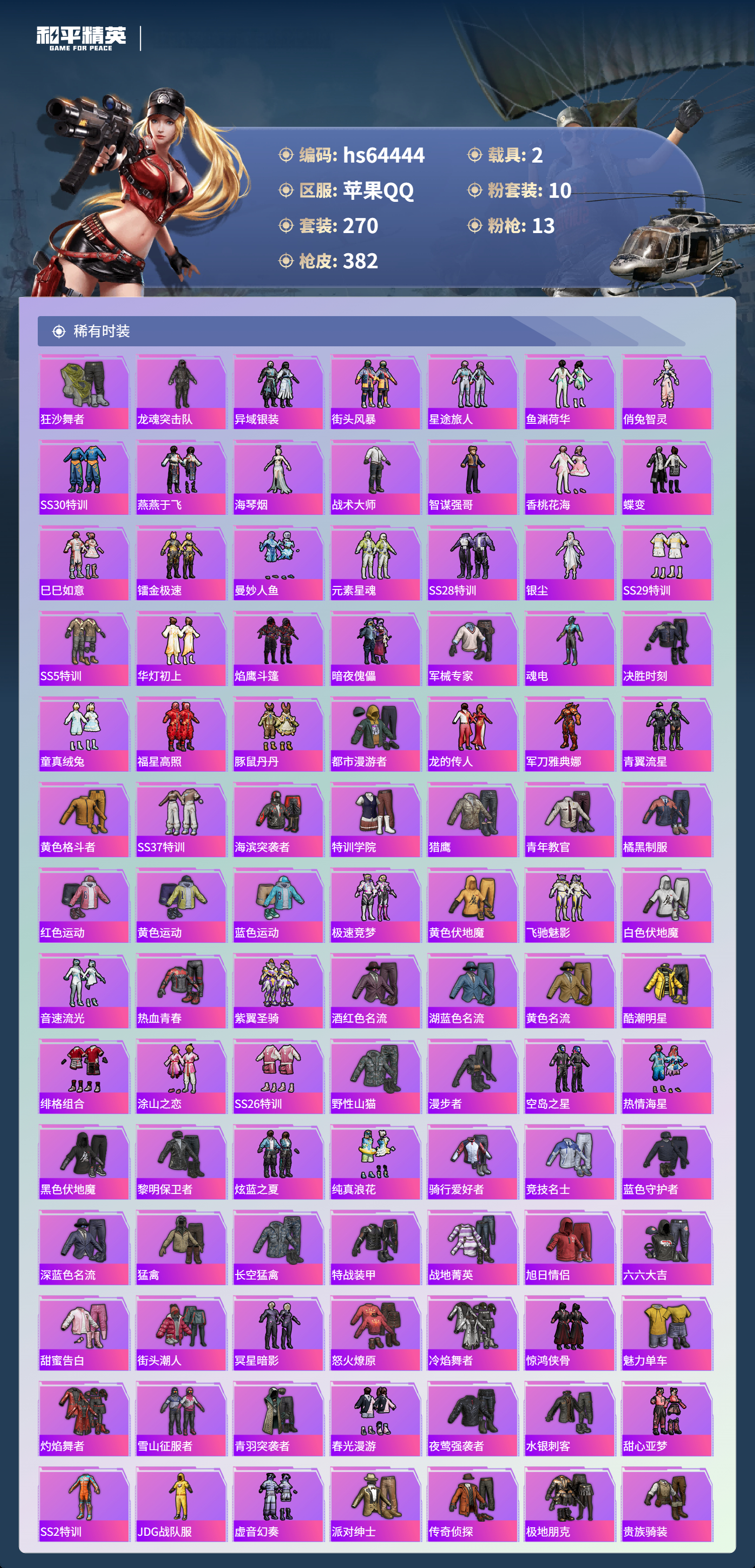 hs64444 苹果手Q-13王牌印记-1红装-10粉装-13特效枪-2载具-热力值-270套装-382枪皮-5卓越印记-2传奇印记