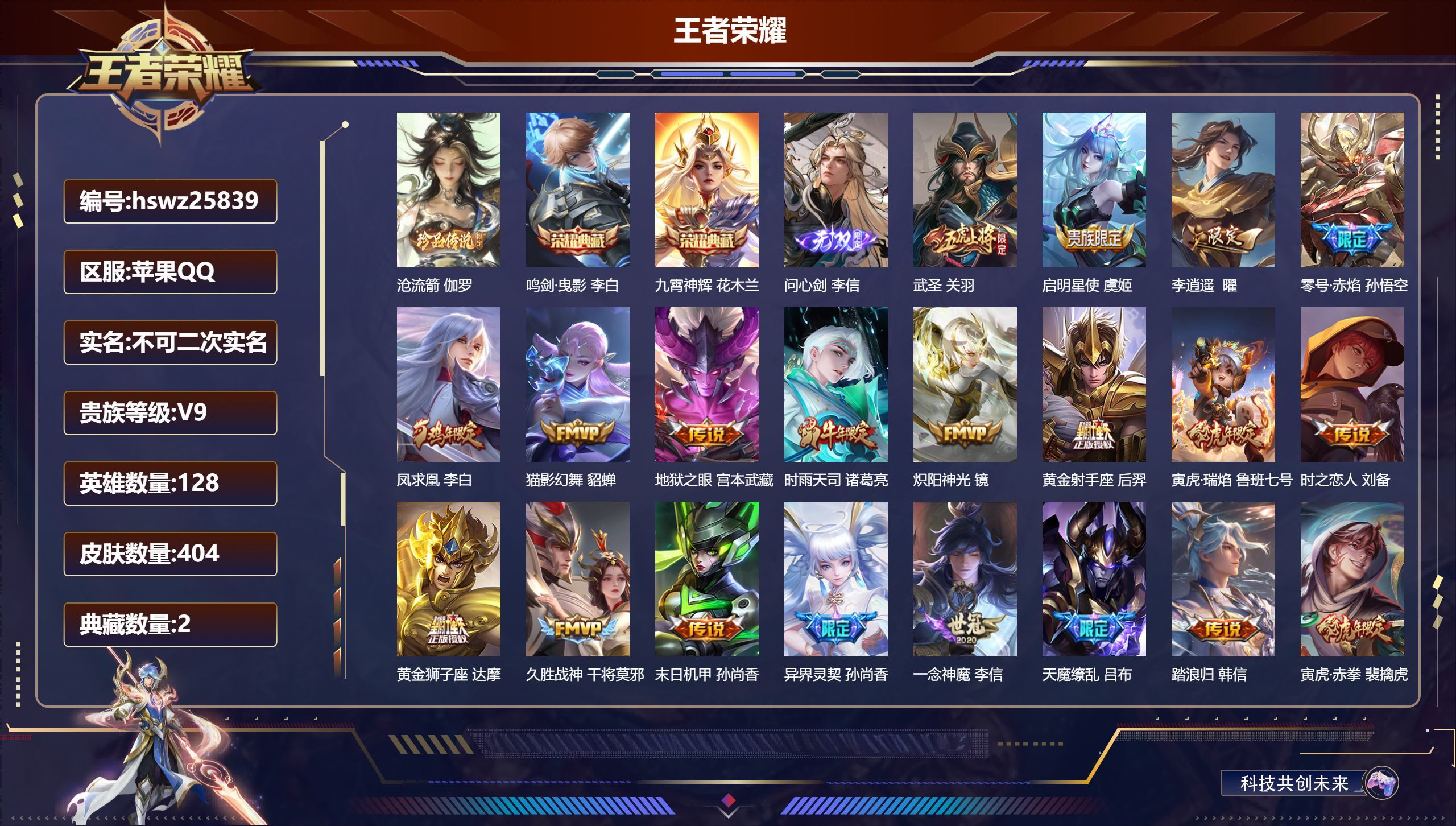 苹果QQ/最强王者/404皮肤/128英雄/2典藏/0珍品无双/1无双/1珍品传说/23传说/128