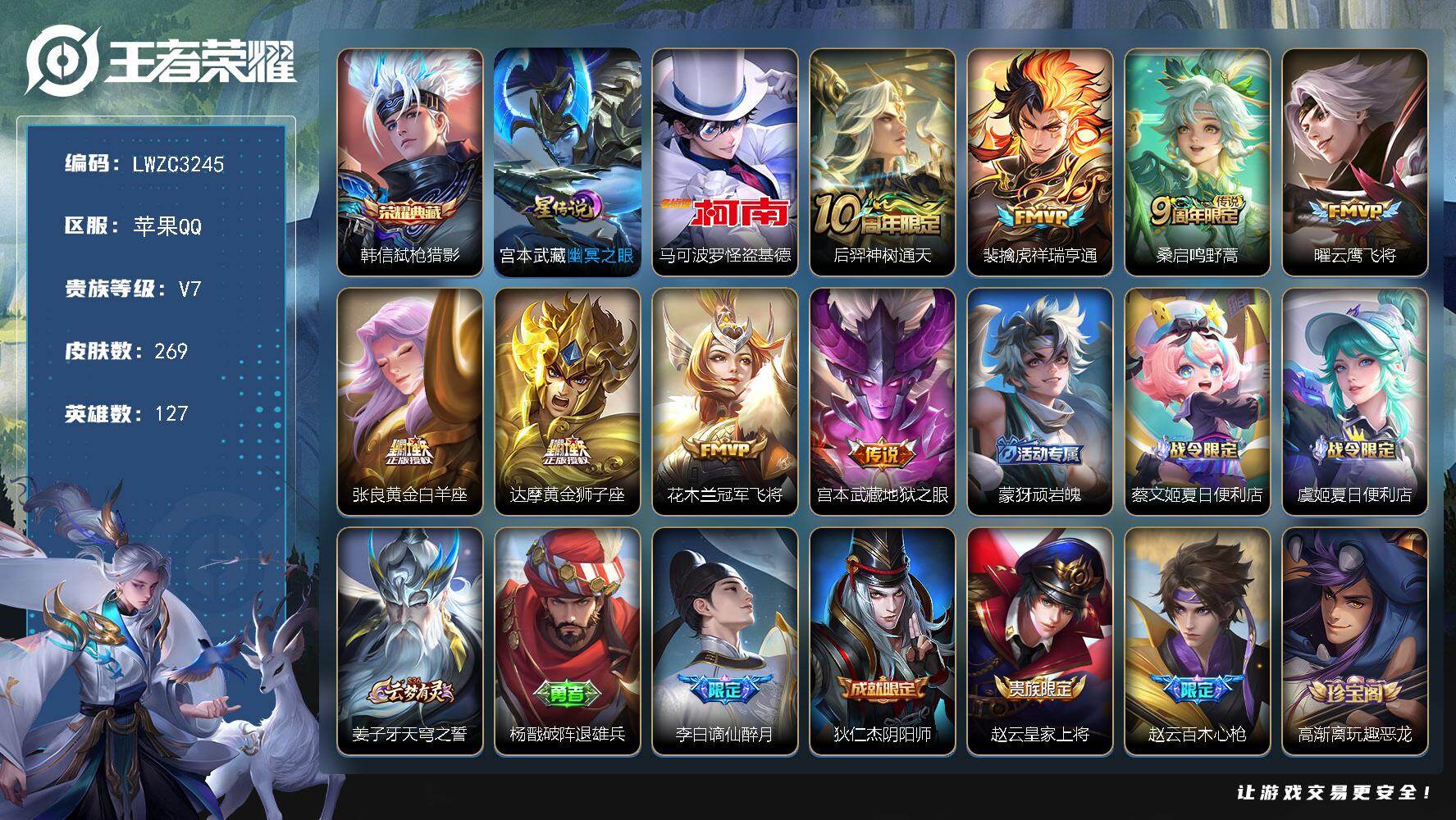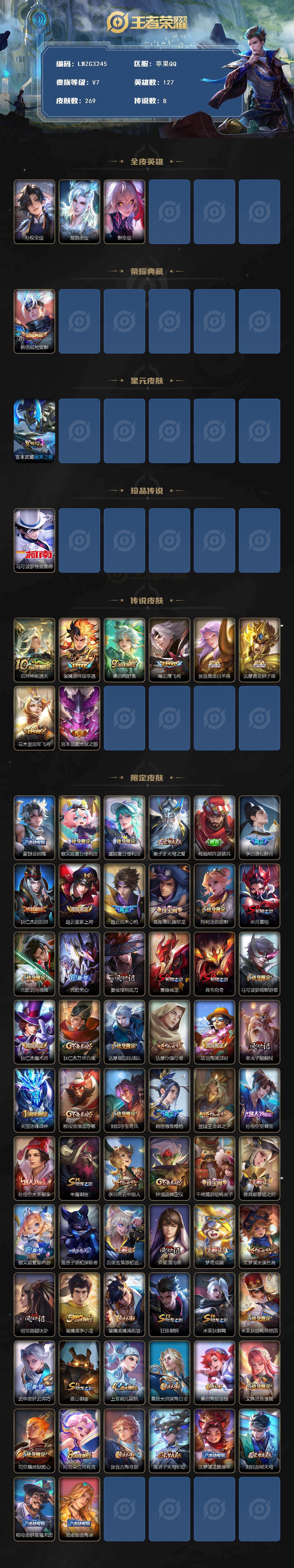 【特价出售/店主推荐/3市标】:苹果Q-V7-最强王者段位-127英雄-269皮肤-1典藏皮肤-1珍品传说-1星元-8传说-77史诗【英雄全皮】:孙权全皮,敖隐全皮,影全皮【荣耀典藏】:韩信弑枪猎影【珍品传说】:马可波罗怪盗基德【传说皮肤】:后羿神树通天,裴擒虎祥瑞亨通,桑启鸣野蒿,曜云鹰飞将,张良黄金白羊座,达摩黄金狮子座,花木兰冠军飞将,宫本武藏地狱之眼【限定皮肤】:蒙犽顽岩魄,蔡文姬夏日便利店,虞姬夏日便利店,姜子牙天穹之誓,杨戬破阵退雄兵,李白谪仙醉月,狄仁杰阴阳师,赵云皇家上将,赵云百