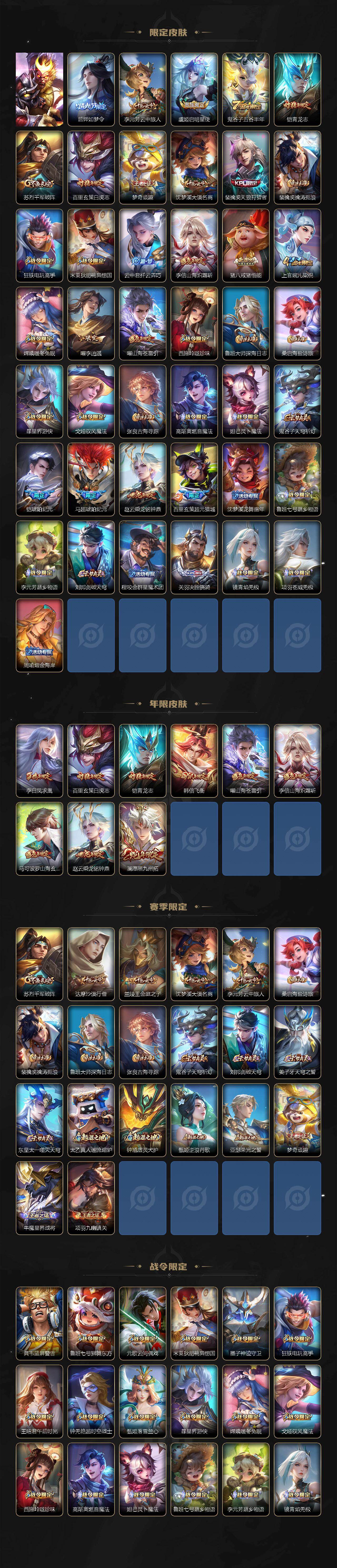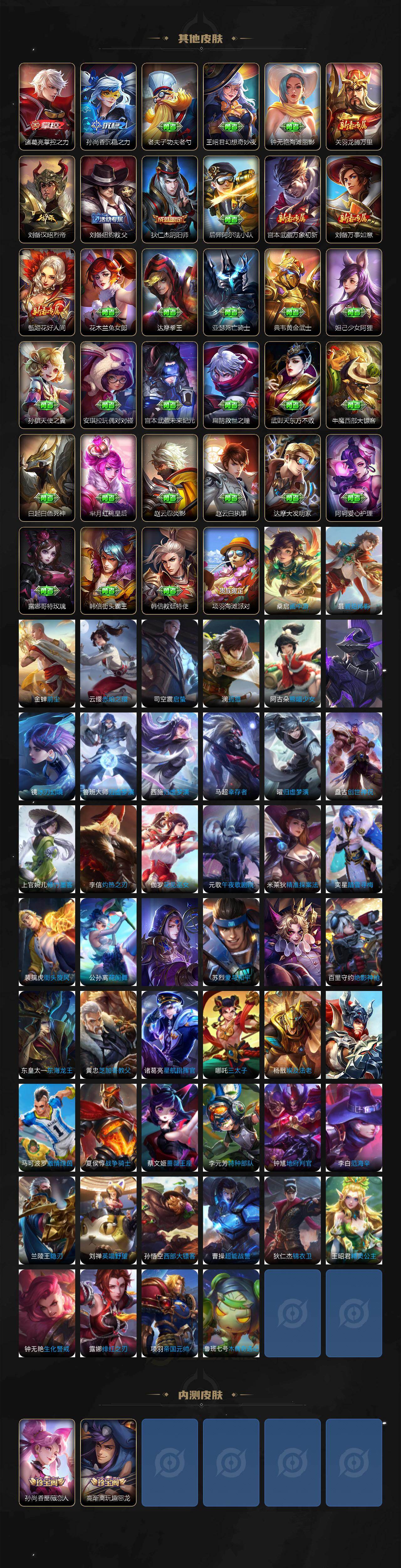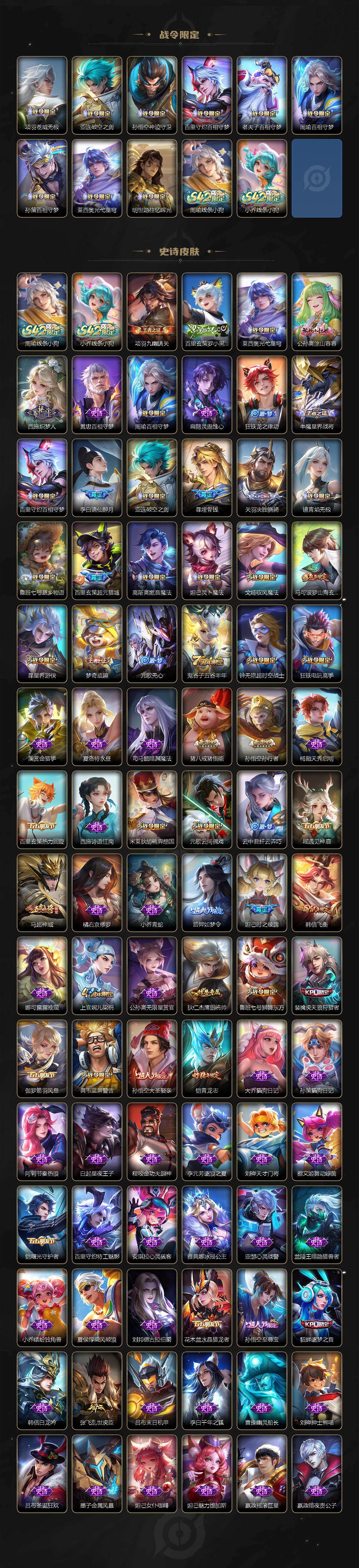 【传说皮肤】:关羽神骥镇沧海,澜愿照九州拓,桑启鸣野蒿,墨子黄金天蝎座,典韦战鼓燎原,赵云乘龙铭钟鼎,马超琥珀纪元,铠琥珀纪元,澜