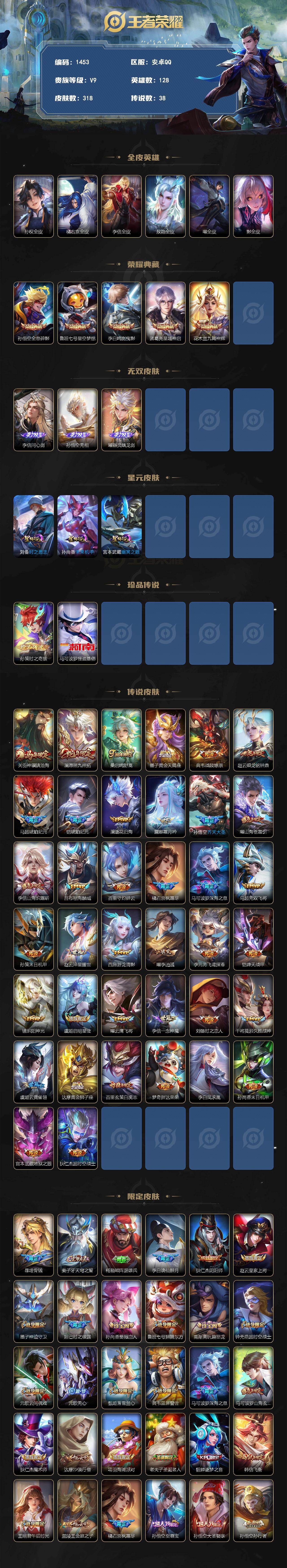 安卓Q-V9-最强王者段位-128英雄-318皮肤-5典藏皮肤-3无双-2珍品传说-38传说-102史诗