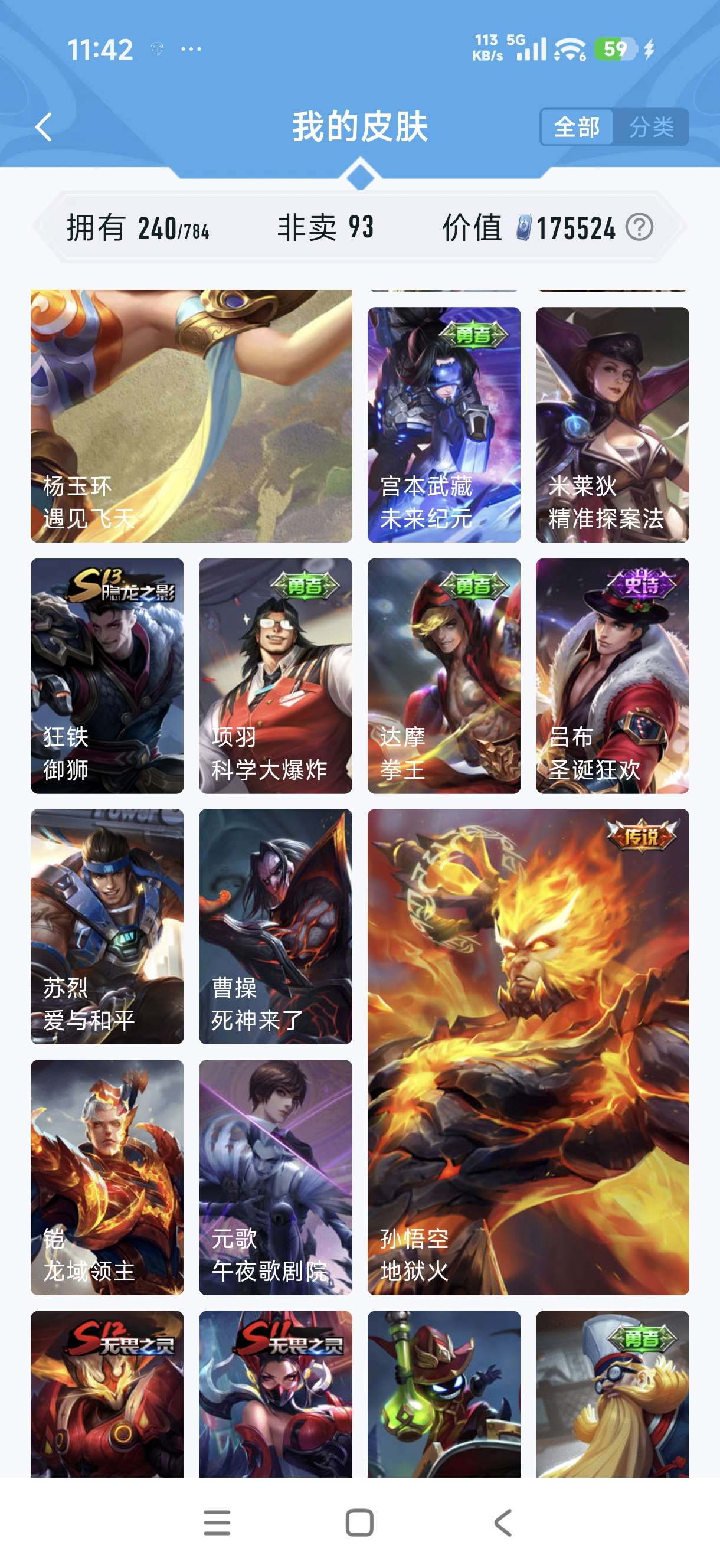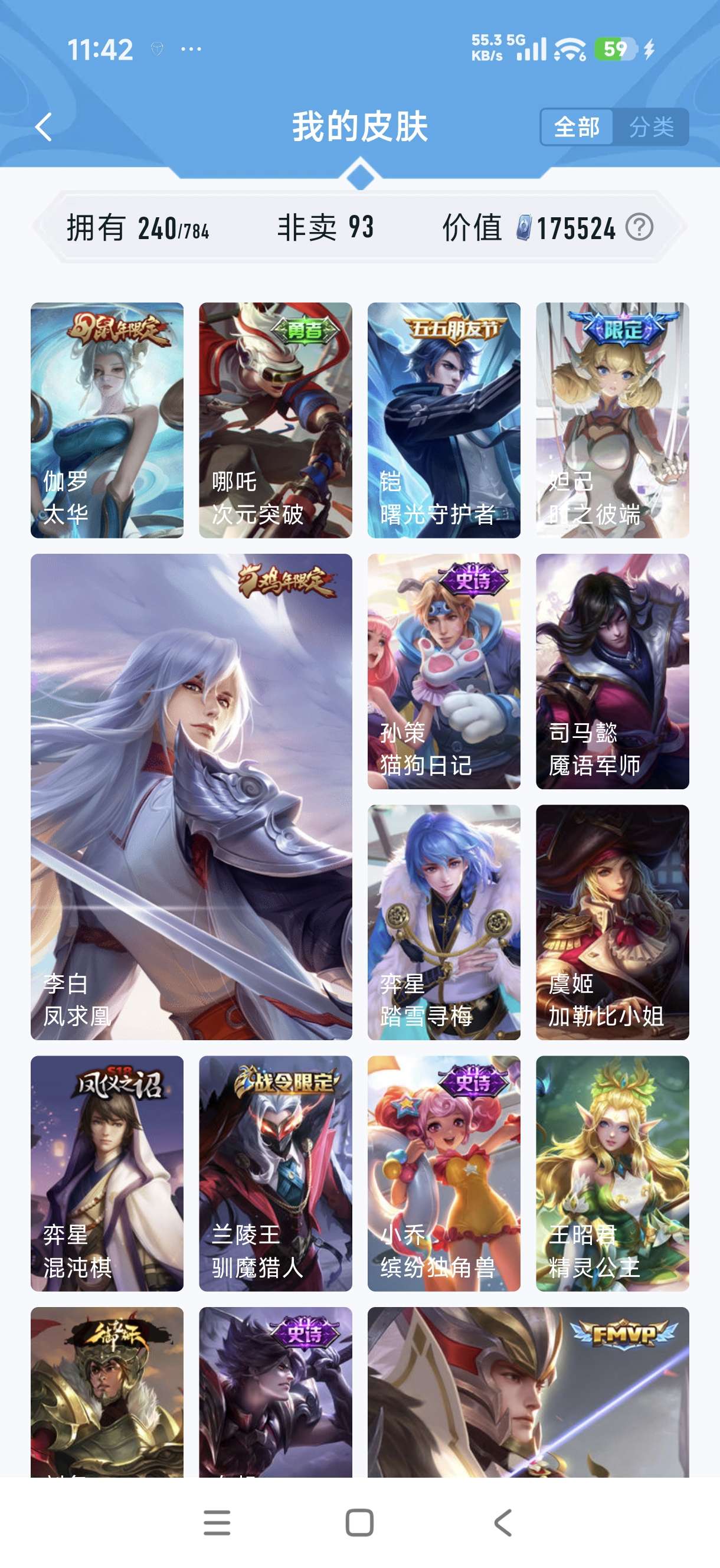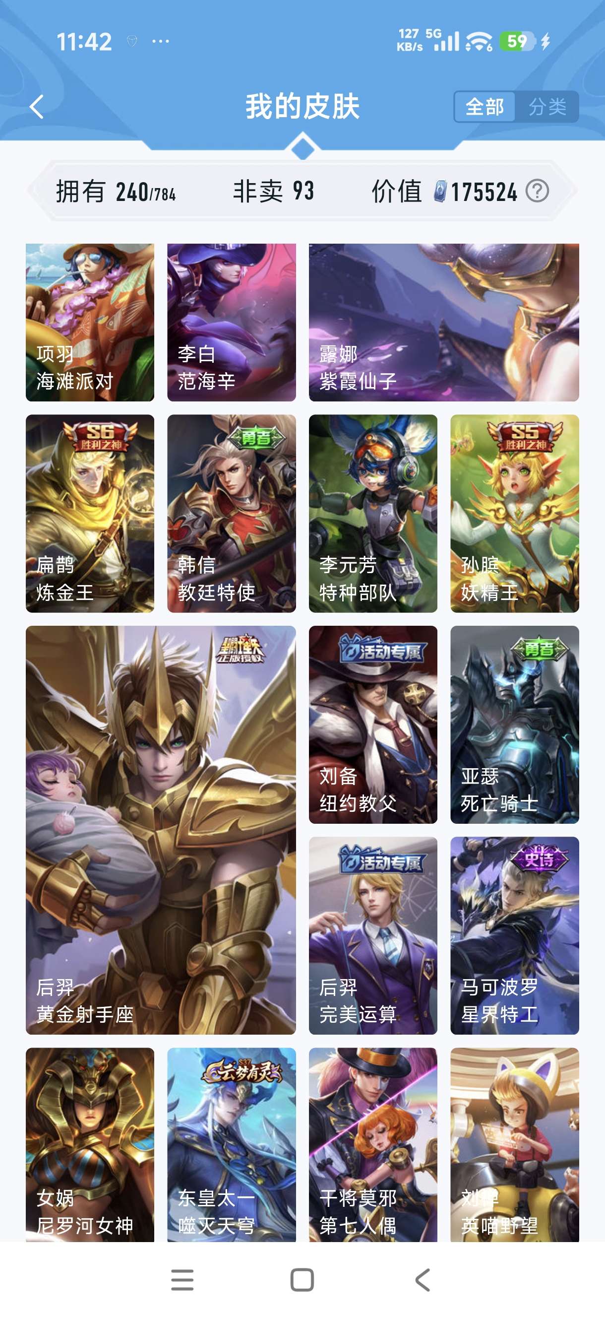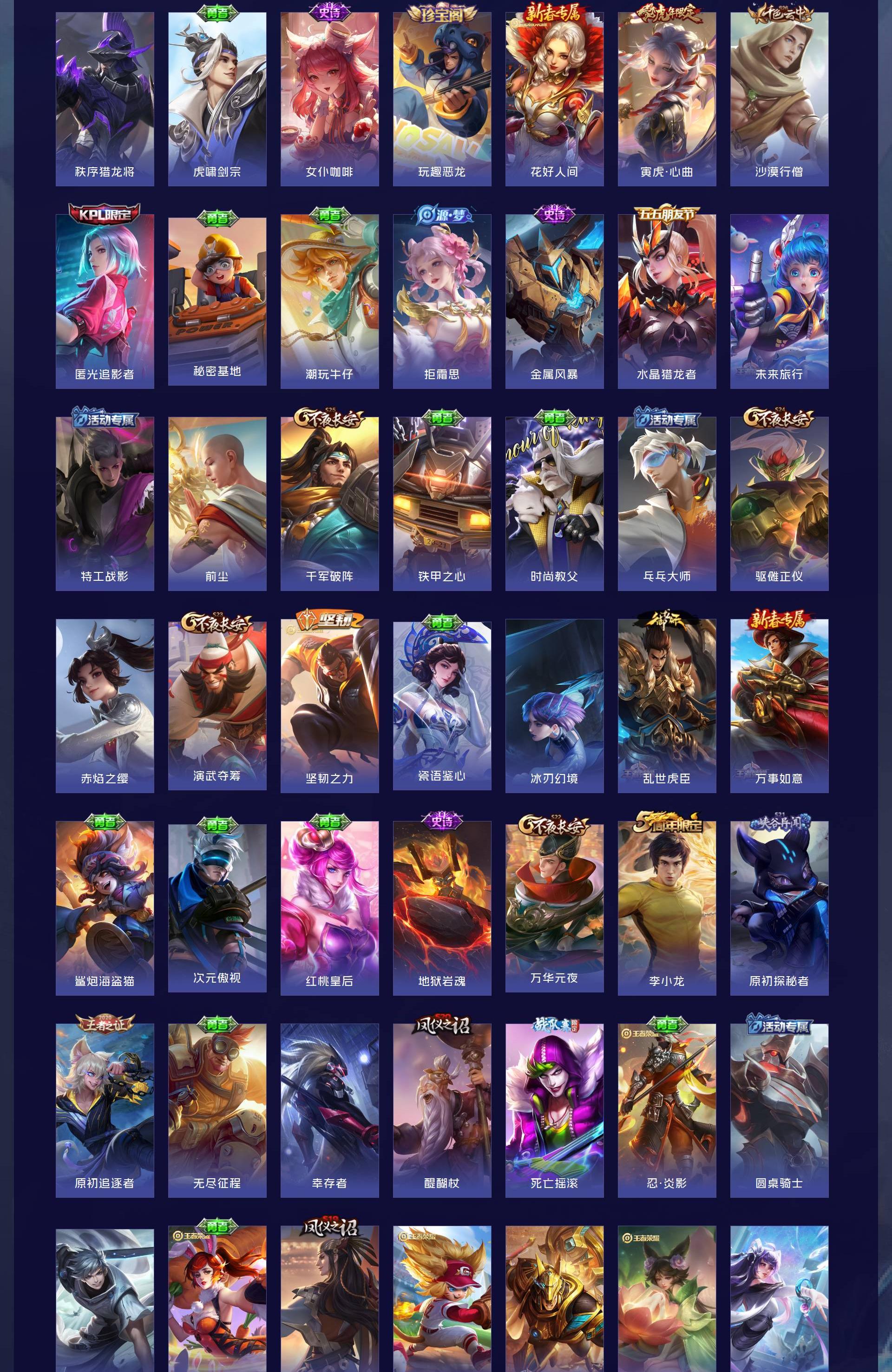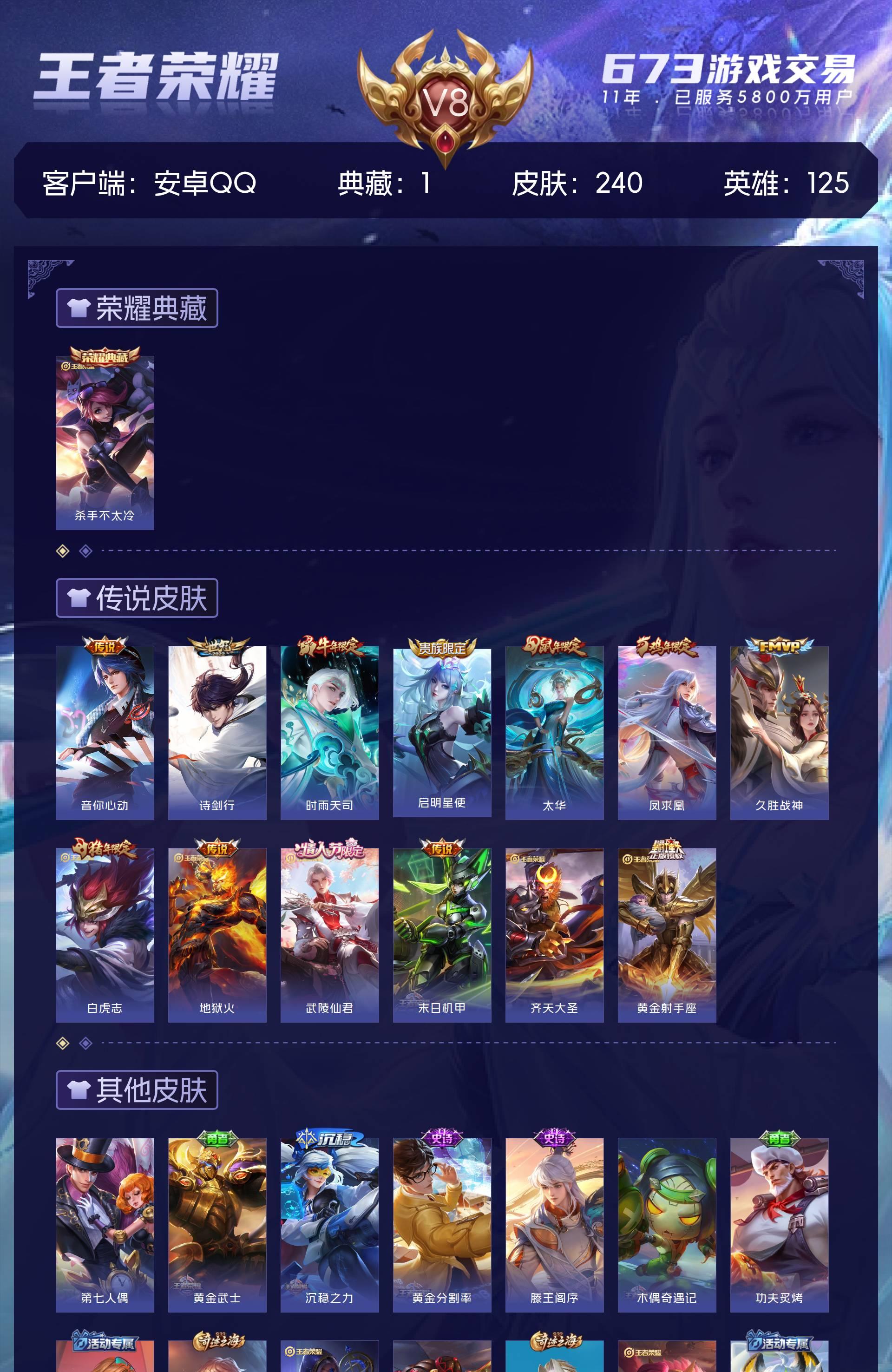 V8 皮肤240 英雄125 荣耀黄金 荣耀典藏1 星传说22 传说13 其他皮肤233